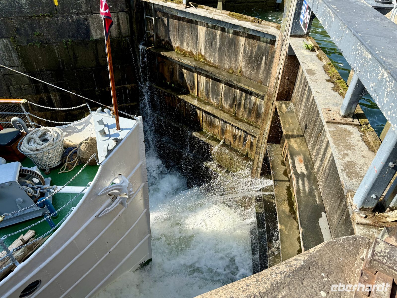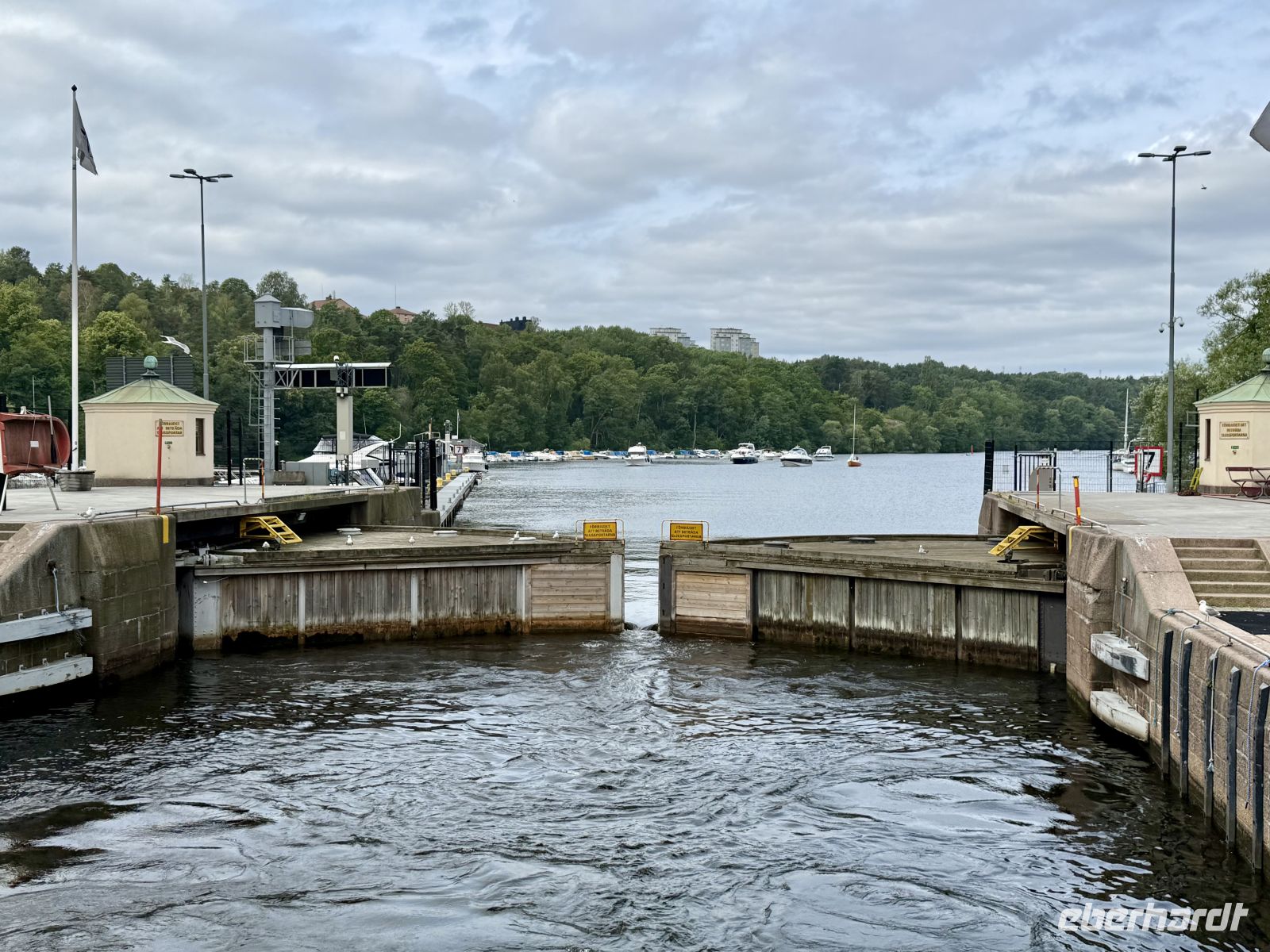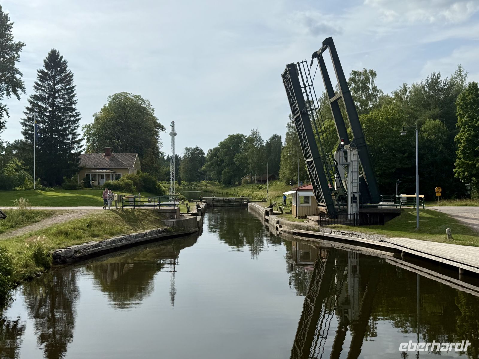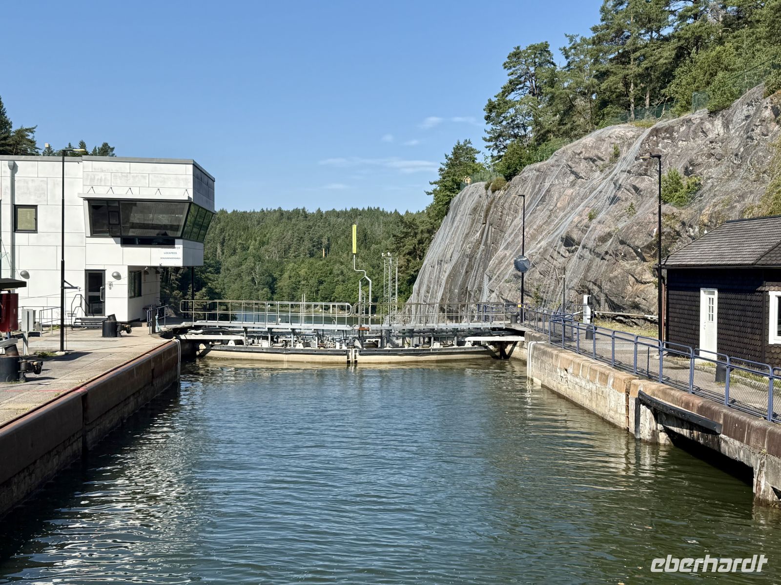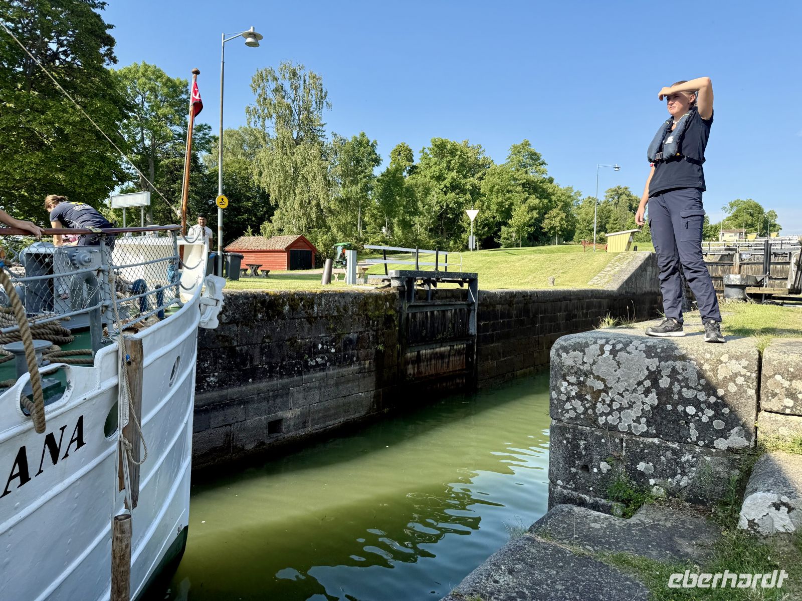 Gegen Mittag erreichten wir in Lilla Edet die letzte Schleuse unserer Reise. Diese Schleuse ist zugleich die älteste noch betriebene am Göta älv, ursprünglich im Jahr 1607 erbaut – ein bedeutender Moment für unsere Fahrt, denn damit endete auch symbolisch unsere Passage durch Schwedens historische Wasserwege.