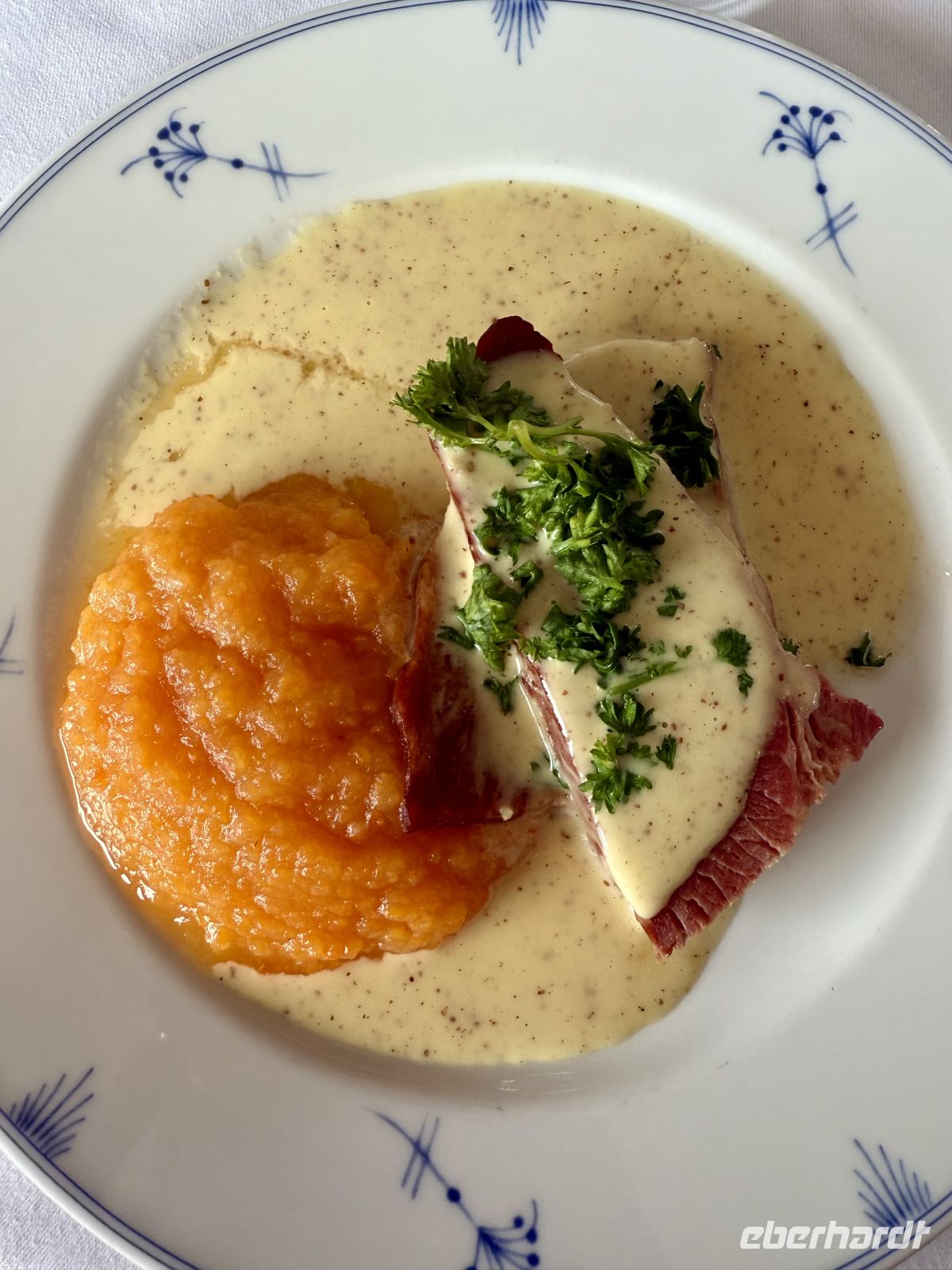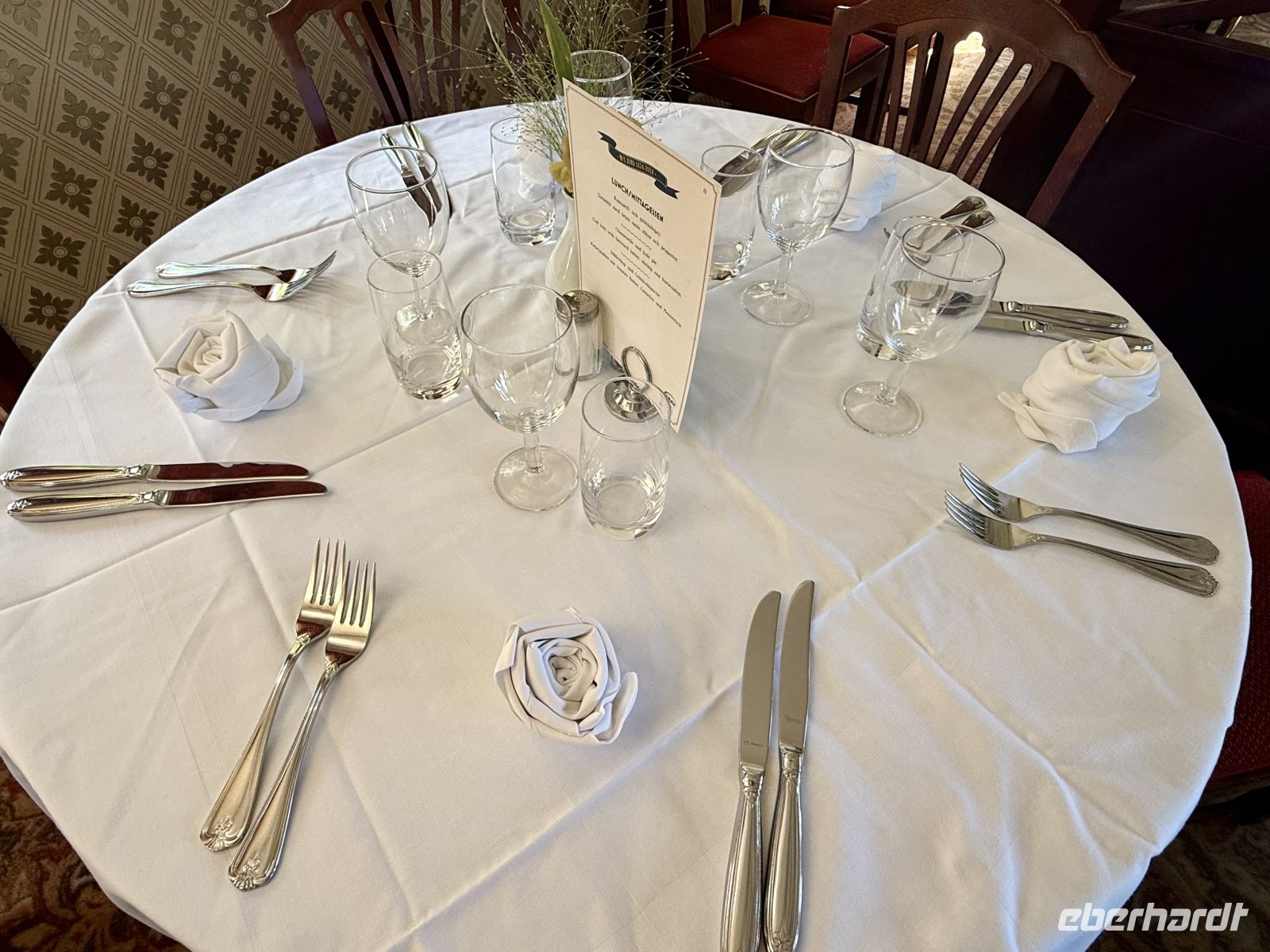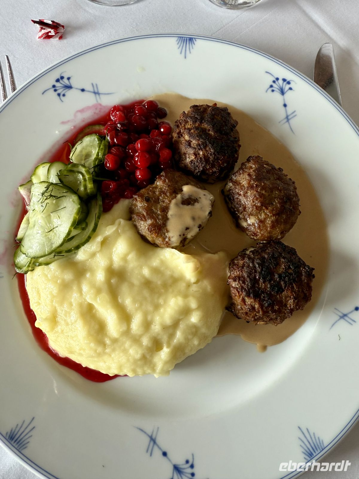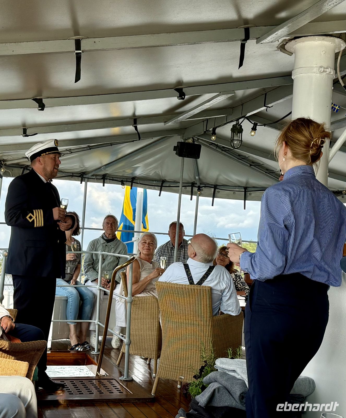 An Bord wurden wir anschließend mit einem Begrüßungssekt empfangen. Selbst der Kapitän ließ es sich nicht nehmen, auf eine gelungene Reise mit uns anzustoßen. Die Vorfreude auf die kommenden Tage und vor allem auf die Fahrt durch den berühmten Göta-Kanal war bei allen Gästen spürbar. Den Tag rundete ein festliches Abendessen im stilvollen Speisesaal der MS Diana ab – die Küche überzeugte erneut mit Geschmack, Qualität und Präsentation.