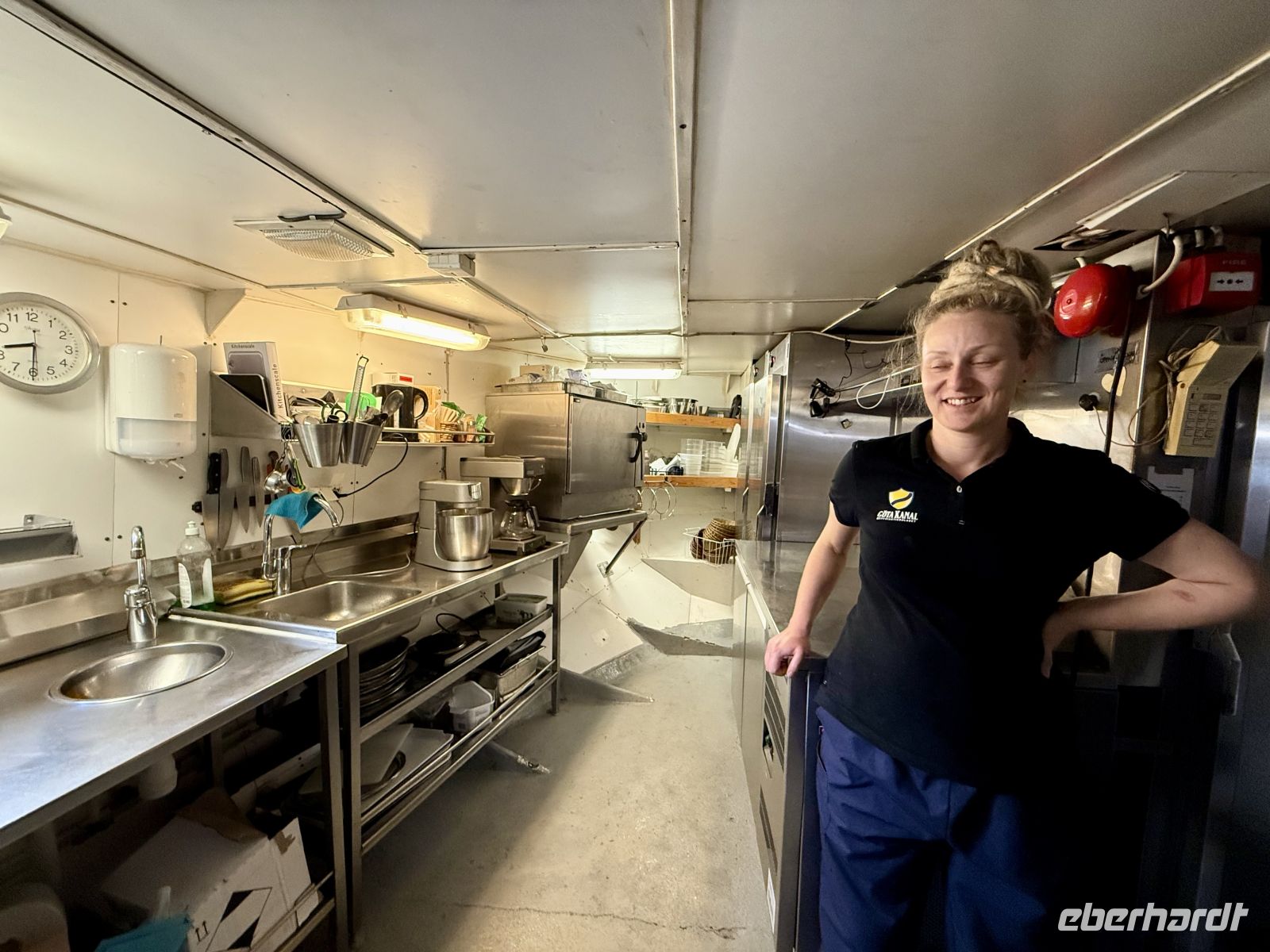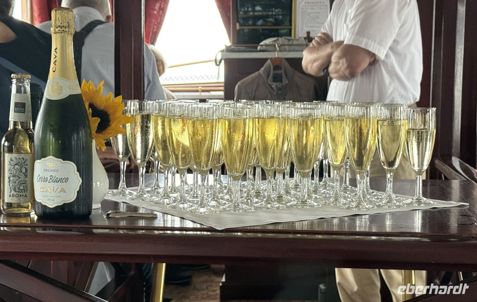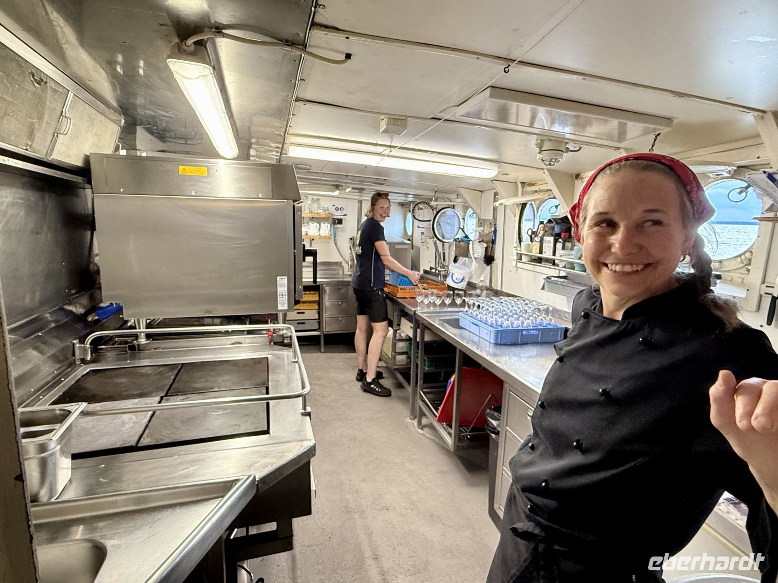 Bevor es zum Abendessen ging, lud die Crew zu einem kleinen Abschiedsumtrunk ein. Bei einem Glas Sekt stießen wir gemeinsam auf die Erlebnisse der letzten Tage an. Nach dem Abendessen nahmen wir uns noch einmal Zeit, um der gesamten Crew für ihre herzliche Betreuung, die hervorragende Organisation und die ausgezeichnete Bewirtung zu danken – ein wirklich aufmerksames, professionelles Team, das diese Reise so besonders gemacht hat. Als besonderes Highlight durften wir sogar einen Blick in die Küche werfen und erfuhren mehr über die Abläufe an Bord und die Entstehung der täglich frisch zubereiteten Gerichte.