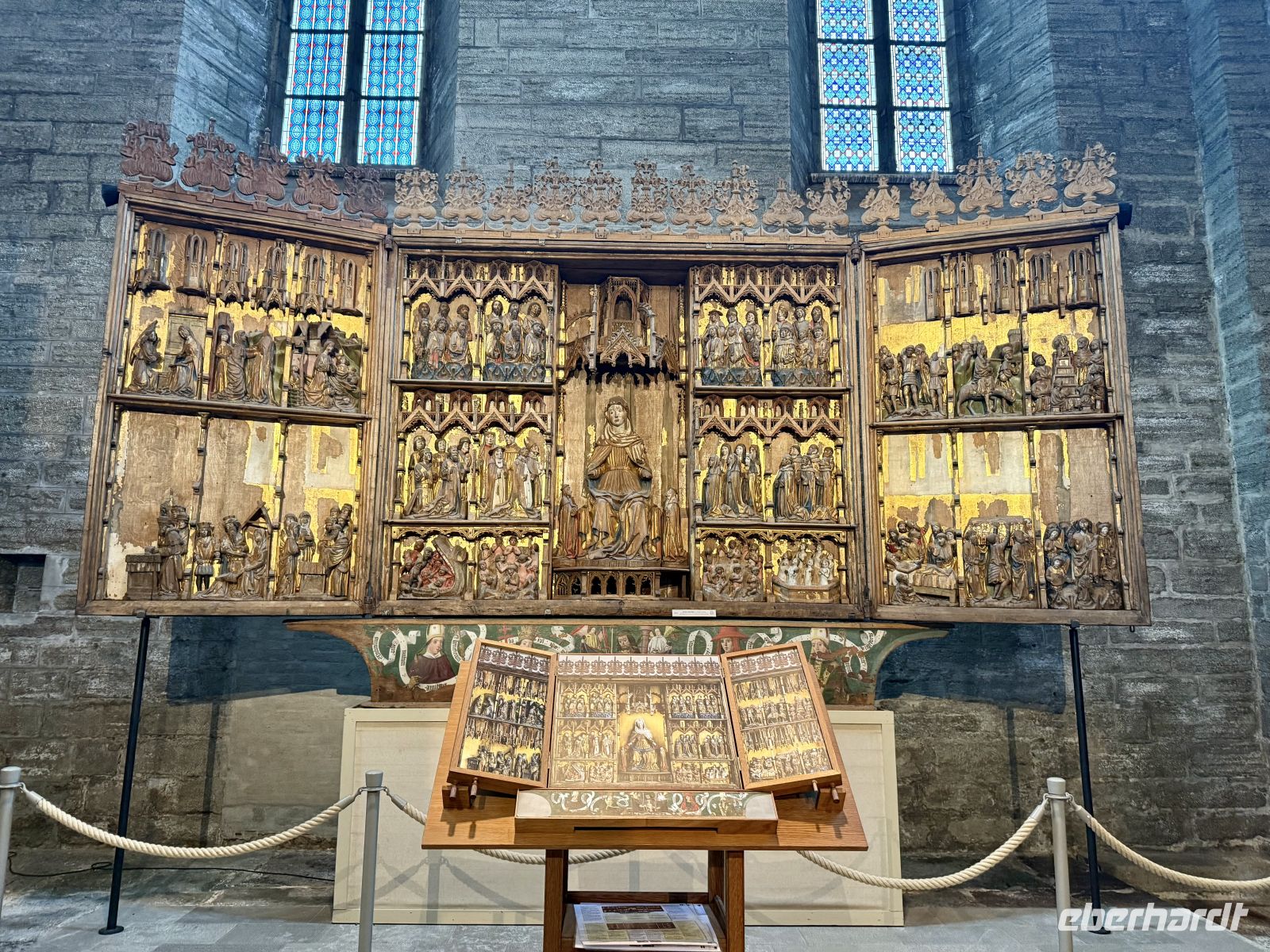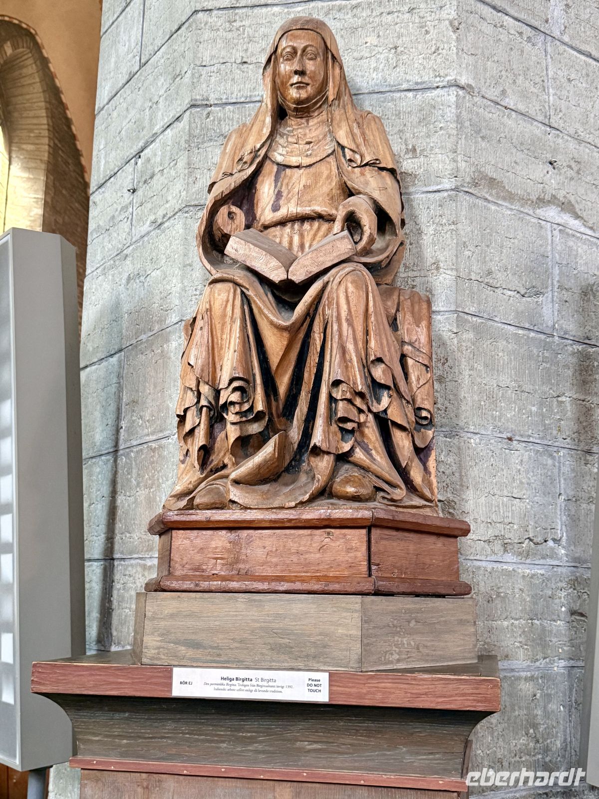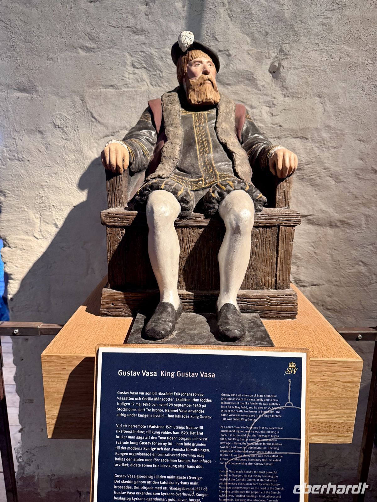 Wenig später erreichten wir die historische Stadt Vadstena, idyllisch am Westufer des Vätternsees gelegen. Vadstena ist vor allem bekannt durch die heilige Birgitta von Schweden, die im 14. Jahrhundert das gleichnamige Kloster Vadstena gründete. Die Heilige Birgitta von Schweden (1303–1373) war eine der bedeutendsten Mystikerinnen und Visionärinnen des Mittelalters. Sie stammte aus einer adeligen schwedischen Familie und widmete ihr Leben nach dem Tod ihres Mannes ganz dem Glauben. Im Jahr 1346 gründete sie das Kloster Vadstena und den Birgittenorden, der sich durch eine strenge klösterliche Lebensweise und tiefes soziales Engagement auszeichnete. Ihre Visionen und Offenbarungen hatten europaweiten Einfluss, und sie wurde 1391 heiliggesprochen. Heute gilt sie als eine der Schutzheiligen Europas und als herausragende Figur der schwedischen Geschichte. Das ehemalige Klostergebäude, heute Museum, vermittelt eindrucksvoll die spirituelle und kulturelle Bedeutung des Ortes im Mittelalter. Anschließend besichtigten wir auch das imposante Renaissanceschloss Vadstena, das einst von König Gustav Wasa in Auftrag gegeben wurde und heute als Museum dient. König Gustav Wasa (1496–1560), auch bekannt als Gustav I. Wasa, war der Begründer der modernen schwedischen Monarchie. Er führte Schweden in die Unabhängigkeit von Dänemark nach dem Ende der Kalmarer Union und wurde 1523 zum König gewählt. Unter seiner Herrschaft leitete er tiefgreifende Reformen ein, darunter die Einführung der Reformation in Schweden. Als Bauherr ließ er das Schloss Vadstena im 16. Jahrhundert ausbauen, das ursprünglich als Kloster gegründet worden war. Heute ist das Schloss ein bedeutendes Beispiel für schwedische Renaissancearchitektur und ein Symbol für die Macht und den Einfluss Gustav Wasas. Den Transfer in die Altstadt und zurück legten wir ganz gemütlich mit einem kleinen Bähnchen zurück.