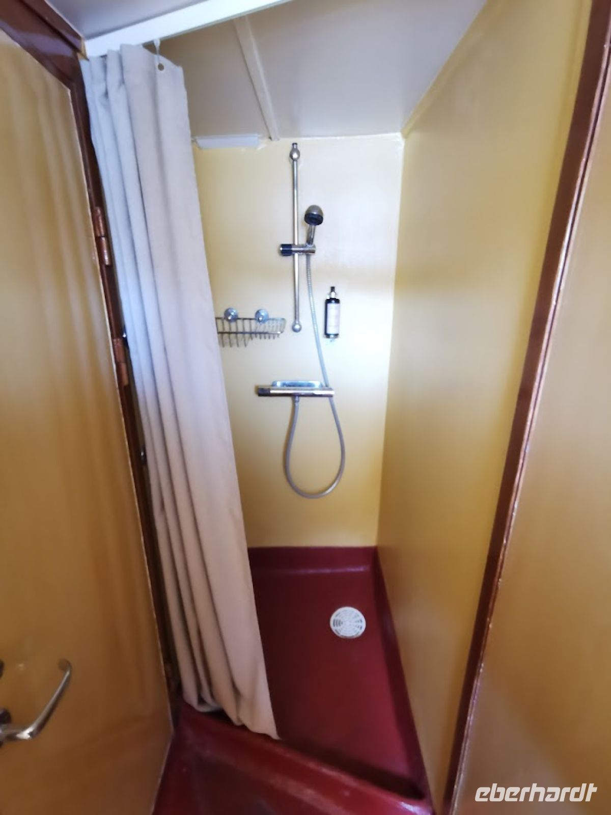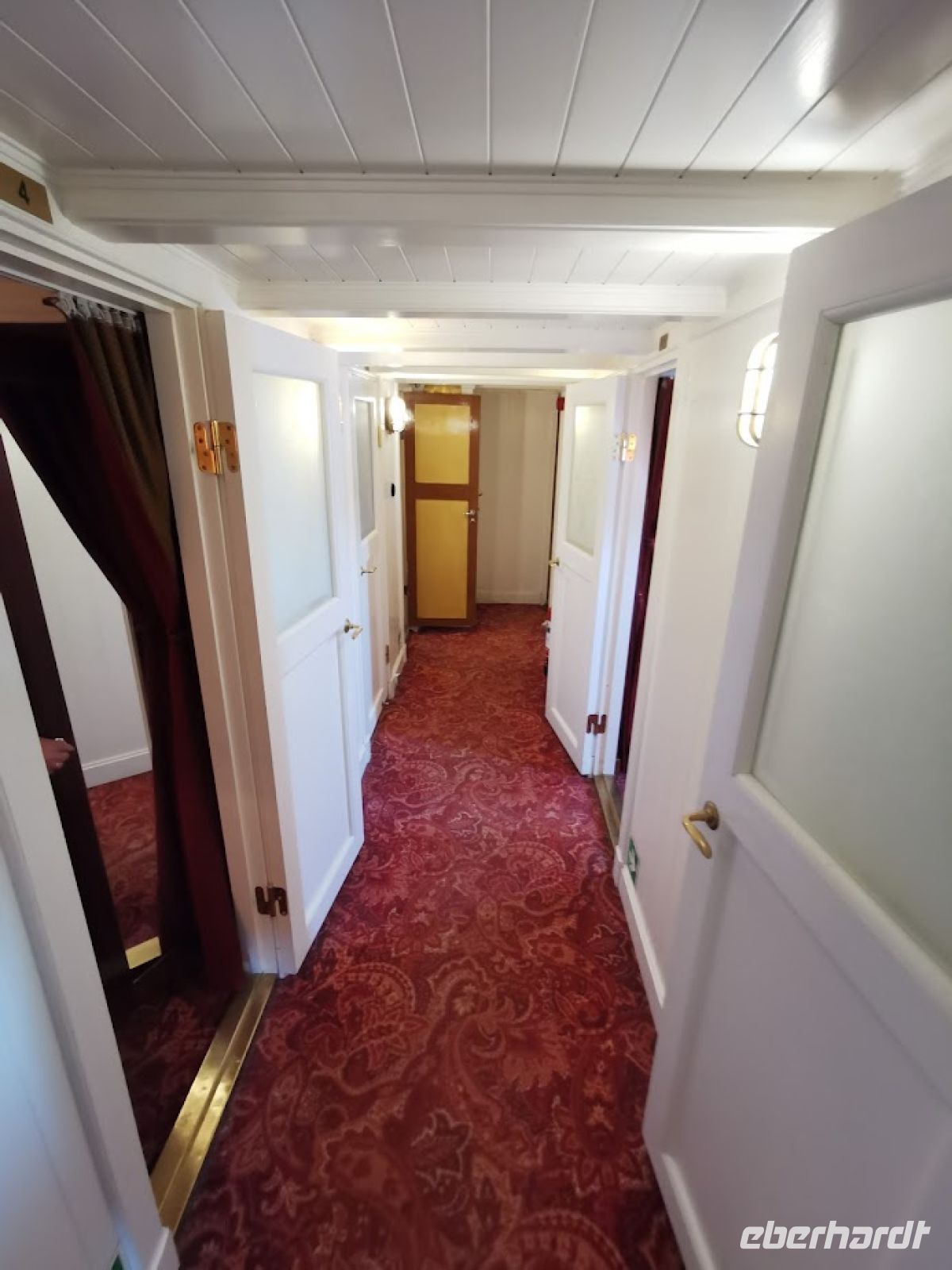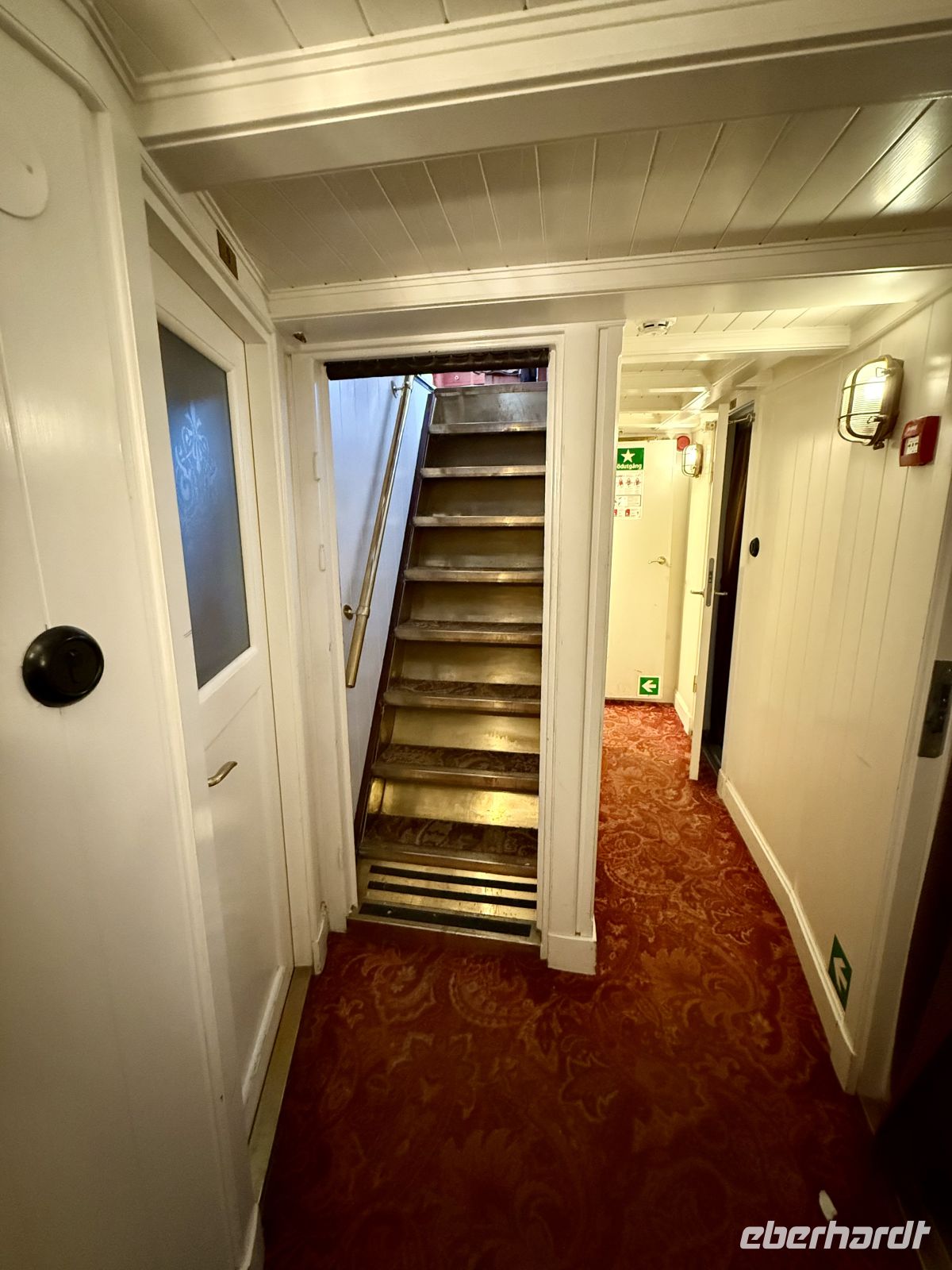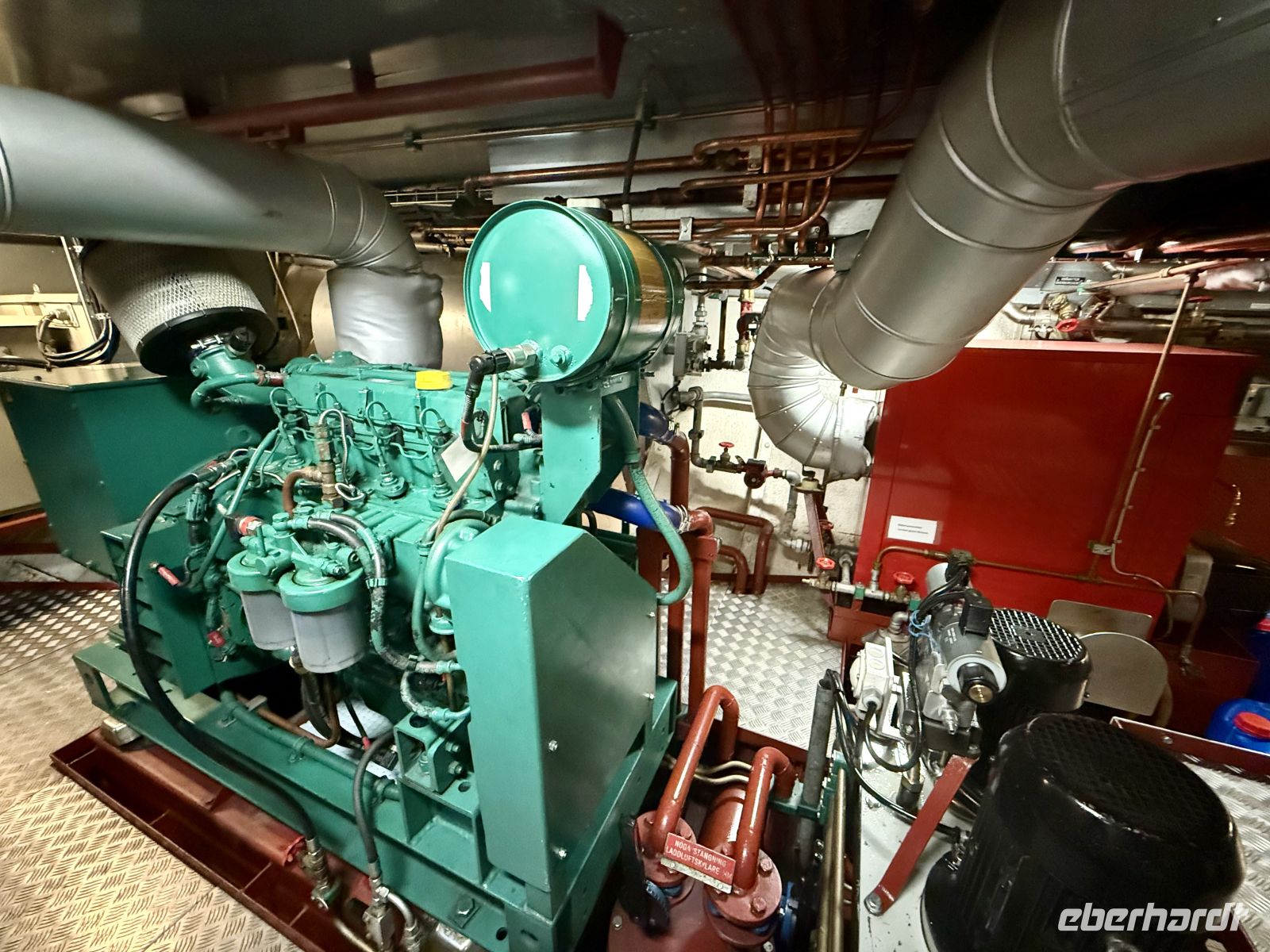 Nach dem Abendessen erhielten wir noch einen spannenden Einblick in den Maschinenraum der MS Diana. Das Schiff verfügt über zwei Motoren mit jeweils 300 PS, also insgesamt 600 PS, die für eine ruhige und kraftvolle Fahrt sorgen. Für die Stromversorgung sind zwei Generatoren installiert, von denen jeweils nur einer im Betrieb ist. Besonders interessant: Das Schiff arbeitet mit einem geschlossenen Kühlsystem, da das Kanalwasser nicht sauber genug ist, um direkt zur Kühlung genutzt zu werden. Die MS Diana ist 32 Meter lang und 6,7 Meter breit, was sie besonders wendig und geeignet für die engen Schleusen des Göta-Kanals macht. Das Schiff verfügt über 26 komfortable Kabinen. Die Motoren der MS Diana sind dieselbetrieben und wurden mehrfach modernisiert, um den heutigen Umweltstandards zu entsprechen. Sie ermöglichen eine maximale Geschwindigkeit von etwa 12 Knoten. Trotz ihres historischen Designs verfügt das Schiff über moderne Navigations- und Sicherheitssysteme, die eine sichere und angenehme Fahrt gewährleisten. Die MS Diana ist somit nicht nur ein historisches, sondern auch technisch gut ausgestattetes Schiff, das Komfort und Tradition auf ideale Weise vereint.