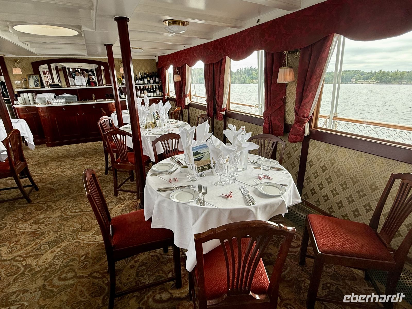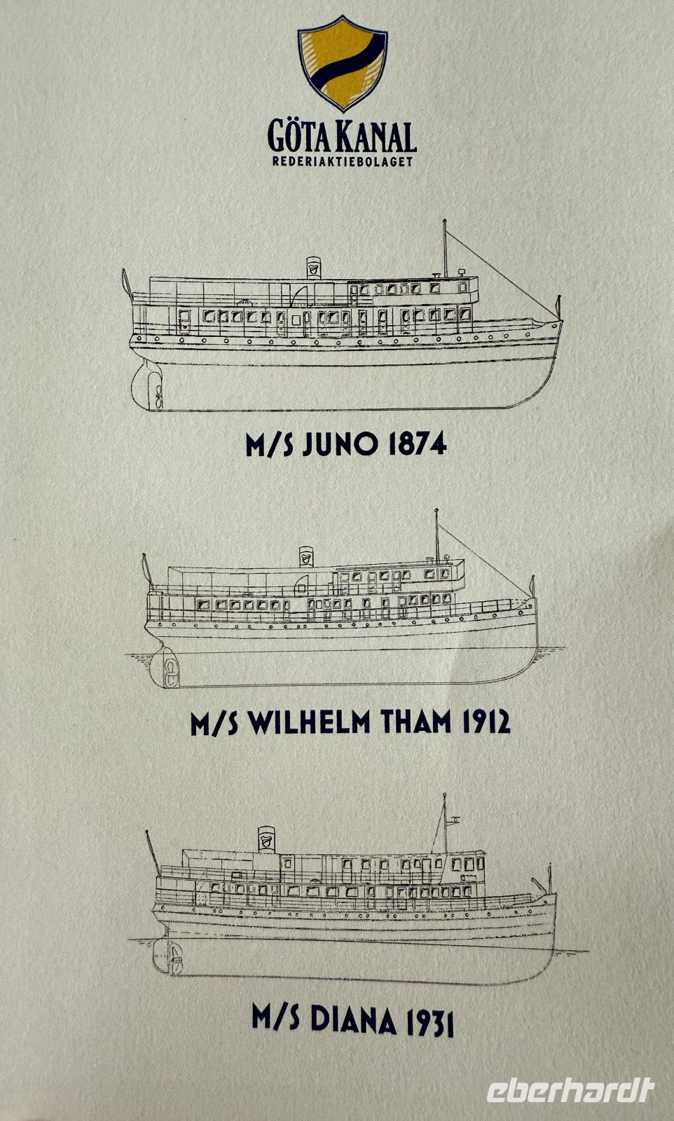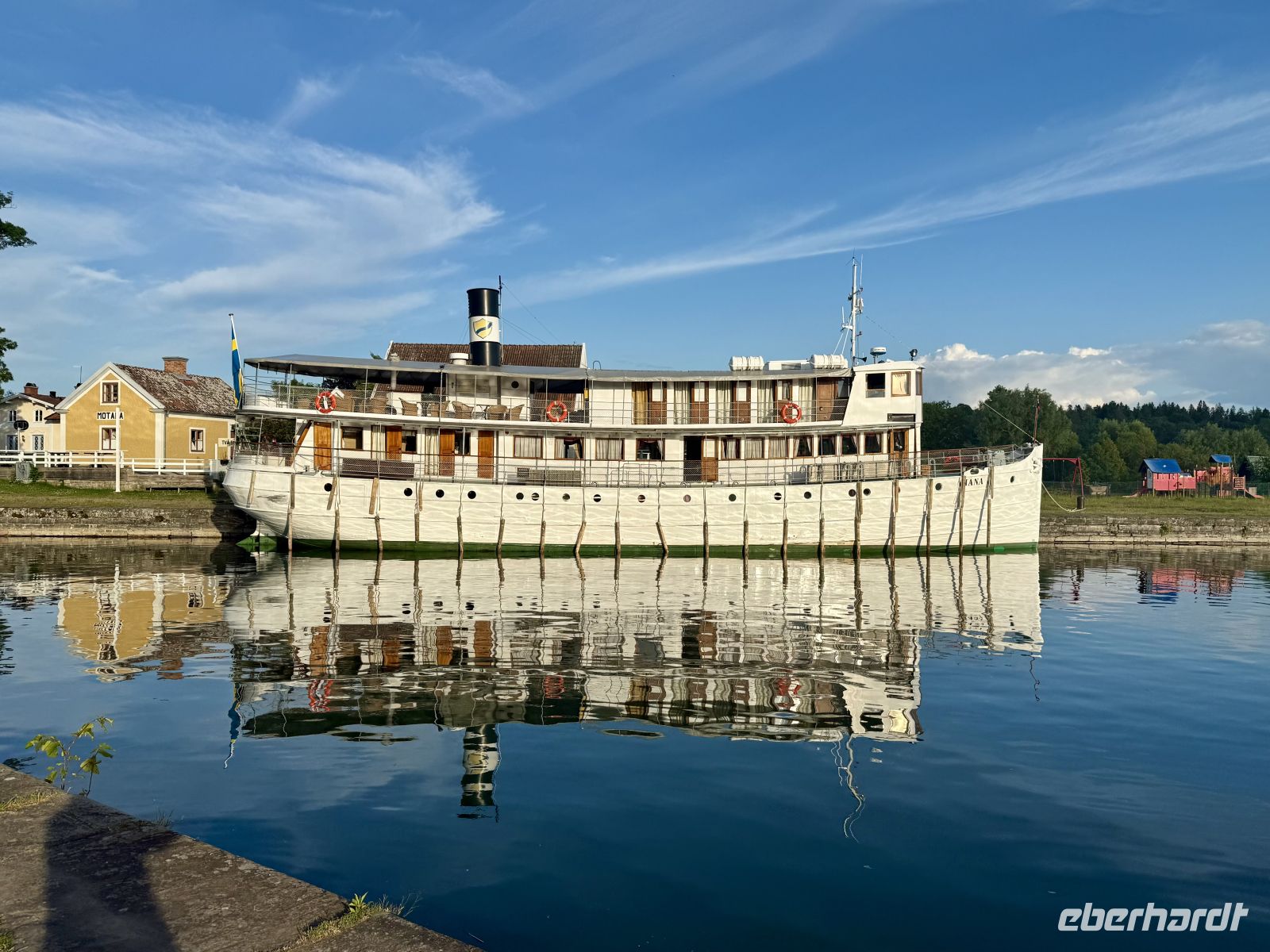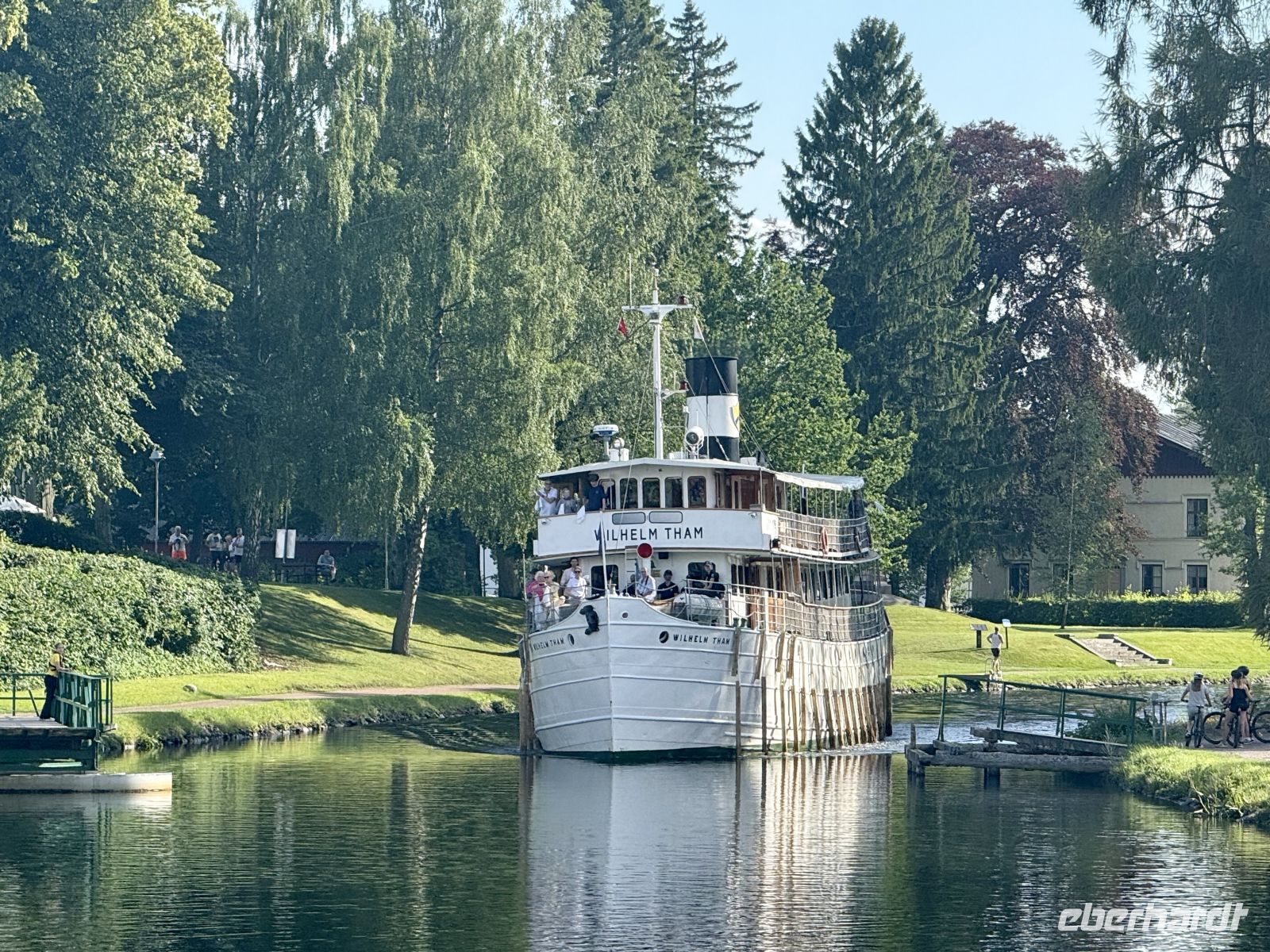 Vor dem Abendessen trafen wir noch auf das Schwesterschiff Wilhelm Tham, ein historisches Passagierschiff, das ebenfalls regelmäßig auf dem Göta-Kanal verkehrt. Die Wilhelm Tham wurde 1912 gebaut und beeindruckt mit ihrem klassischen Design sowie einer liebevoll erhaltenen Innenausstattung.