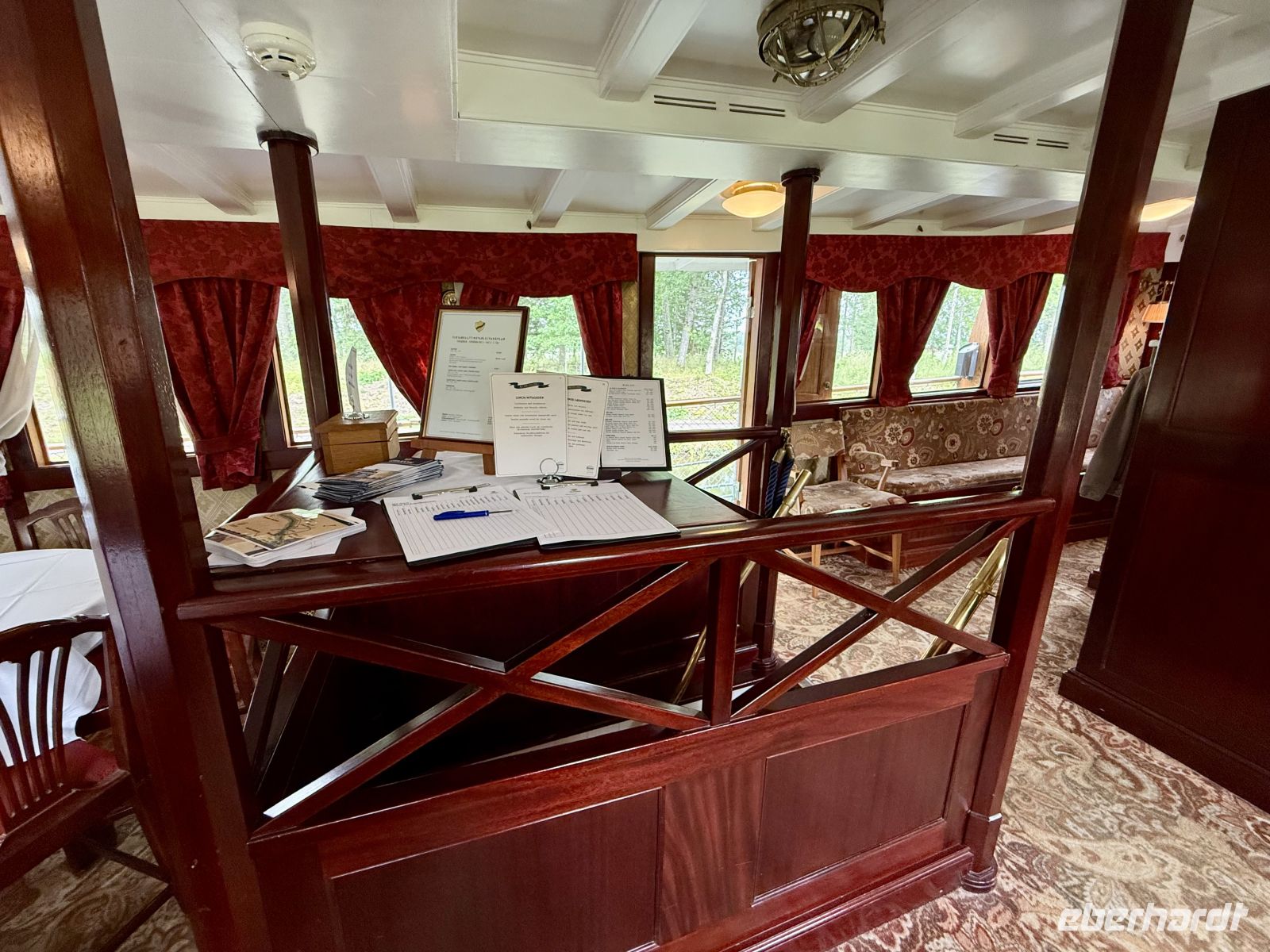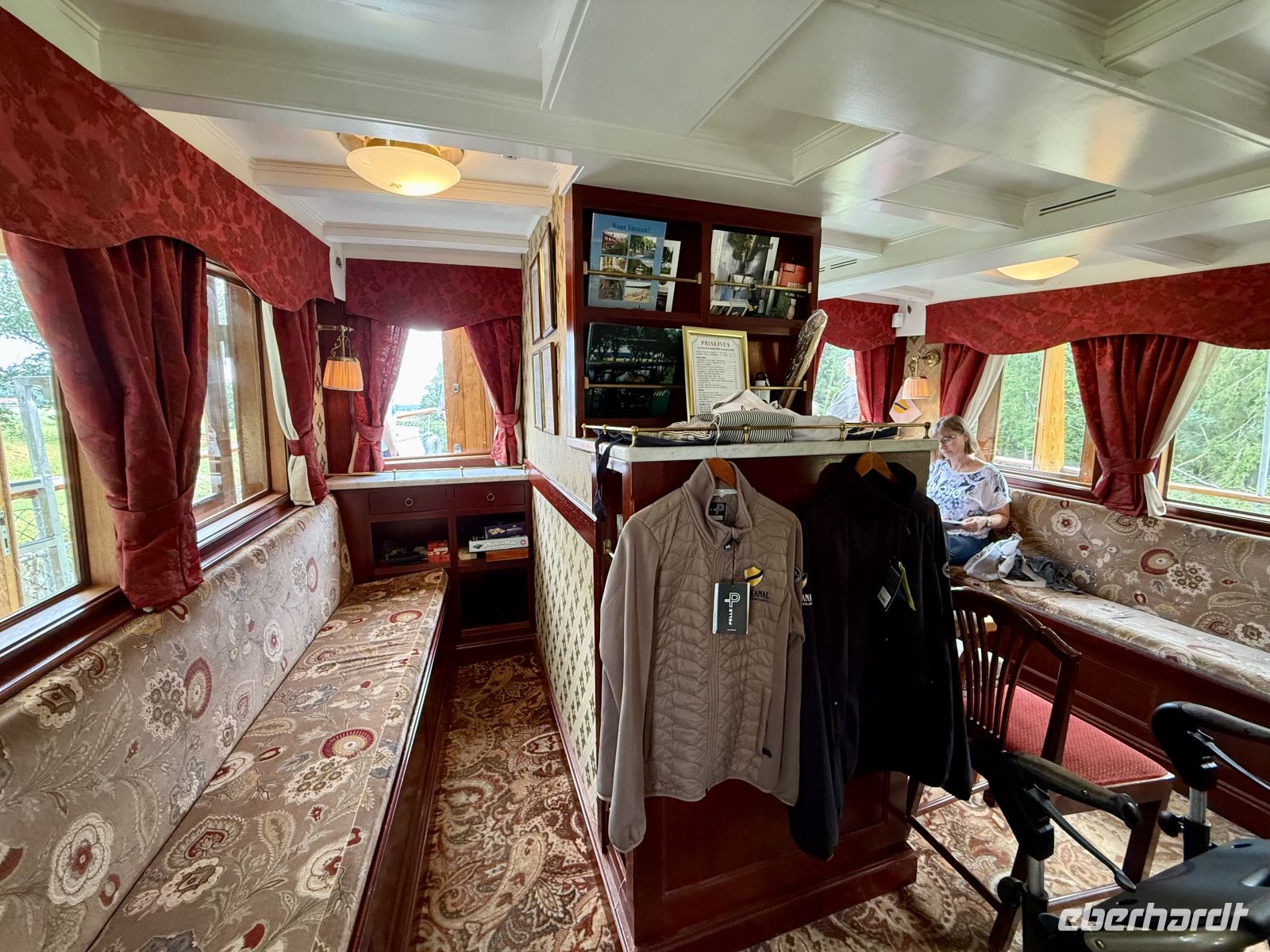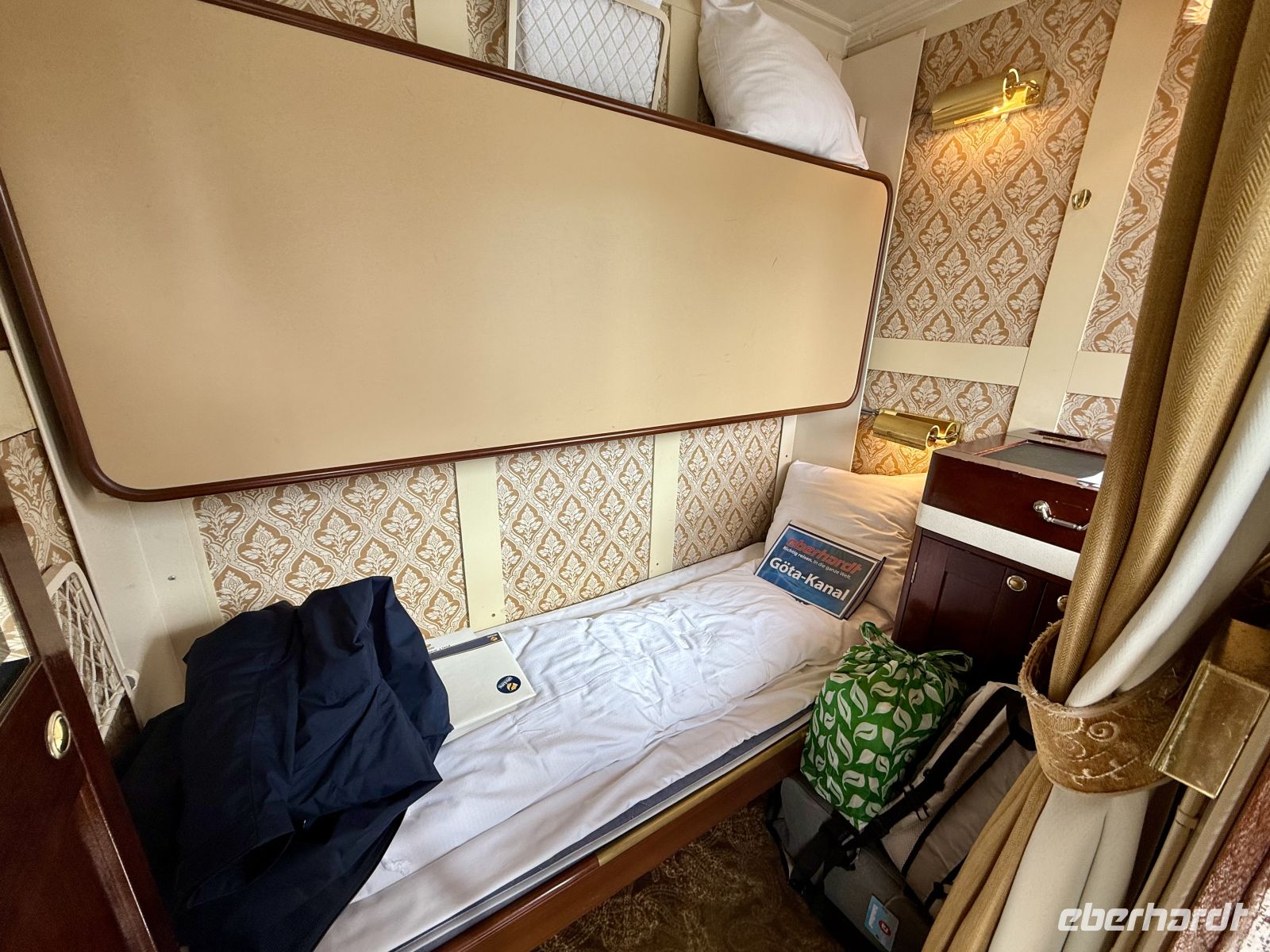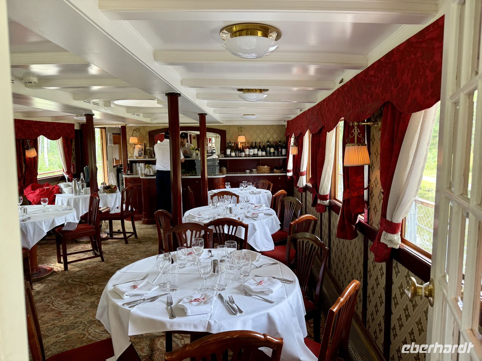 Vor dem Abendessen trafen wir noch auf das Schwesterschiff Wilhelm Tham, ein historisches Passagierschiff, das ebenfalls regelmäßig auf dem Göta-Kanal verkehrt. Die Wilhelm Tham wurde 1912 gebaut und beeindruckt mit ihrem klassischen Design sowie einer liebevoll erhaltenen Innenausstattung.