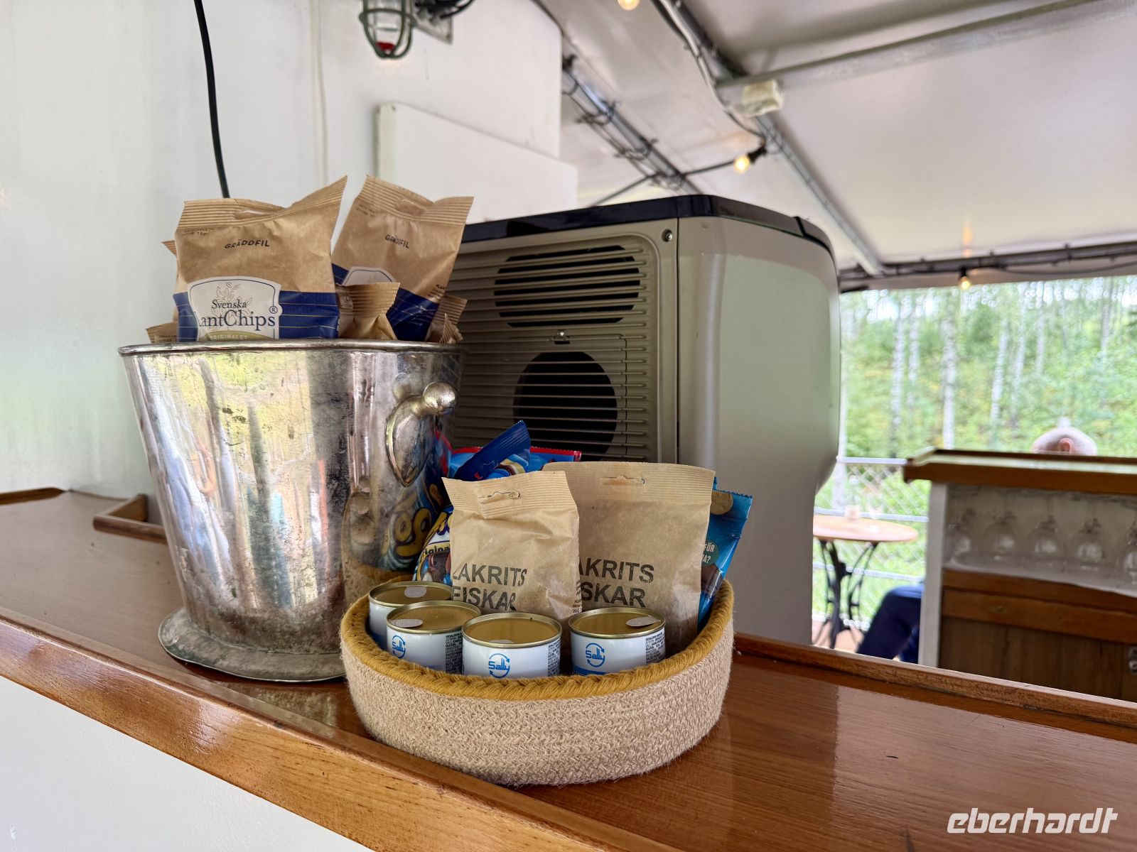 Zurück an Bord erwartete uns bereits das Mittagessen – heute stilecht mit einer Scheibe Knäckebrot und einem Gläschen schwedischem Schnaps (Aquavit), wie es in Schweden zu besonderen Anlässen gern serviert wird.