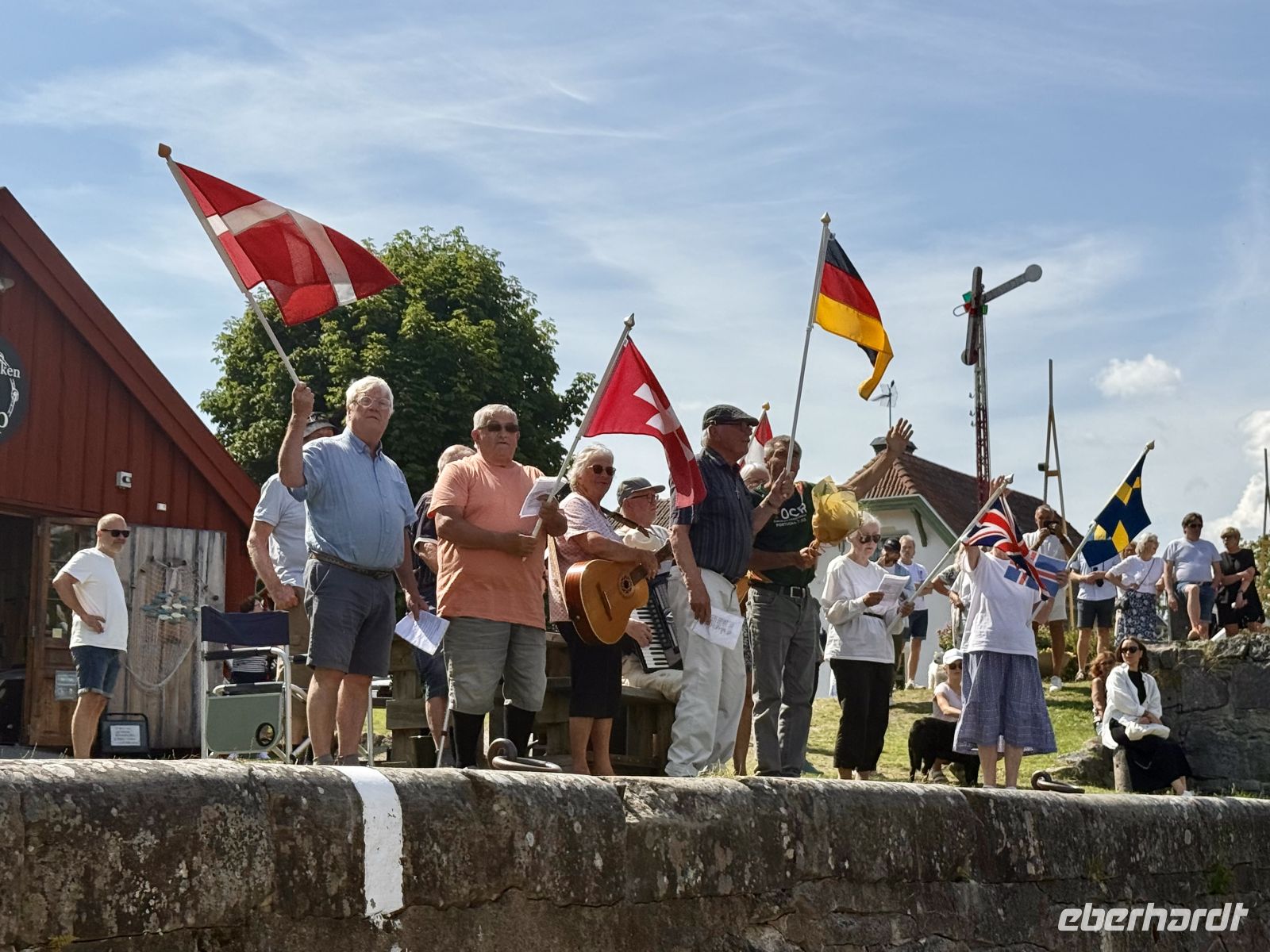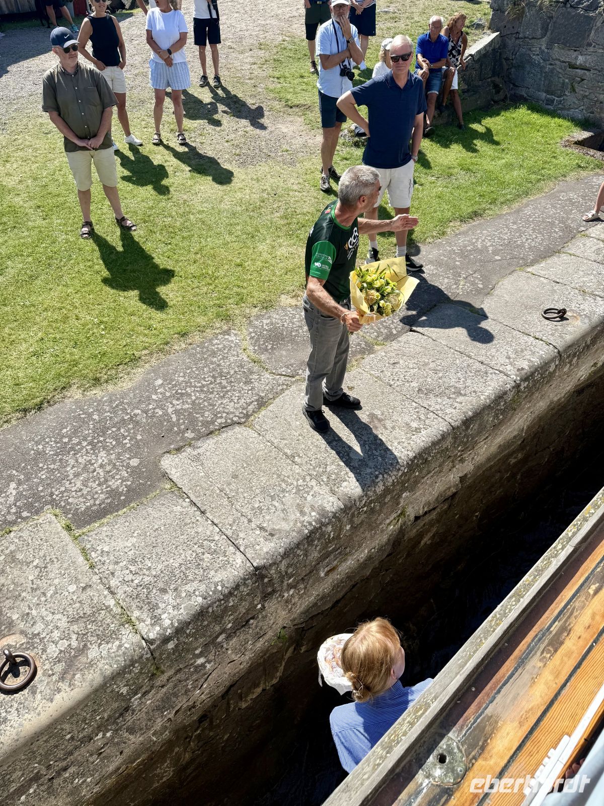 Ein besonders emotionaler Moment folgte an der historischen Schleuse von Forsvik, der ältesten Schleuse des Göta-Kanals, erbaut im Jahr 1813. Dort wurden wir herzlich von einer örtlichen Familie begrüßt, die uns mit Gesang und einem traditionellen Segensspruch willkommen hieß – ein berührender Brauch, der hier seit 1923 gepflegt wird. Als Zeichen der Wertschätzung überreichte unsere Crew der Familie einen Kuchen, und im Gegenzug erhielt die Crew einen liebevoll gebundenen Blumenstrauß – ein schöner Ausdruck gegenseitiger Wertschätzung und Gastfreundschaft.
