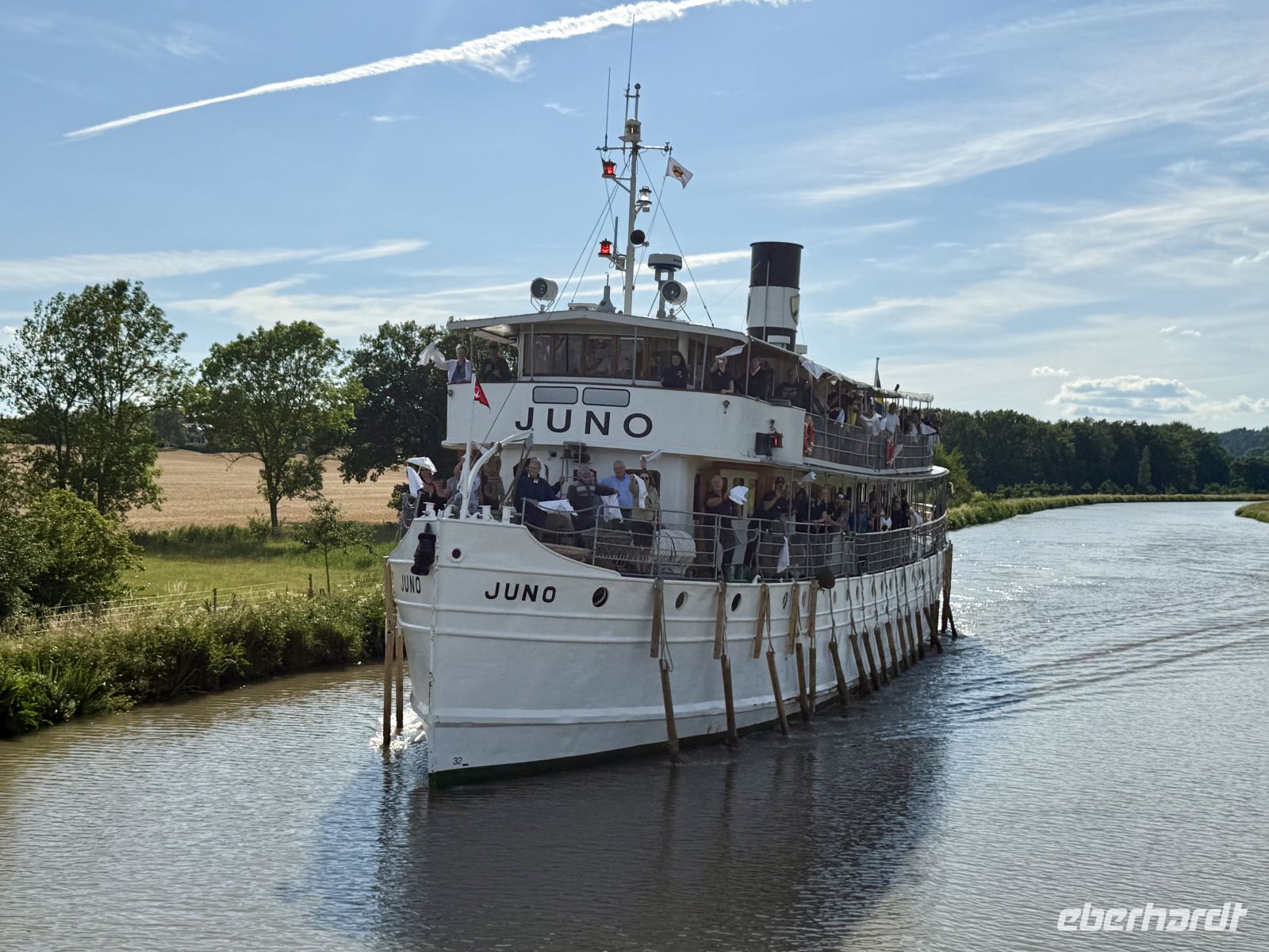 Vor dem Abendessen trafen wir auf das Schwesterschiff MS Juno. Die MS Juno ist das älteste noch in Betrieb befindliche Passagierschiff der Welt und wurde bereits 1874 gebaut. Sie verkehrt seit über einem Jahrhundert auf dem Göta-Kanal und beeindruckt durch ihr klassisches Dampfschiff-Design und einem eleganten, historischen Interieur. Mit weißen Servietten winkten wir den Gästen zu und ließen dabei laut die Hymne der MS Diana erklingen, was für eine festliche und stimmungsvolle Atmosphäre sorgte.