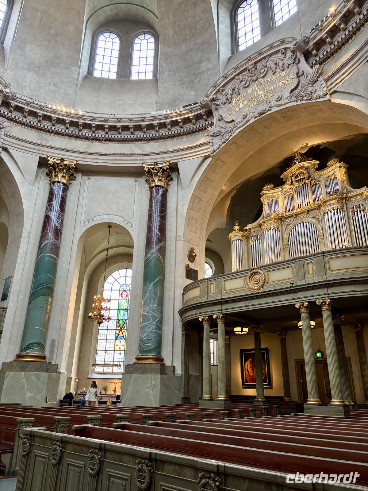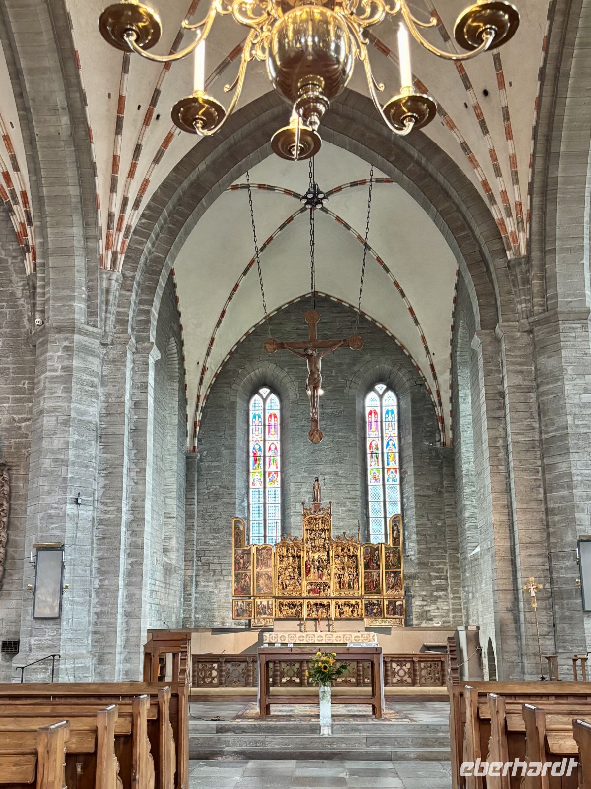 Pünktlich um 9:00 Uhr treffen wir unseren örtlichen Reiseführer Jan. In seiner ruhigen und freundlichen Art führt er uns durch Göteborg und erzählt Spannendes über die Lebensverhältnisse in der Hafenstadt. Bequem im Bus fahren wir hinauf zur Masthuggskirche. Sie thront auf einem Hügel und wurde 1914 im nationalromantischen Stil erbaut. Ihr Inneres überrascht uns mit einem Dach, das wie ein umgedrehtes Wikingerschiff wirkt. Der Ausblick über Stadt, Hafen und Schären ist beeindruckend.
