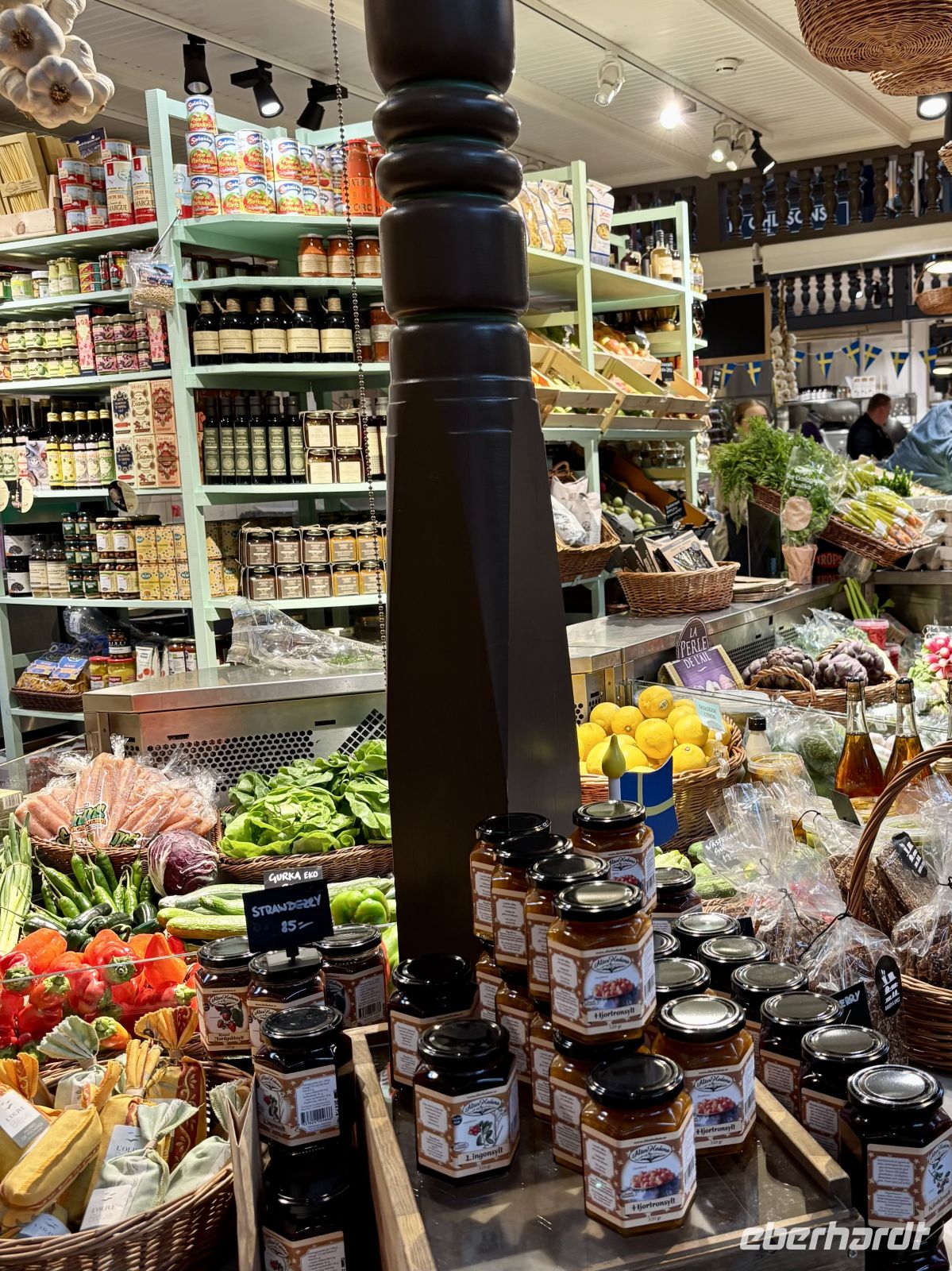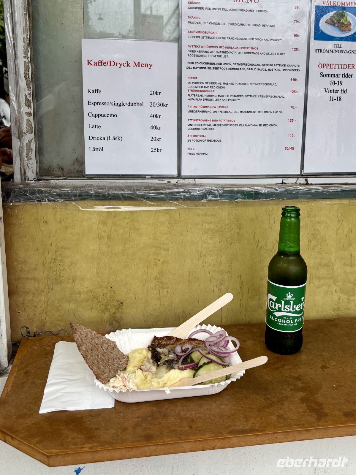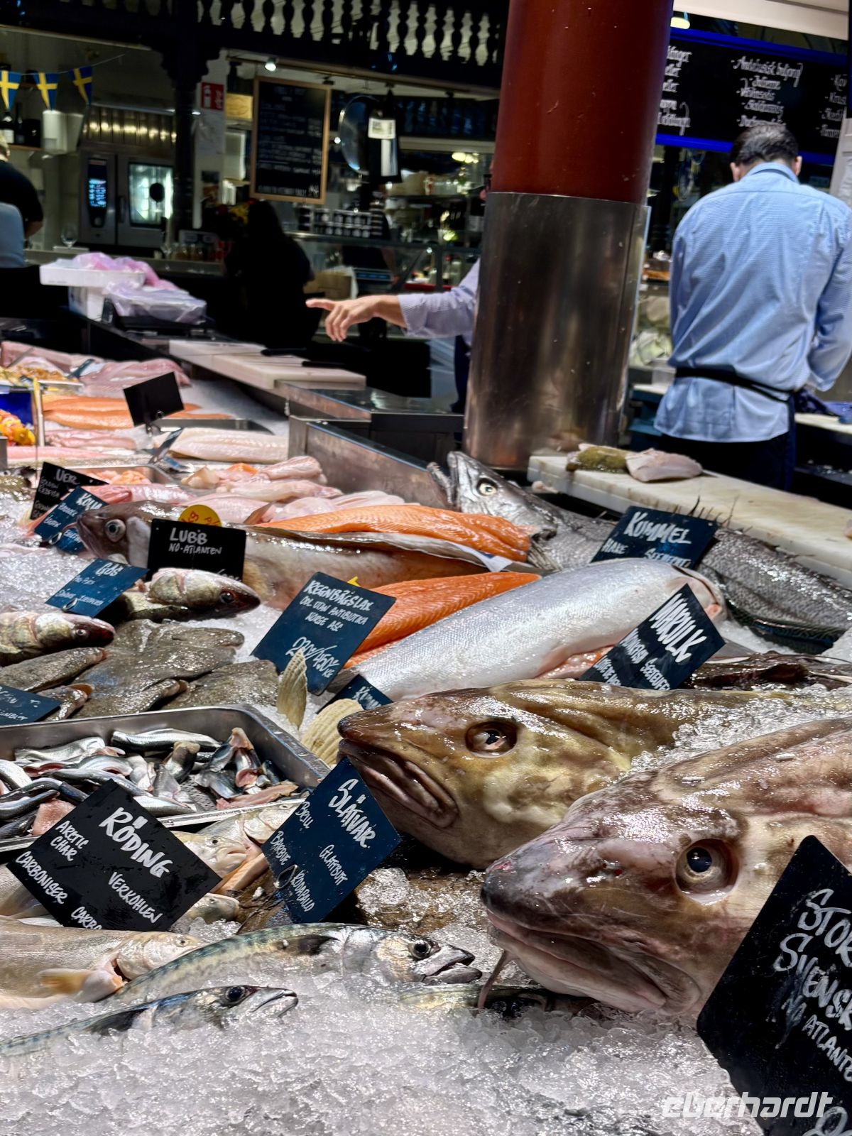 Zurück im Bus geht es weiter durch die verschiedenen Stadtteile bis zu einem Aussichtspunkt mit perfektem Fotostopp. Bald knurren die Mägen, und Tim hat schon die Lösung parat: In den Markthallen von Östermalm probieren wir eine bunte Auswahl schwedischer Spezialitäten – Käseplatte, Smörrebröd mit Lachs und Garnelen, dazu Wurst vom Bären, Elch und Rentier, abgerundet mit einem kleinen Bier. Am Ausgang überrascht uns Tim noch mit typisch schwedischen Lakritzstangen, die wir auf dem Weg zur U-Bahn knabbern.