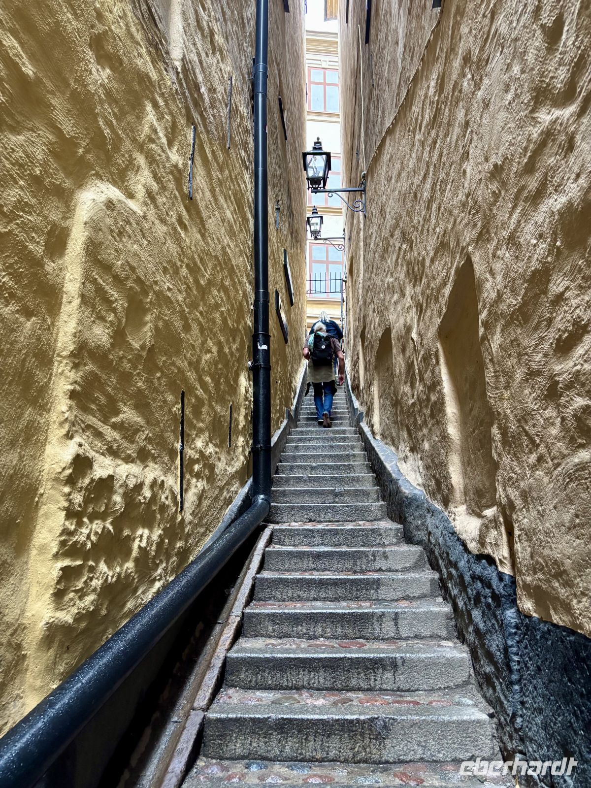 Nächstes Ziel: Gamla Stan. Zuerst kehren wir am legendären Fischimbiss Nystekt Strömming ein und stärken uns mit gebratenem Hering, Kartoffelbrei und Knäckebrot. Gut gelaunt schlendern wir anschließend durch die kopfsteingepflasterten Gassen, natürlich auch durch die schmalste Straße Stockholms, die Mårten Trotzigs Gränd. Schließlich landen wir im Café Grillska Huset, wo uns eine köstliche Prinzess-Torte erwartet – ein süßer Abschluss nach so vielen Eindrücken.