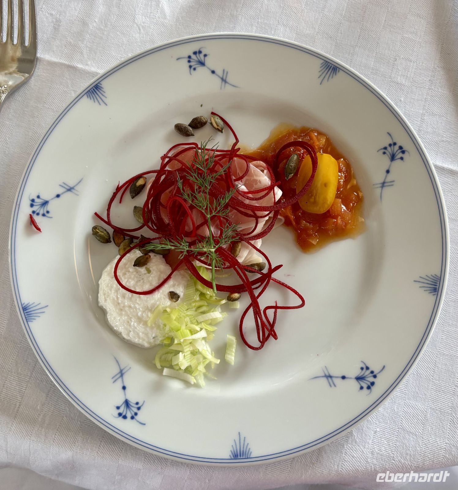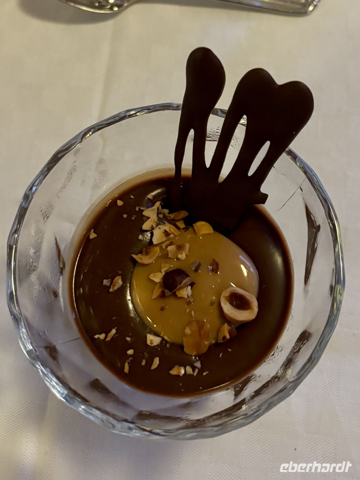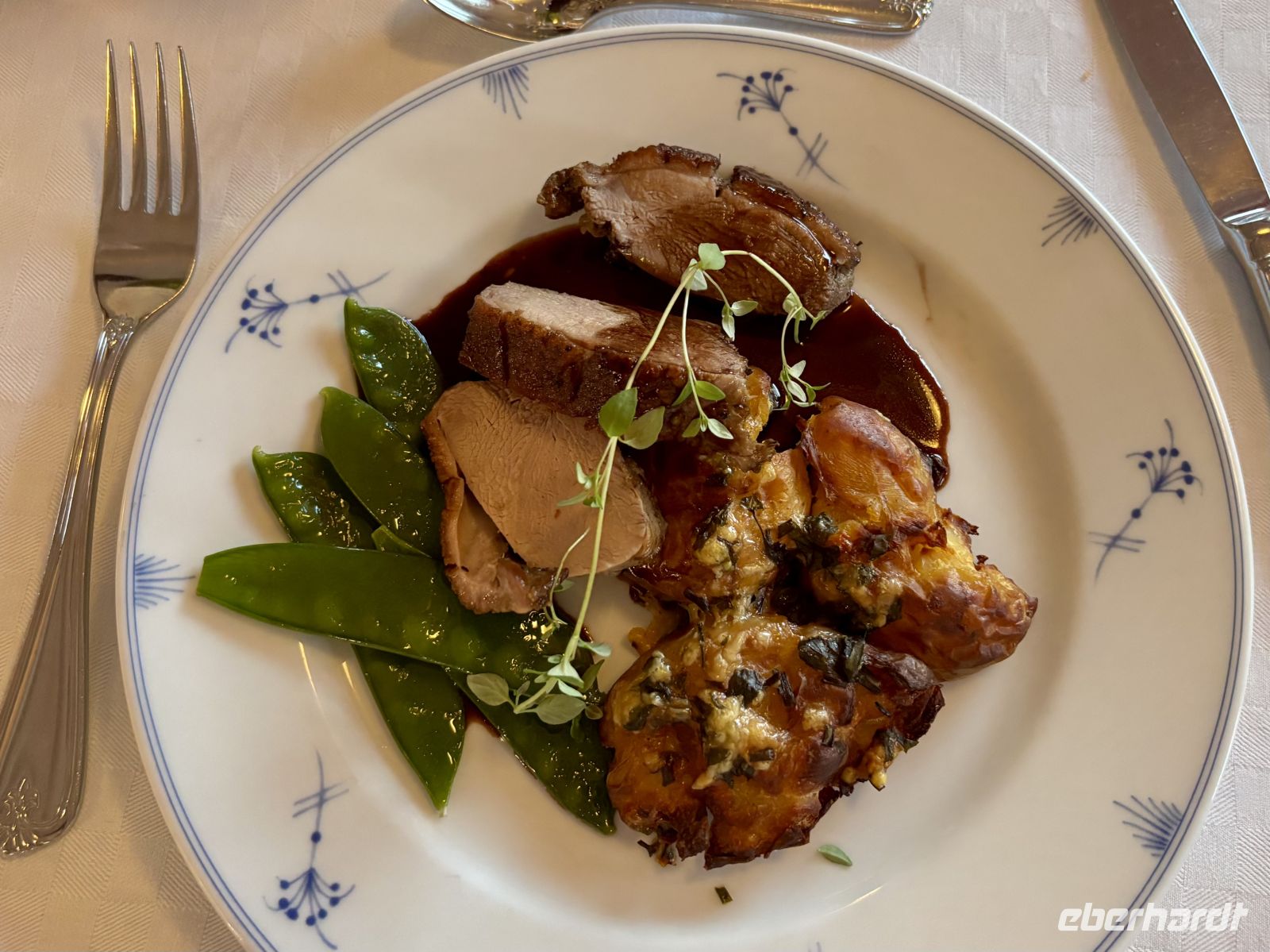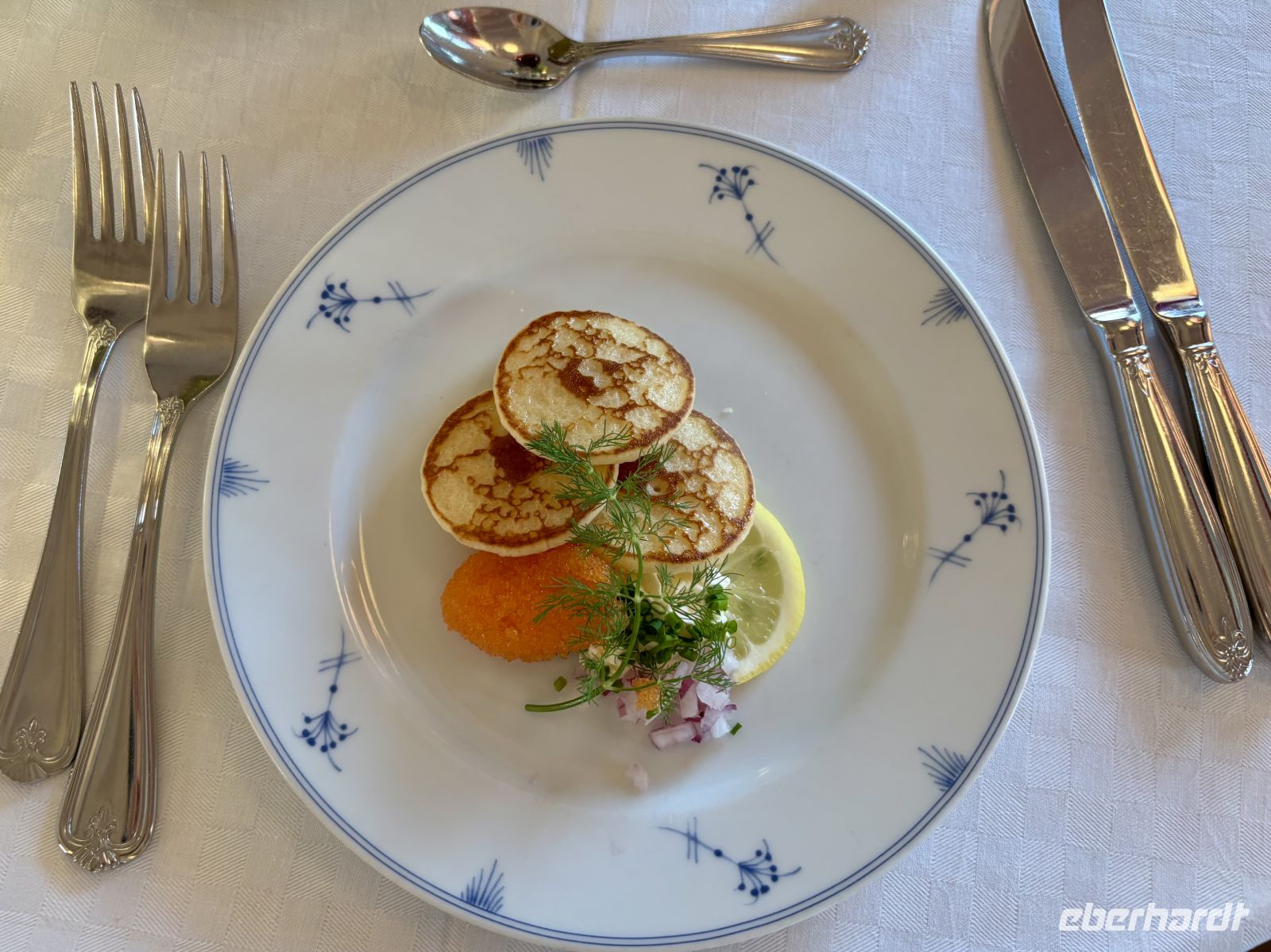 Im Salon erwartet uns ein köstliches Menü: Blinis mit Felchenkaviar, zarte Entenbrust auf Rotweinjus und als krönender Abschluss eine dunkle Schokoladencreme mit gerösteten Nüssen. Ein Genuss, der alle begeistert!