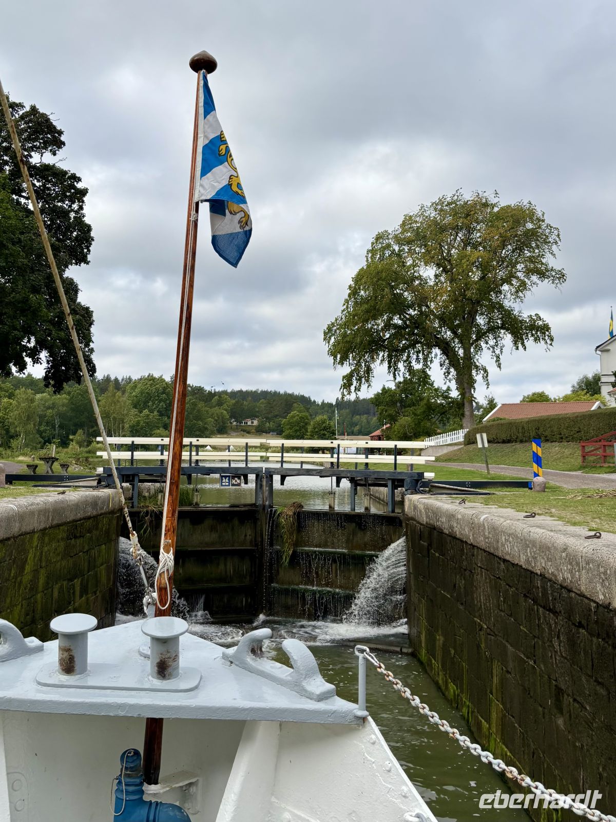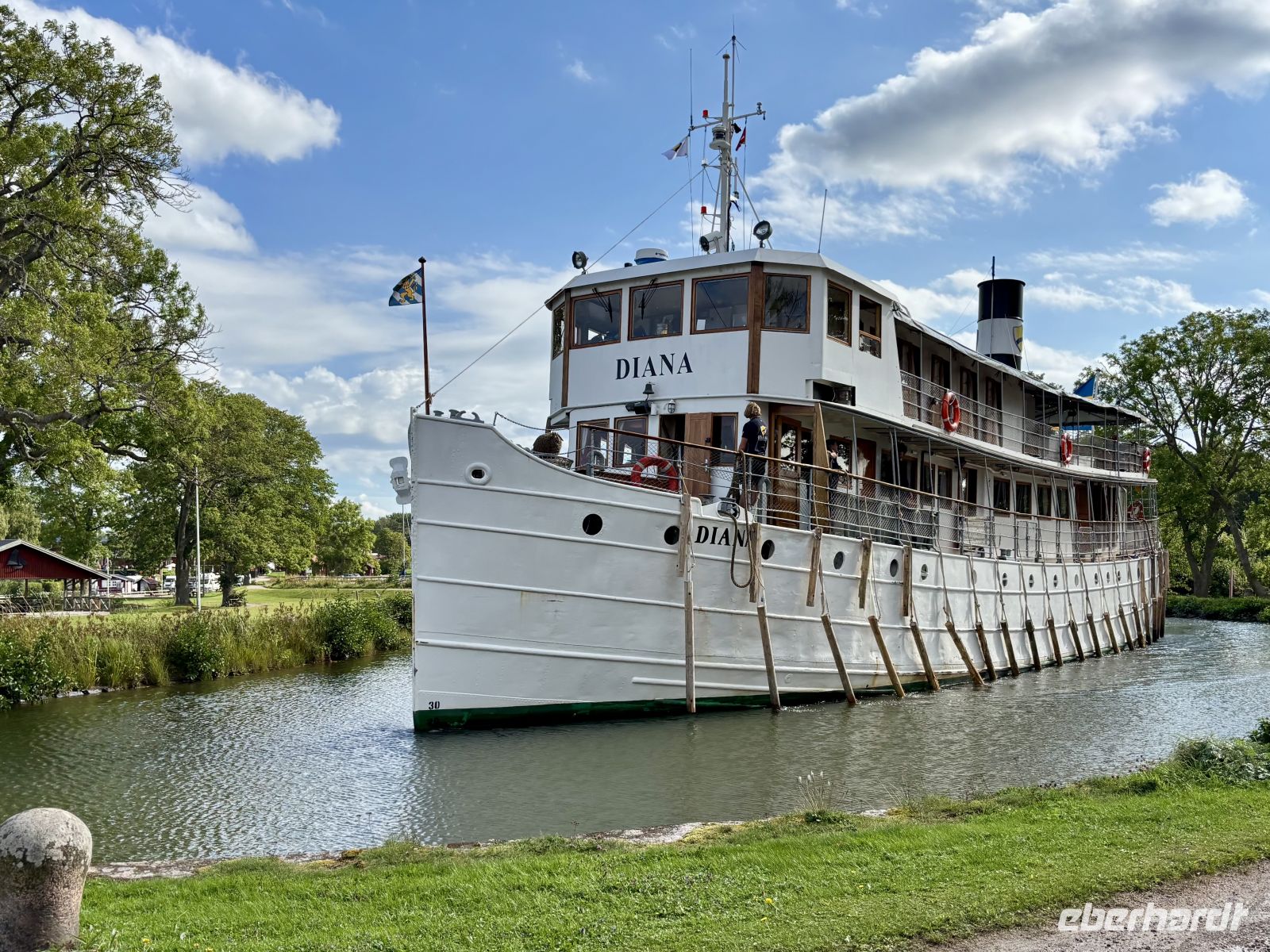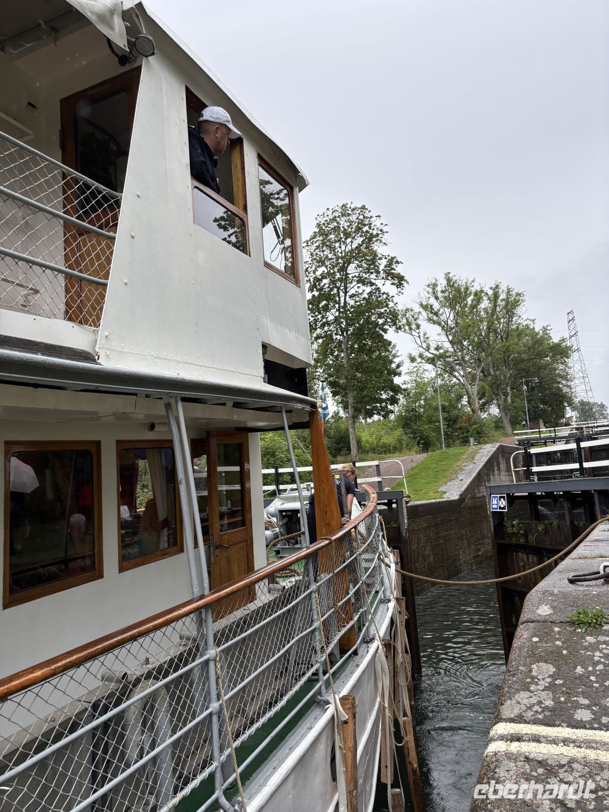 Zurück an Bord nimmt die Diana wieder Fahrt auf, nun bei der Schleuse in Mem hinein in den Götakanal. Anne informiert uns über den Ablauf des Tages und versichert uns, dass wir uns schon bald an die ungewohnten Nächte gewöhnen werden. Über den Kanal erfahren wir, dass