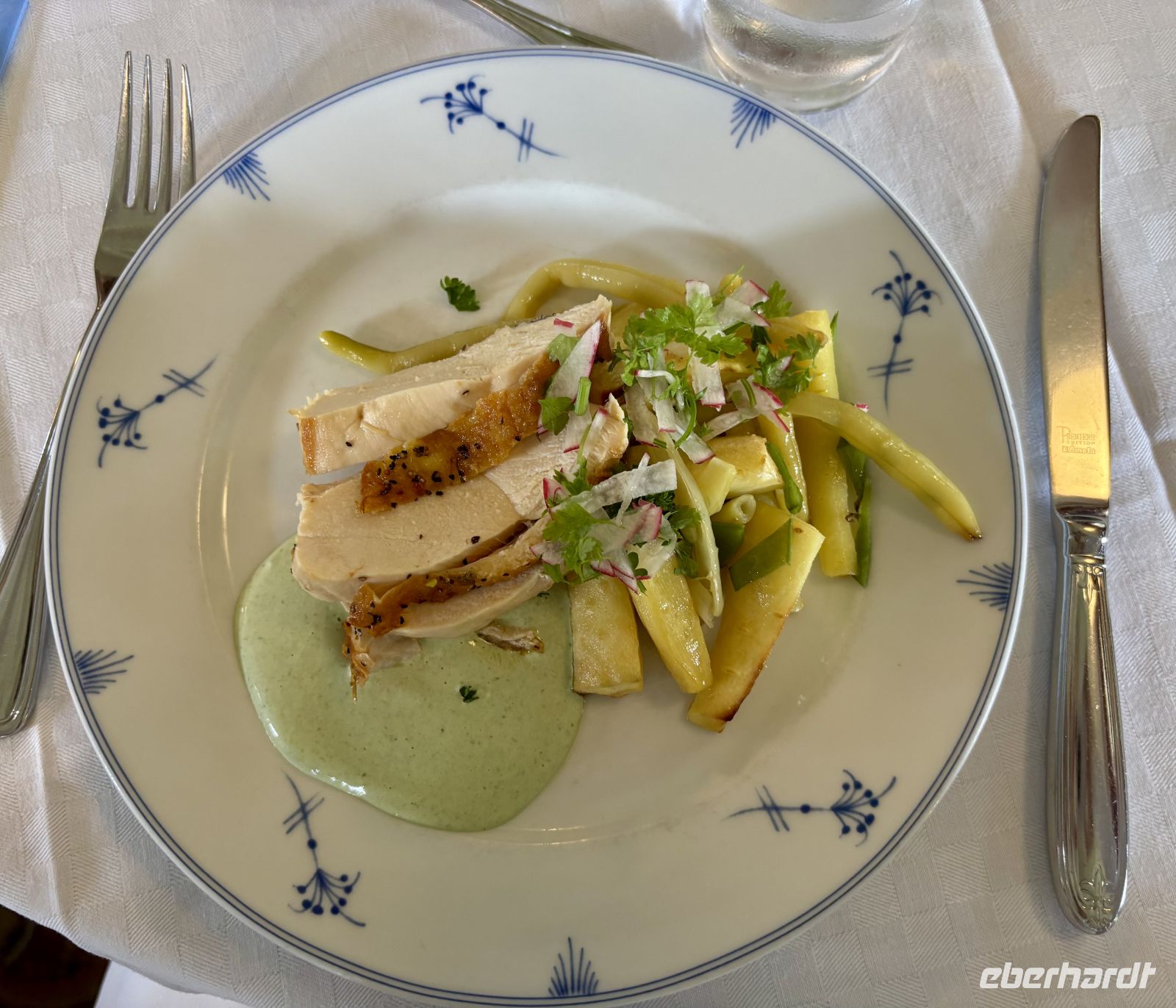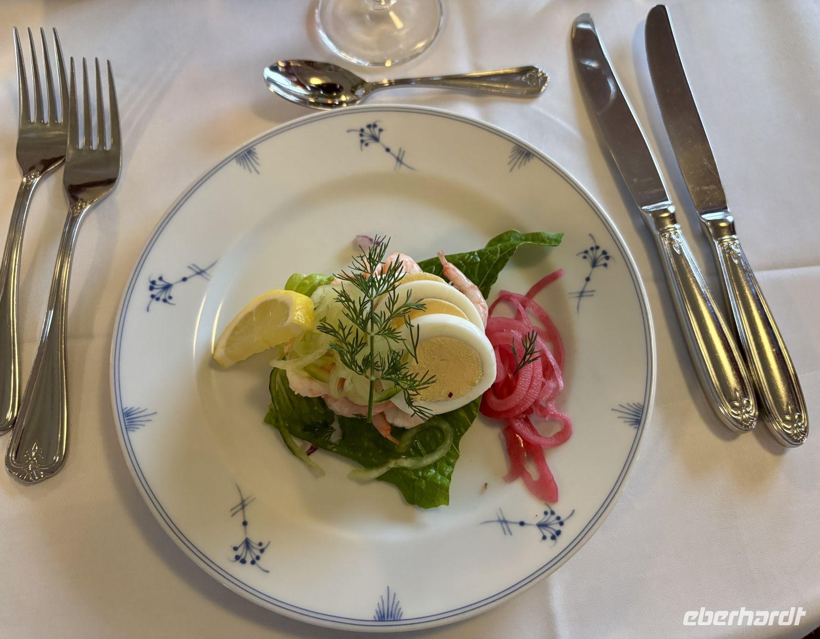 Doch schließlich lockt uns der Duft aus der Kombüse zum Abendessen in den Salon. Zur Vorspeise gibt es einen pikanten Krebssalat, danach genießen wir gebratenen Saibling in feiner Weißweinsauce mit Kartoffelstampf. Zum Abschluss verwöhnt uns die Küche mit einem Tiramisu