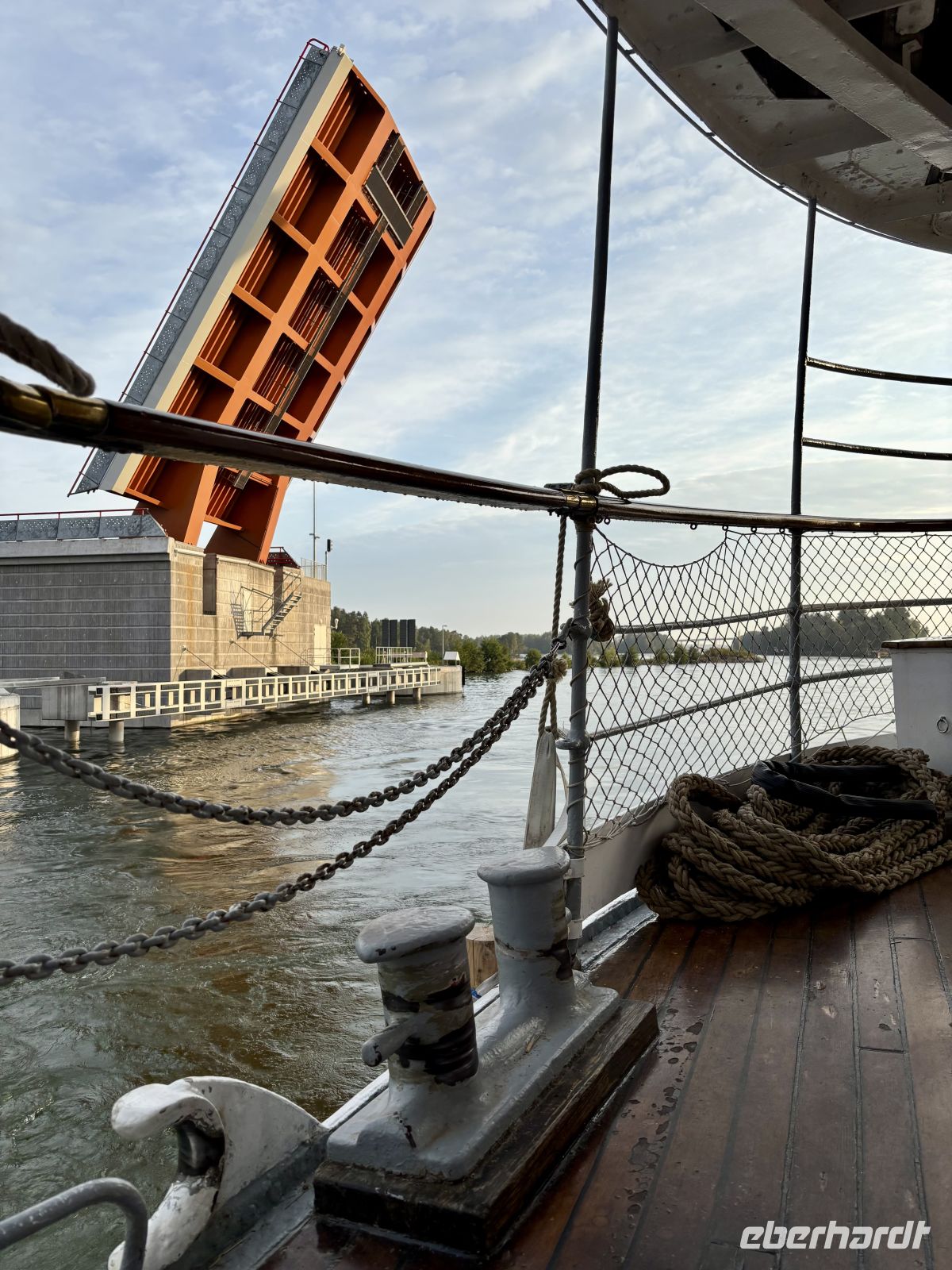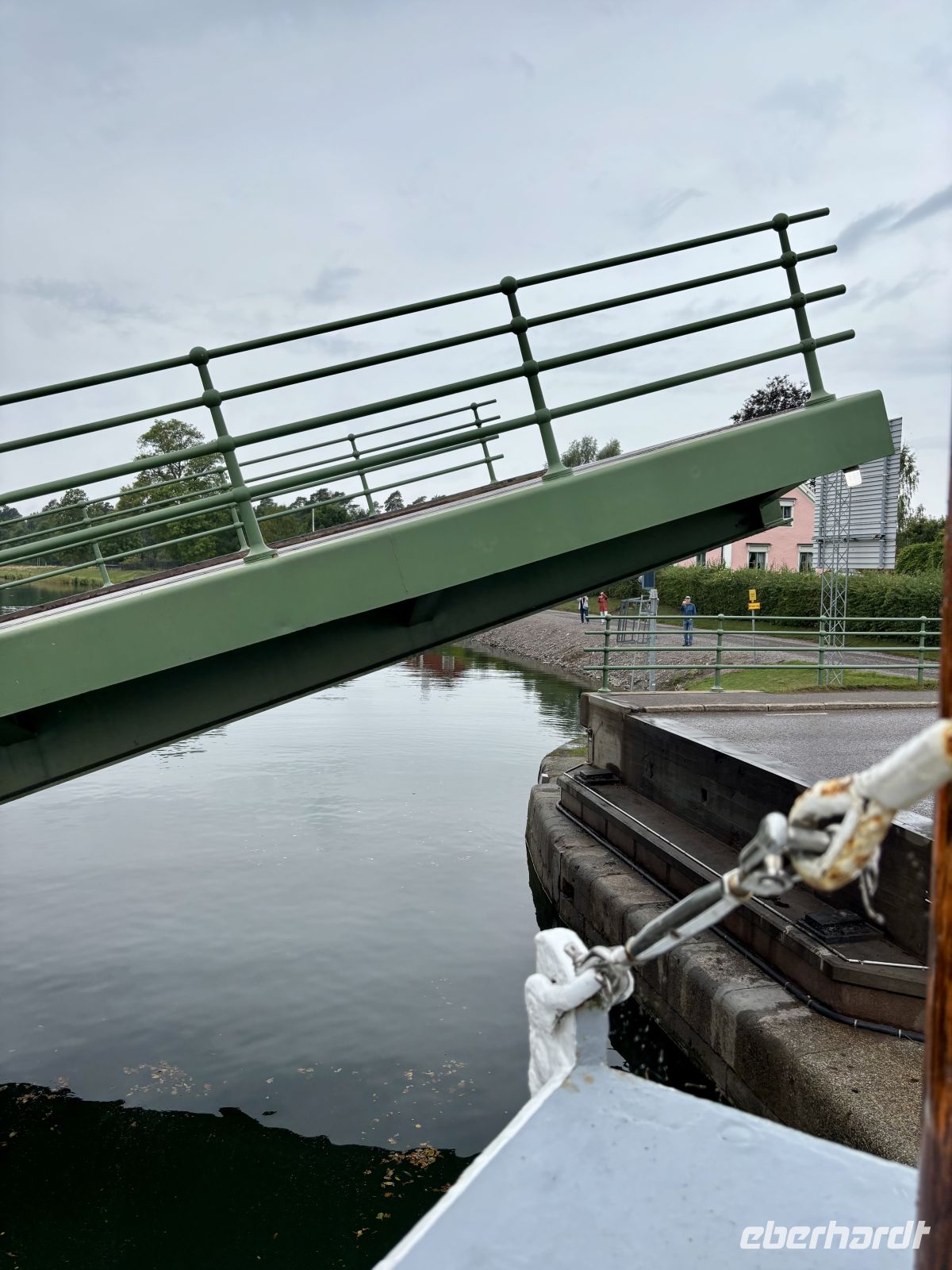 In Borensberg erwartet uns die von Hand bediente Schleuse, die unsere tüchtige Maschinistin Sophie mit erstaunlicher Kraft bewegt. Über den Borensee erreichen wir schließlich die Schleusentreppe von Borenshult. Hier klettert die Diana über fünf direkt miteinander verbundene Schleusen ganze 15,3 Meter hinauf – ein eindrucksvolles Schauspiel. Und es geht Schlag auf Schlag weiter: der Scheusenwärter öffnet für uns eine von Hand zu bedienende Brücke – wir bedanken uns lachend mit kräftigem Applaus. Bald darauf folgen weitere Brücken mit faszinierender Technik: manche klappen nach oben, andere schwenken seitlich zur Seite.