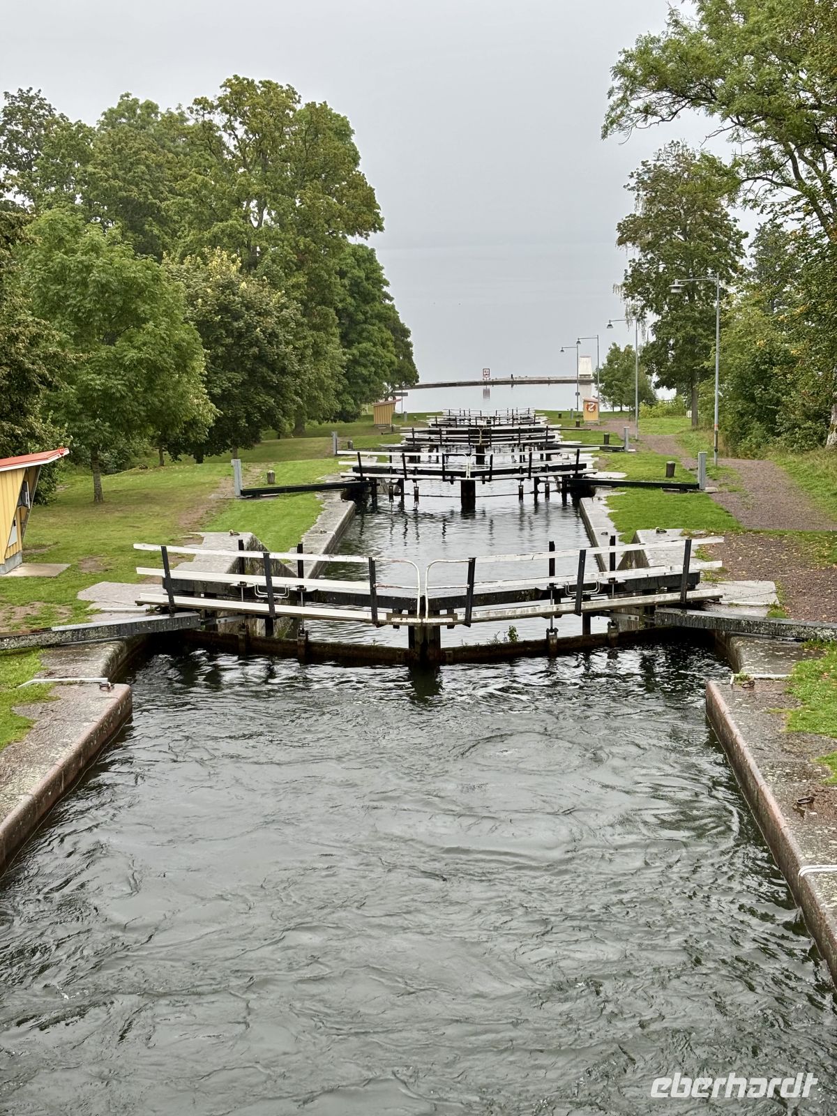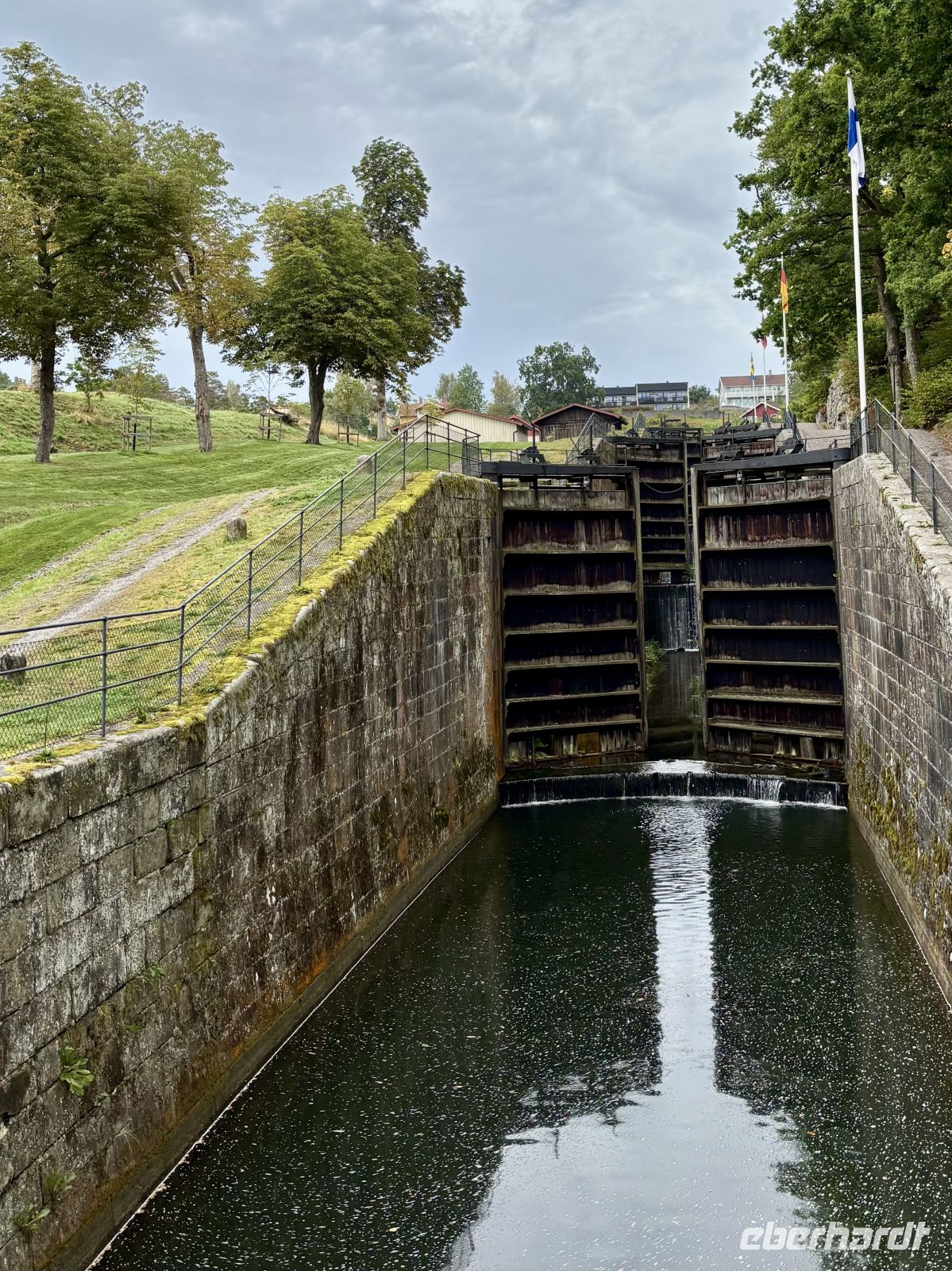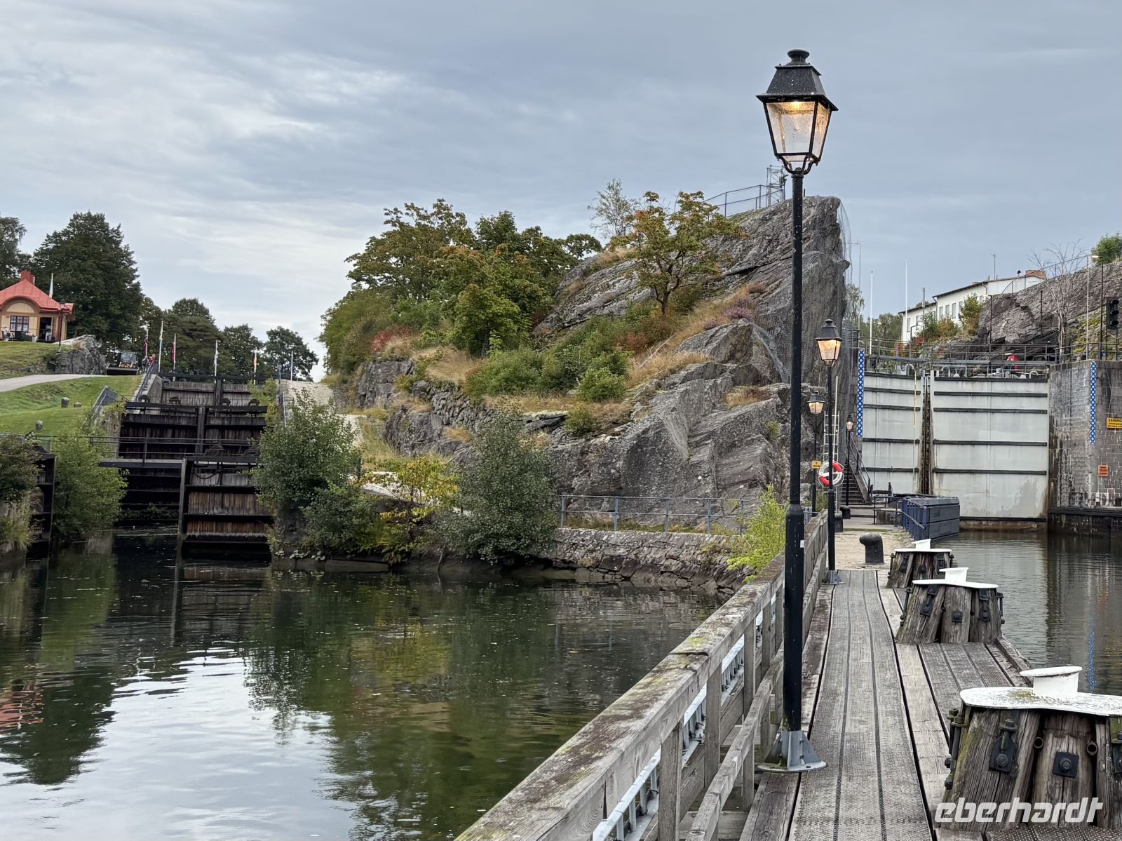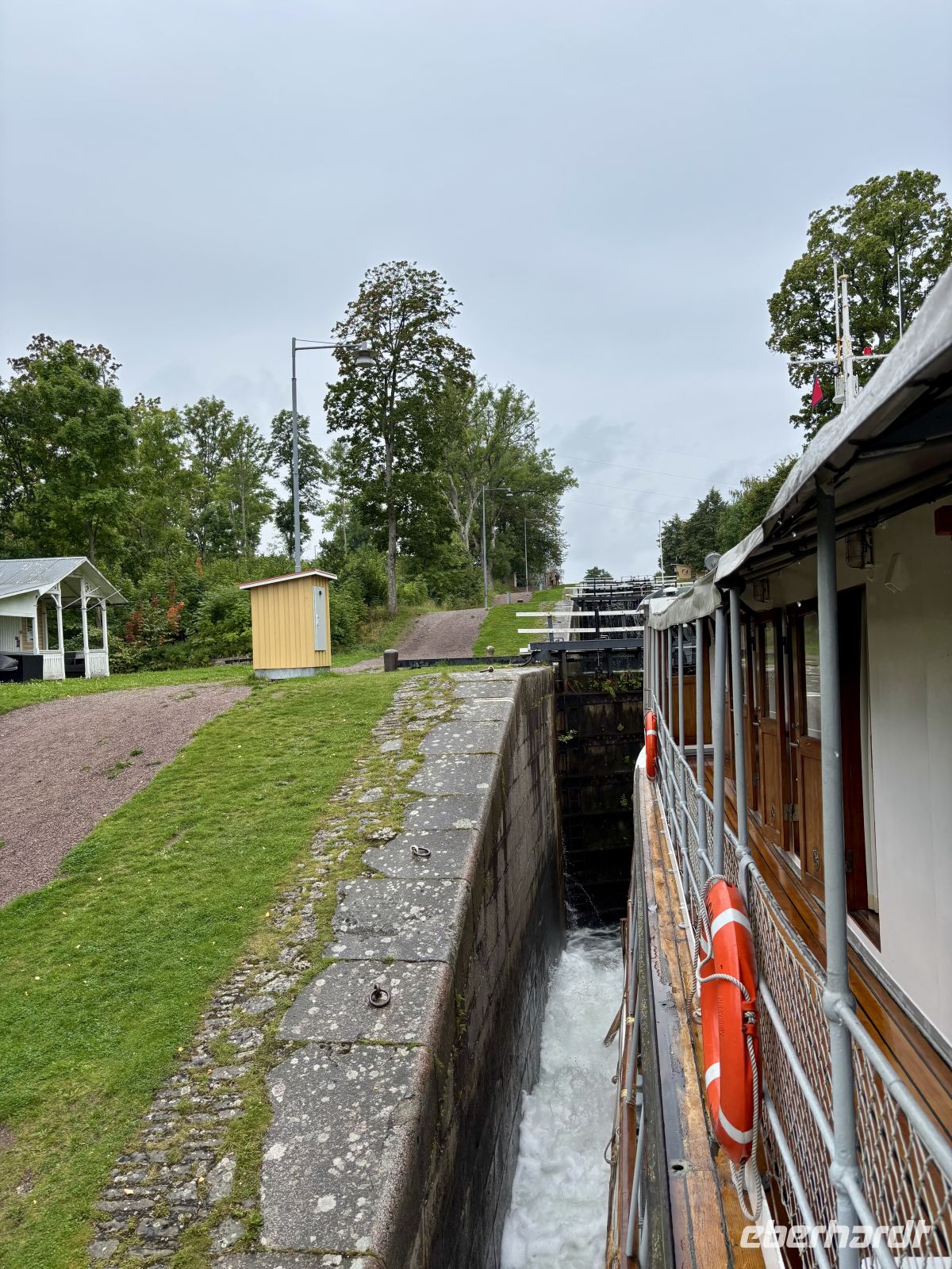 Am oberen Ende der Schleusentreppe legt unser Schiff an, und wir nutzen die Gelegenheit für einen Besuch im Kanalmuseum. Ein informativer Film erklärt uns die große Bedeutung des Trollhättekanals, der einst den Weg zwischen Nord- und Ostsee eröffnete. Danach spazieren wir entlang des ersten Schleusenkanals von 1800 und weiter zum Schleusenkanal von 1844. Schließlich stehen wir staunend vor der modernen Schleuse, die seit 1916 in Betrieb ist – beeindruckend, wie hier historische Bauwerke und moderne Technik nebeneinander bestehen. Zurück an Bord setzt Regen ein, doch Matrosin Alexandra lässt sich davon nicht beirren. Im strömenden Regen begleitet sie die Diana souverän auf ihrem Weg abwärts durch die vier großen Schleusen. Insgesamt überwinden wir dabei stolze 32 Meter – ein letzter Höhepunkt dieser abwechslungsreichen Reise.