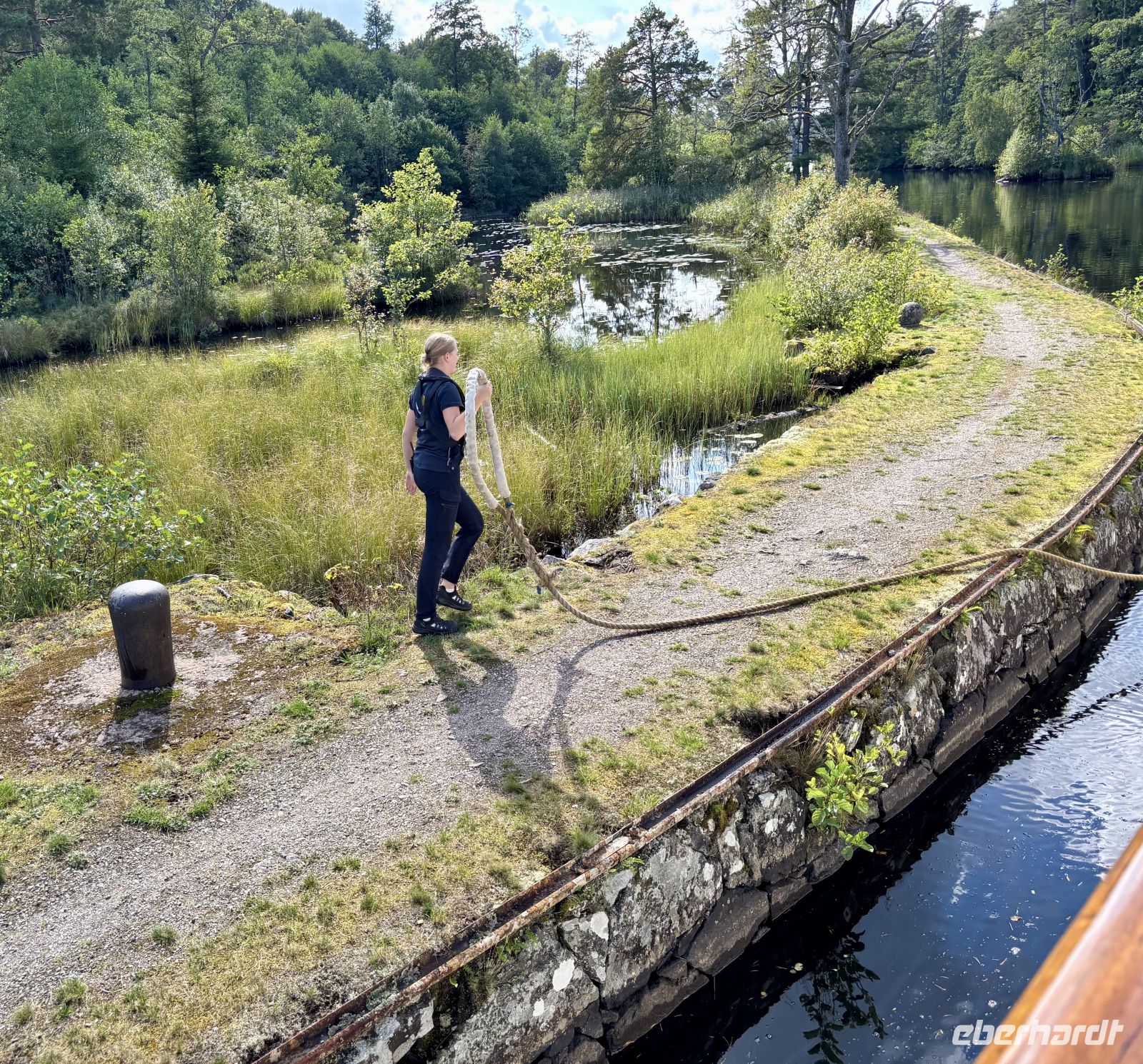 Doch lange zum Ausruhen bleibt keine Zeit – schon wartet die nächste Herausforderung auf Kapitän Peter Harrisson. Die engste Kurve des gesamten Kanals steht bevor. Mit ruhiger Hand und der tatkräftigen Hilfe von Matrosin Alexandra, die das Schiff geschickt von Poller zu Poller sichert, meistert er die Passage souverän. Bald darauf gleiten wir durch den Spetsnäskanal, eine gesprengte Abkürzung und zugleich die schmalste Stelle des Göta-Kanals, bevor sich die Weite des Viken-Sees vor uns öffnet.