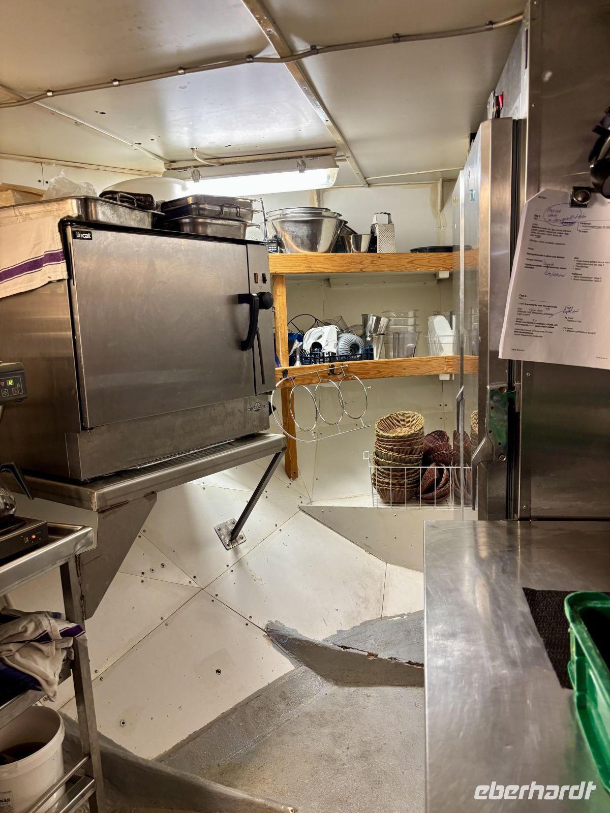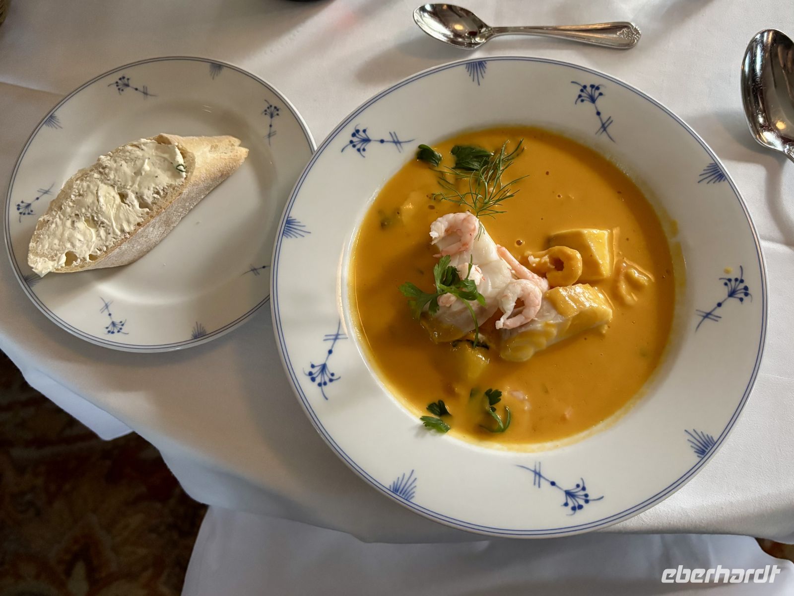 Der Regen legt sich wie ein grauer Schleier vor die Scheiben, und niemand hat wirklich Lust, das Schiff zu verlassen. Zum Glück wartet ein kulinarischer Lichtblick: das köstliche Abendessen, das Schiffskoch Kenth und Schiffsköchin Anette für uns gezaubert haben. Schon die Vorspeise mit Garnelen, Brot und feinen Beilagen lässt uns schwärmen. Danach folgt zartes Schweinefilet mit Kartoffelgratin, rotem Johannisbeerengelee und einer würzigen Cognac-Pilzsoße – einfach himmlisch! Zum Dessert genießen wir eine weiße Schokoladencreme mit Orange und Sanddorn, die den Abend versüßt.
