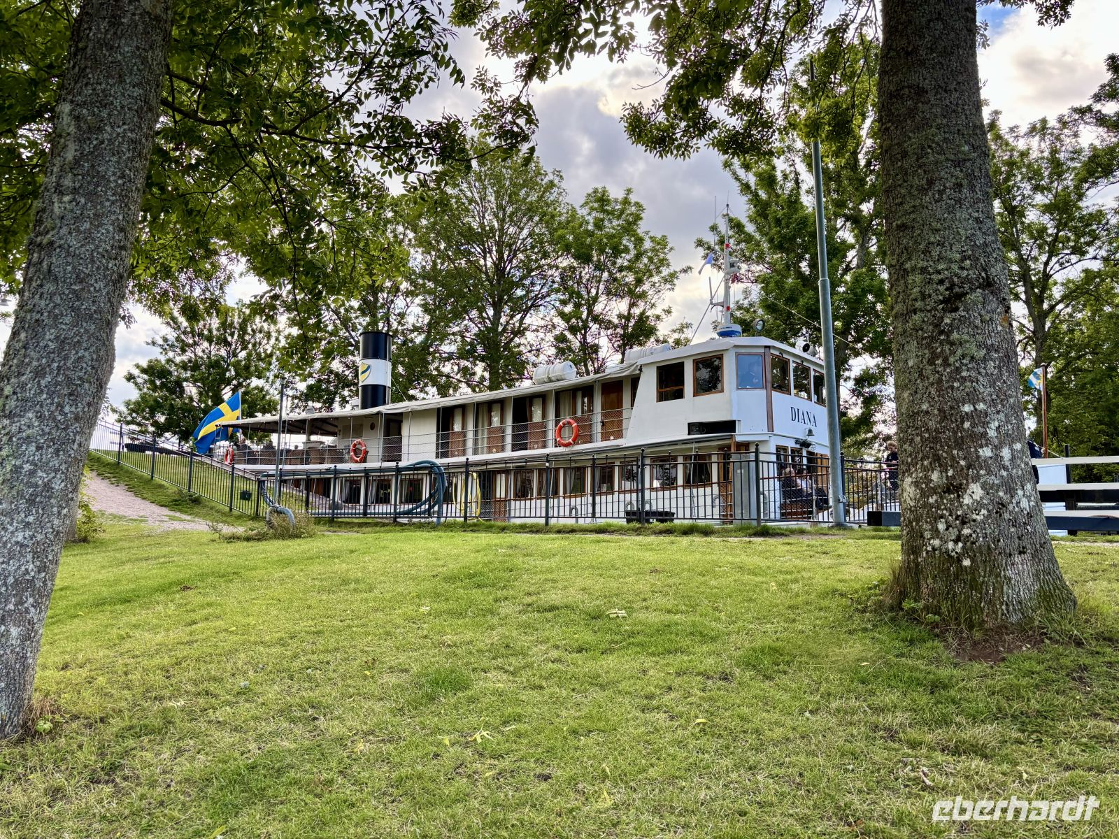 Nicht mehr lange, und wir erreichen die Hauptstadt des Göta-Kanals: Motala. Hier legte Baltzar von Platen den Grundstein für die berühmte Werkstatt, die vielen als Wiege der schwedischen Industrie gilt. Die Diana gleitet am Grabmal des „Vaters des Göta-Kanals“ vorbei und grüßt ihn mit lautem Hupen. Bereits um 17:10 Uhr machen wir in Motala fest, wo unser Schiff die Nacht vor Anker liegt.