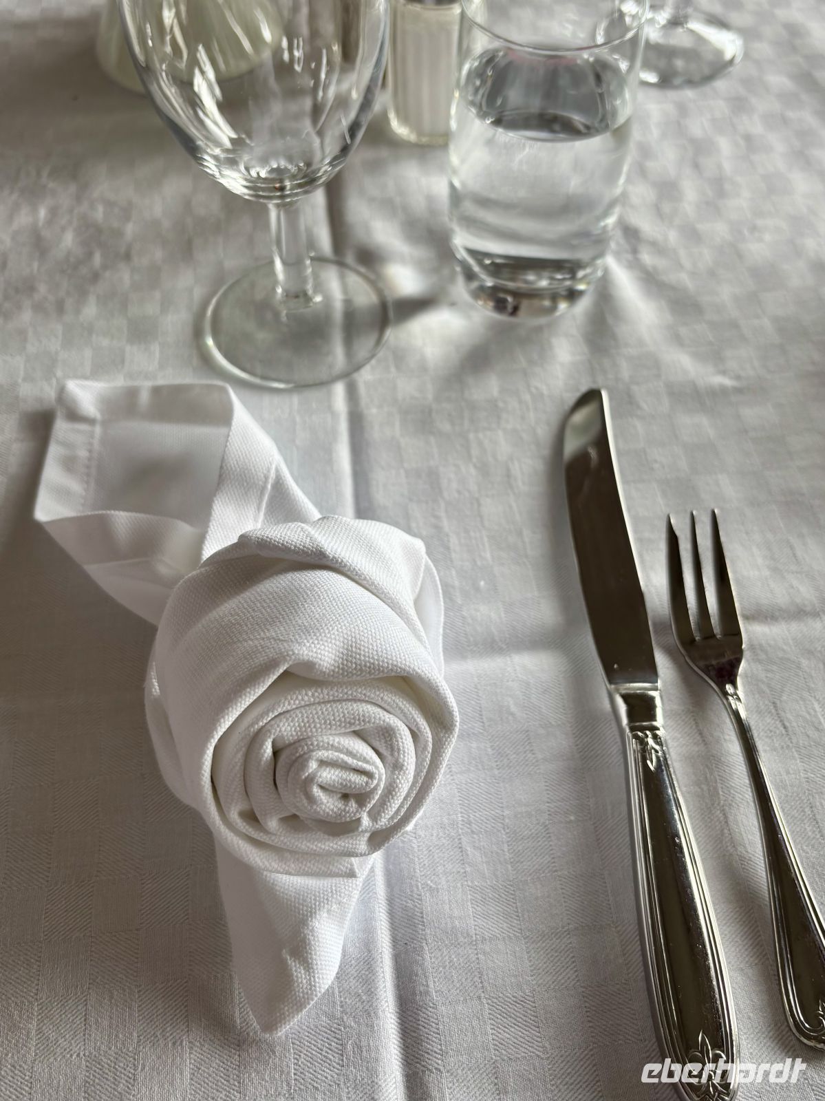 Da noch etwas Zeit bleibt, bis die Diana wieder ablegt, nutzen einige Mutige die Gelegenheit zu einem Sprung ins glasklare Wasser – eine kurze, aber herrliche Erfrischung. Wieder an Bord steigt die Spannung: das Captain’s Dinner steht bevor. Festlich eingeleitet wird es mit einem Sektempfang auf dem Brückendeck. Alle Gäste haben sich fein gemacht, die Stimmung ist feierlich, und gemeinsam stoßen wir mit dem Kapitän an – „Skål!“ tönt es fröhlich über das Deck.