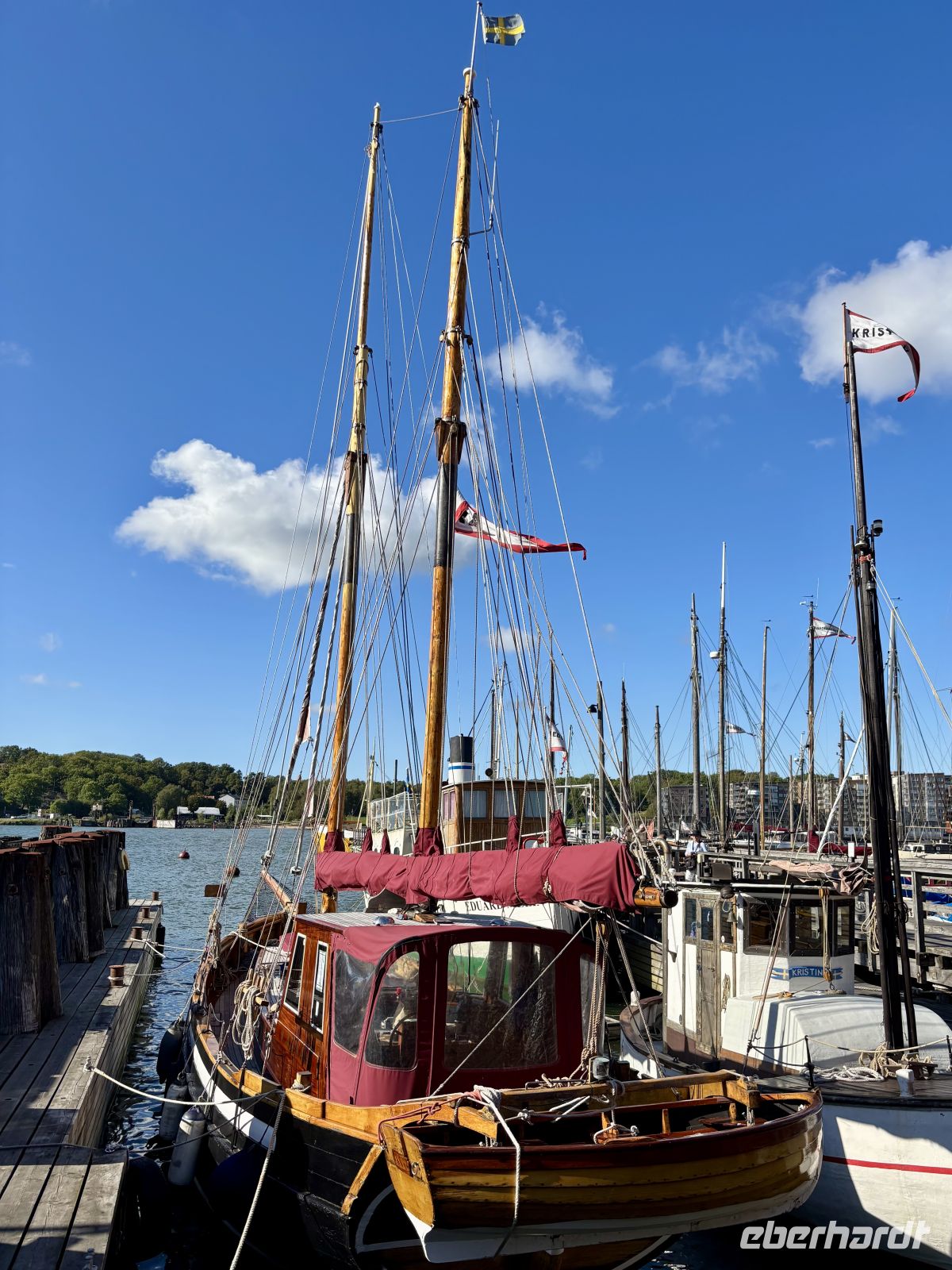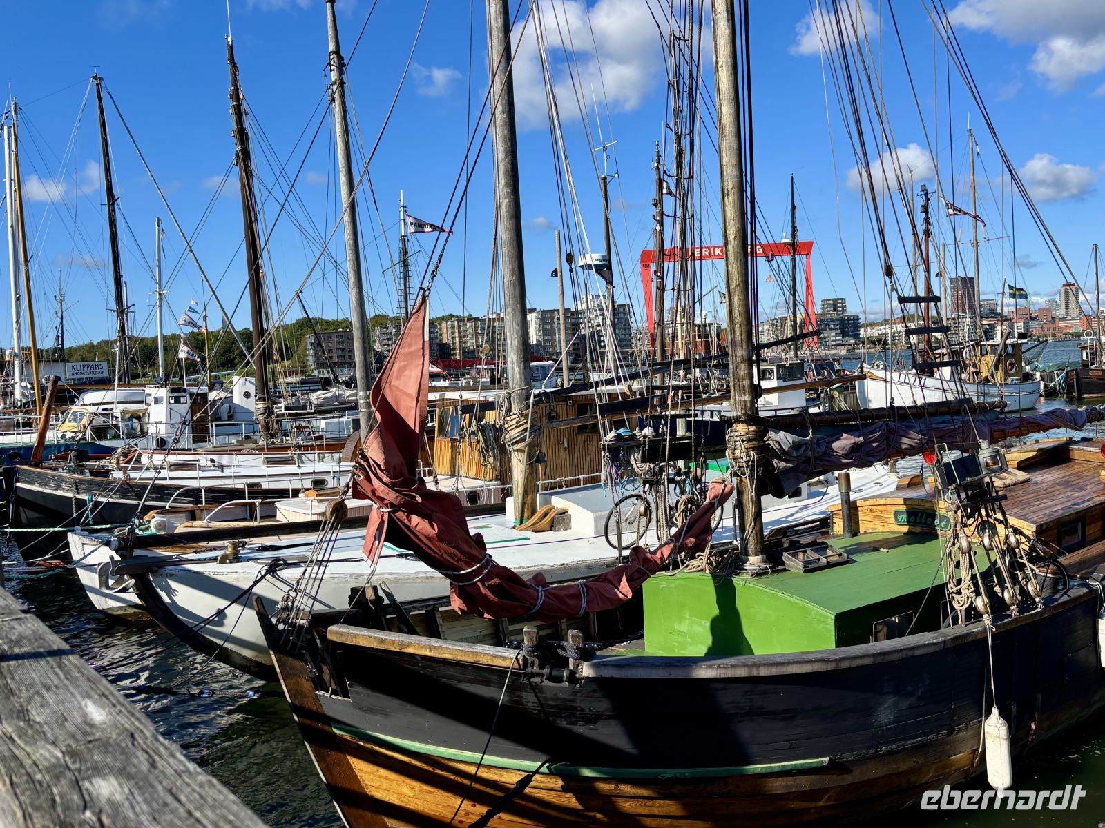 Ein kleiner Verdauungsspaziergang führt uns zurück zum Fähranleger, und bald bringt uns der Bus wieder nach Göteborg. Ein nächster Stopp ist das ehemalige Werftgelände von Eriksberg. Wo früher große Schiffe gebaut wurden, pulsiert heute das urbane Leben – moderne Wohnungen, Cafés und Promenaden haben dem alten Industrieareal neues Leben eingehaucht. Doch Jan hat noch einen Geheimtipp für uns: den alten Hafen mit dem ehemaligen Lagerhaus der Ostindischen Kompanie. Heute befindet sich darin ein beliebtes Fischrestaurant, und am Steg schaukeln wunderschöne alte Segelboote, die dem Ort einen ganz besonderen Charme verleihen. Nach dieser letzten Besichtigung steht für uns fest: Göteborg ist wahrlich eine Reise wert, und wir haben das Gefühl, längst noch nicht alles entdeckt zu haben. Dennoch neigt sich unsere Reise dem Ende zu. Am Abend erwartet uns im Restaurant Kellarkrogen ein letztes gemeinsames Essen. Bei einem köstlichen Drei-Gänge-Menü genießen wir die besondere Stimmung des Abschieds.