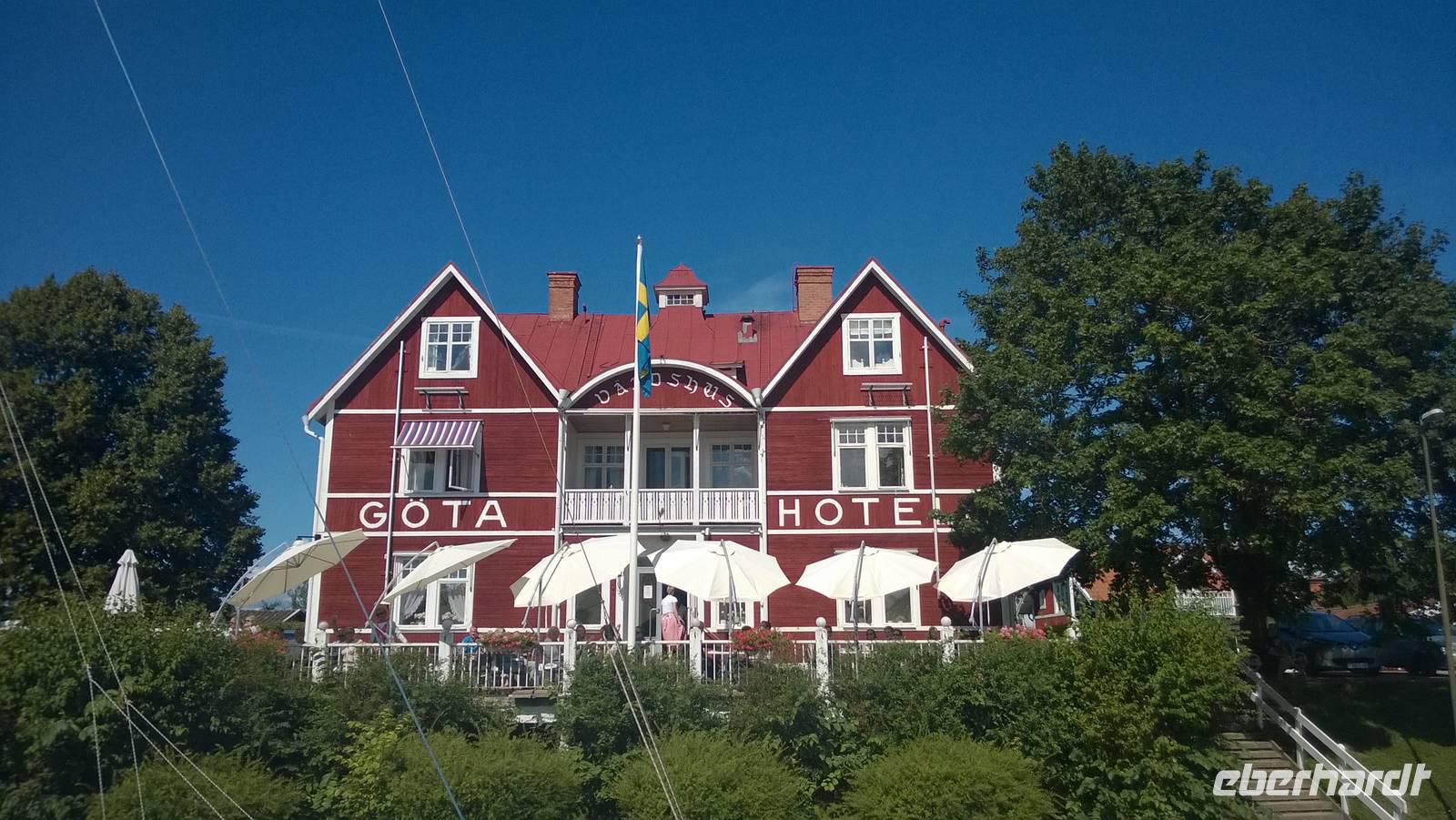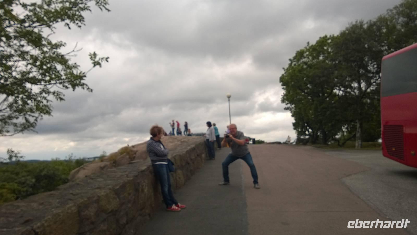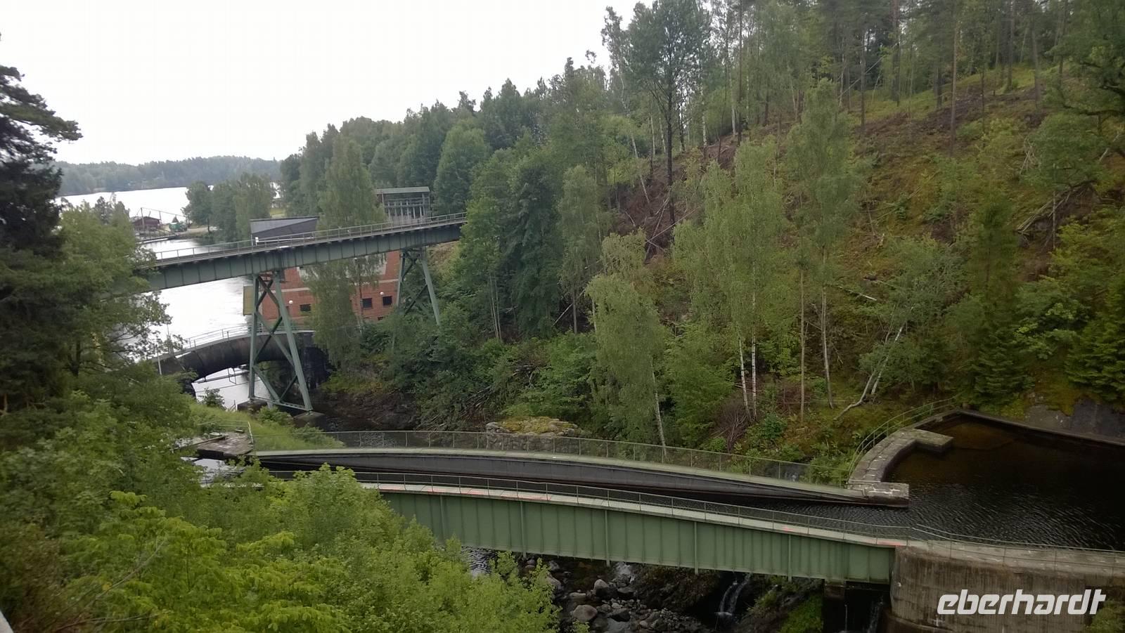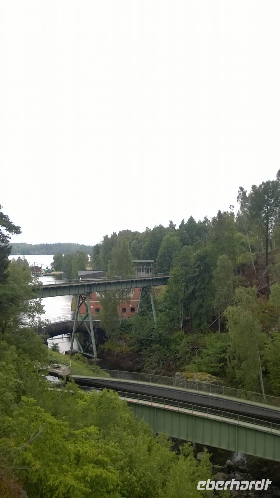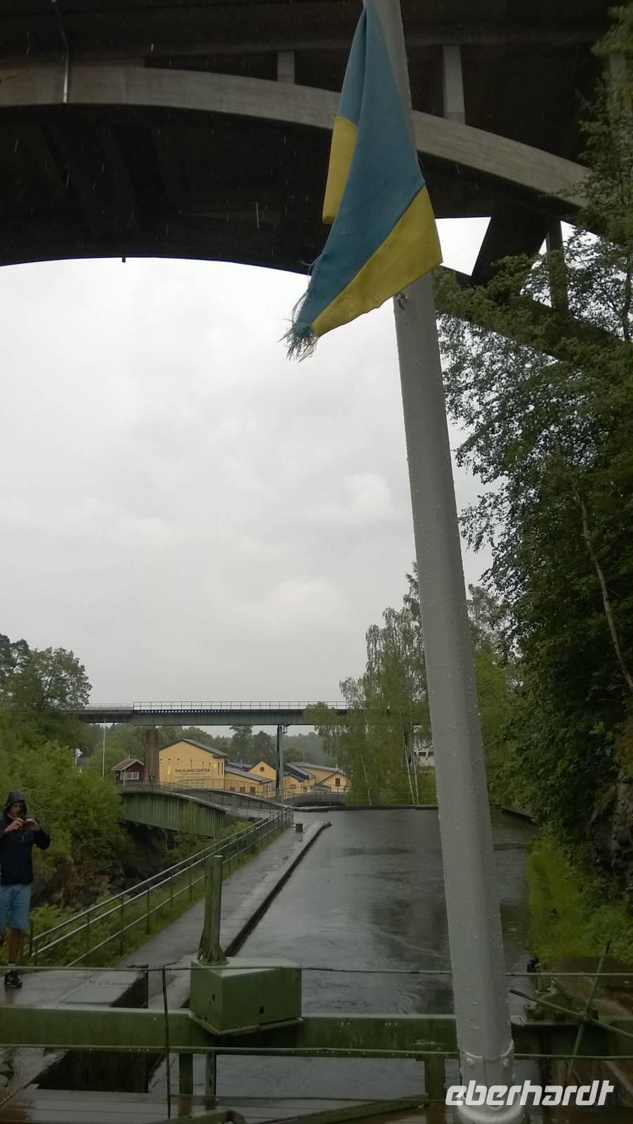 Nachdem wir gestern ganz schön viel erlebt haben, wird dieser Tag gemütlich und ruhig. Von unserem Hotel in Vänersborg aus unternehmen wir einen Tagesausflug. Zunächst fahren wir nach Haverud, wo wir uns die berühmte Trogbrücke schon einmal von oben anschauen und ein Foto machen. Eng sieht sie aus. Da soll unser Kahn also später durchpassen? Jaja, er passt durch. Von der Anlegestelle Langbron bei Dals Langed schippern wir gemächlich den Dalsland-Kanal entlang. Kapitän Holmedahl und seine Frau Annika, heißen uns auf ihrem Schiff willkommen. Für etwas mehr als drei Stunden befahren wir den berühmten Kanal und erleben die Schleußen hautnah. Ein typisch schwedisches Mittagessen erfreut die Gaumen und die Gemüter - das ist bei diesem Hundewetter auch wirklich wichtig. In Haverud angekommen, schauen wir uns noch an, wie Glas hergestellt wird und erstehen die ein oder anderen Souvenirs. Jetzt ist es aber an der Zeit, einen heißen Kaffee zu trinken! Wo bekommen wir den? Noch einbisschen fahren und dann stehen wir vor einem knallgelben Haus, dem Café „Gula Huset". In gemütlicher Wohnzimmeratmospähre futtern wir guten Kuchen oder frische Waffeln, schlürfen Kaffee oder Tee und genießen die Wärme und Behaglichkeit.