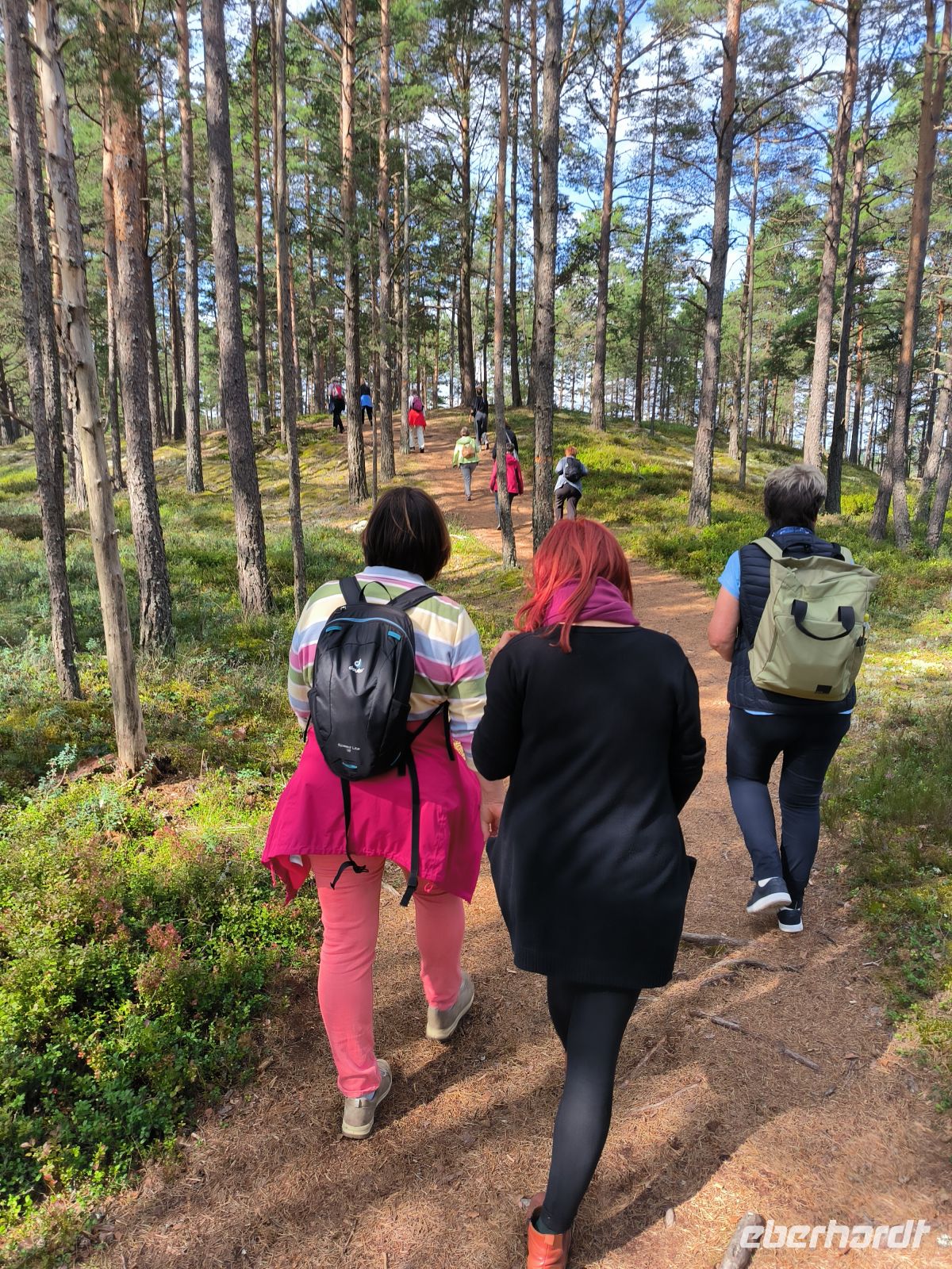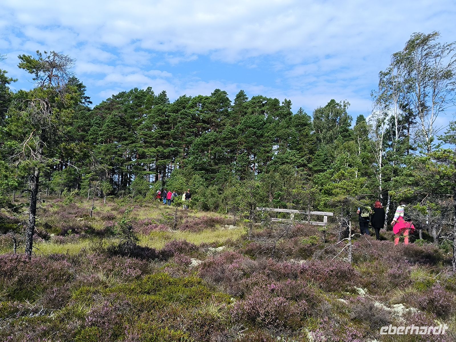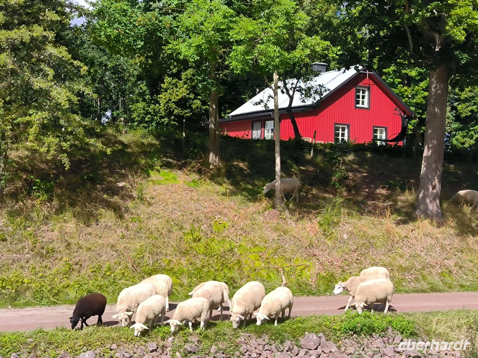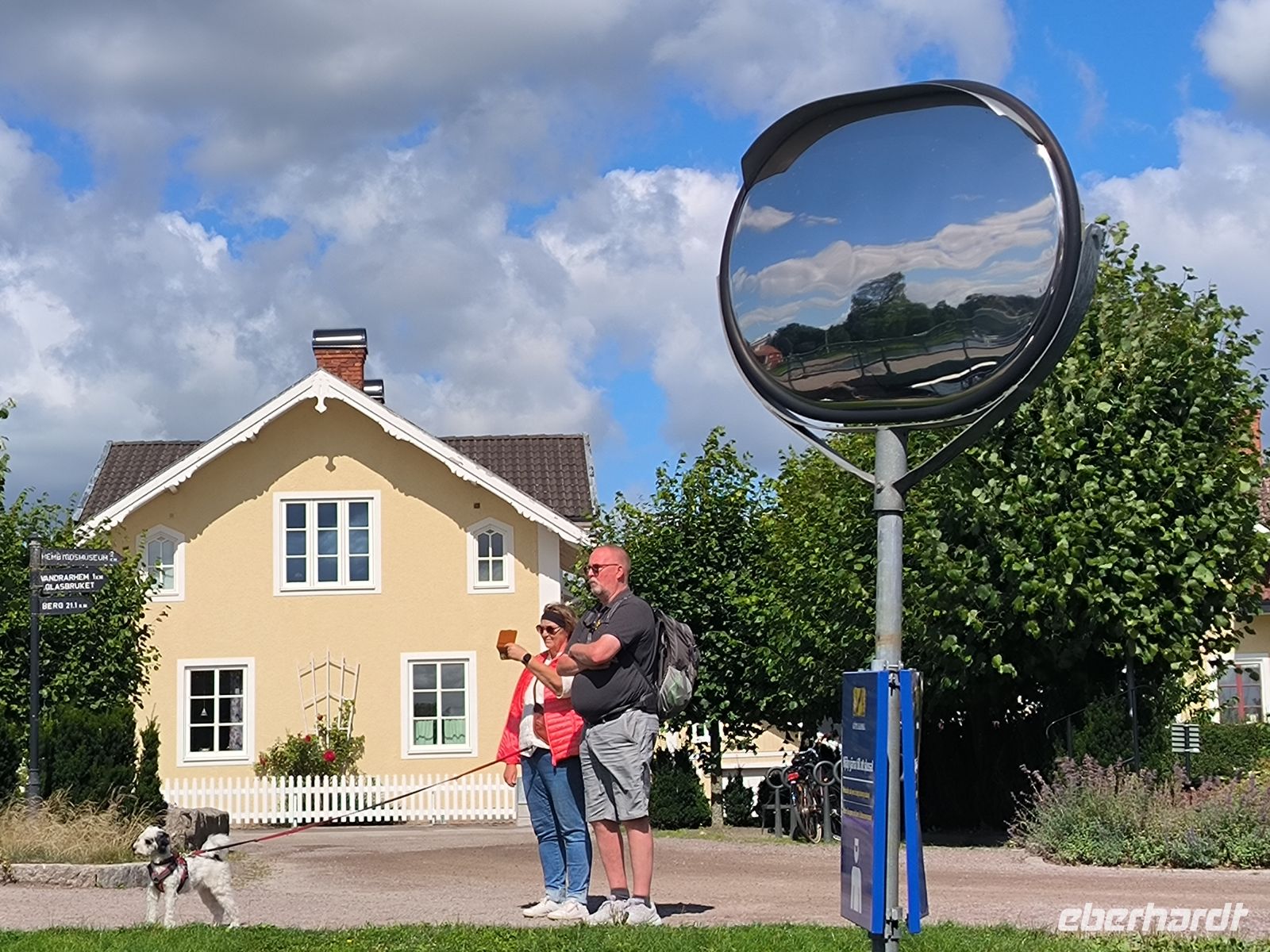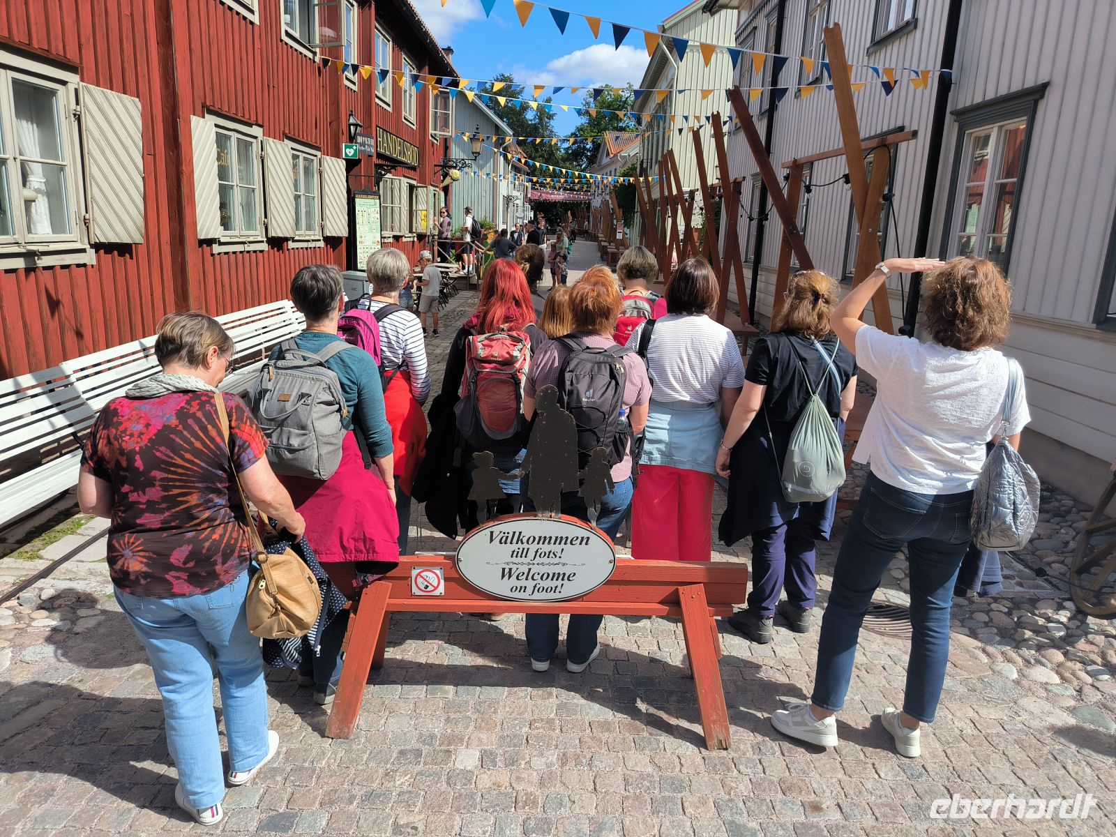 Voller Freude begrüßen wir am Morgen unseren Busfahrer Göran, der uns in den nächsten Tagen durch die schwedischen Landschaften kutschieren wird. Die erste Ausfahrt führt zu einer kleinen Herausforderung: 6,2 km Moorwanderung im Store Mosse Nationalpark. Klingt einfach, ist es aber nicht immer. Es erfordert schon etwas Konzentration, um auf den schmalen Brettern zu bleiben und sich keine nassen Füße zu holen. Aber die Stille und die Farben des Mooses sind ein Genuss für alle Sinne. Wohlbehalten kommen wir wieder am Bus an, das erste Teamevent ist geschafft. Nun kann es weitergehen mit der Eroberung Schwedens. In einer der schönsten Holzhausstädte - Eksjö (unaussprechlich) fangen wir an, die Echtheit des Falunrotes zu testen. Das ist die typische Farbe der roten Schwedenhäuser. Wir bummeln durch die gemütliche Stadt, am Fluss entlang und um die Kirche herum. Als wir dann alle im Bus sitzen und schon ein paar Minuten gefahren sind, der Schreckmoment: ein Handy ist verloren gegangen. Wir kehren um, fragen in zwei Restaurants, suchen den Rasen ab, als uns ein Mann Zeichen gibt. Und tatsächlich, er zieht das Handy aus der Hosentasche. Er hat es unter der Bank gefunden und gewartet, ob jemand suchen kommt. Die Besitzerin ist überglücklich und dankbar. Nun können wir alle froh und beseelt von den Eindrücken des ersten Tages zurück zum Hotel fahren.