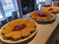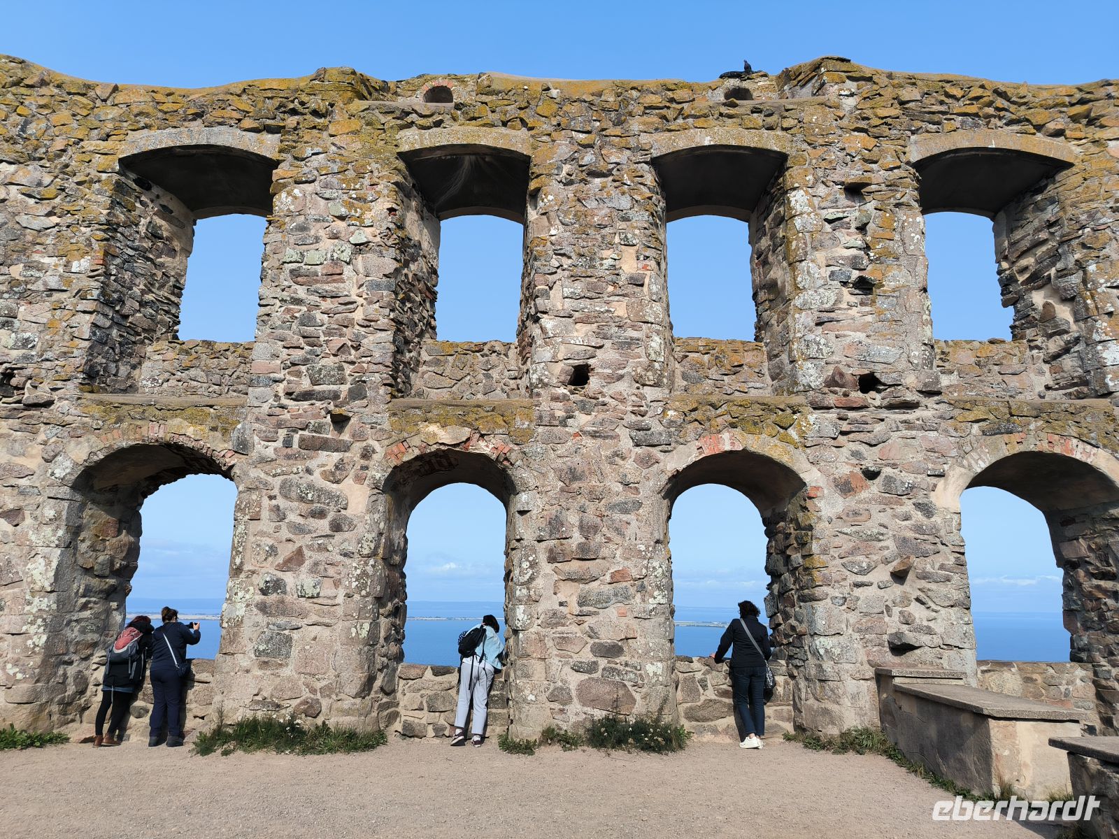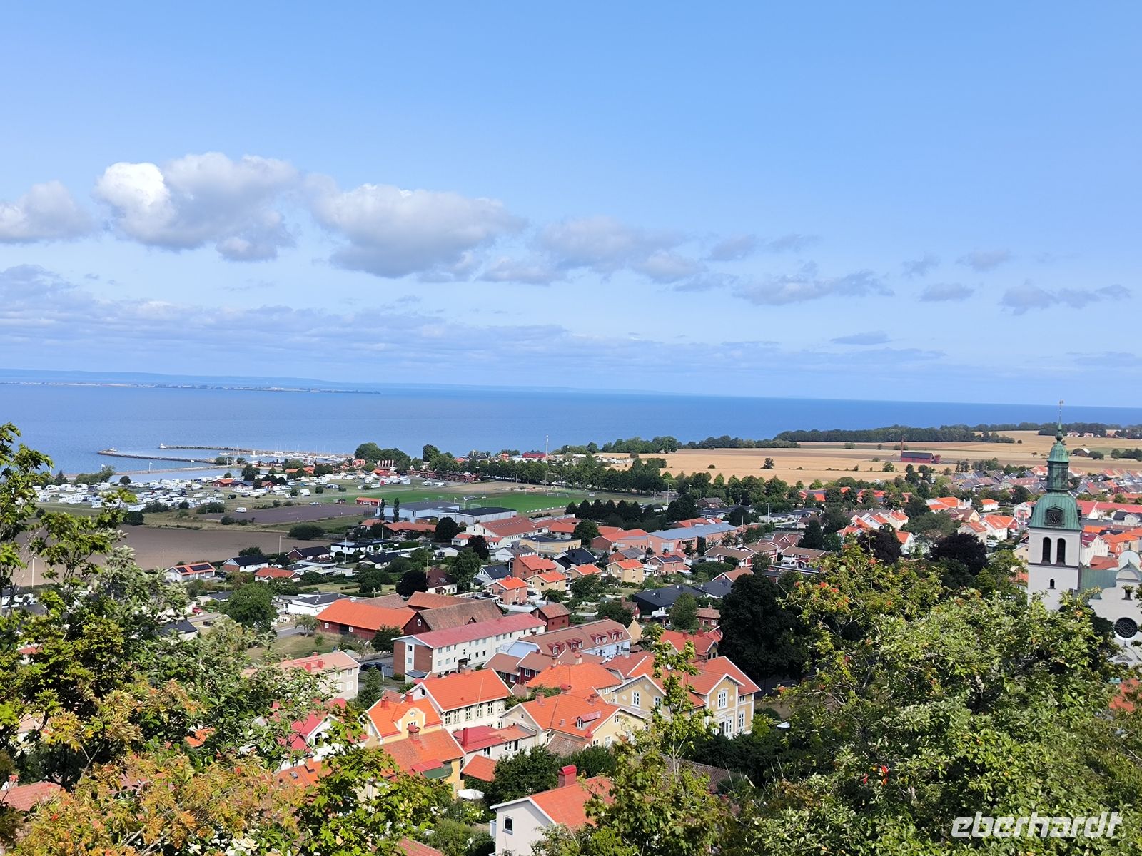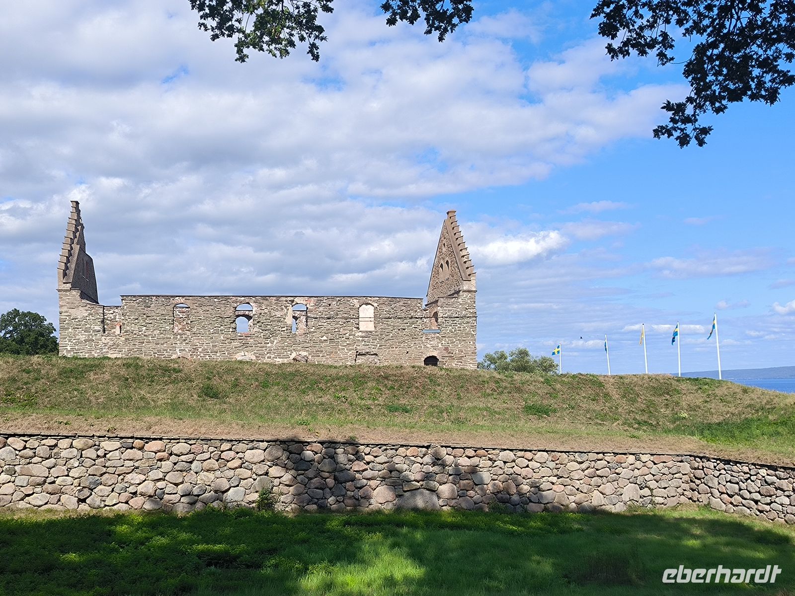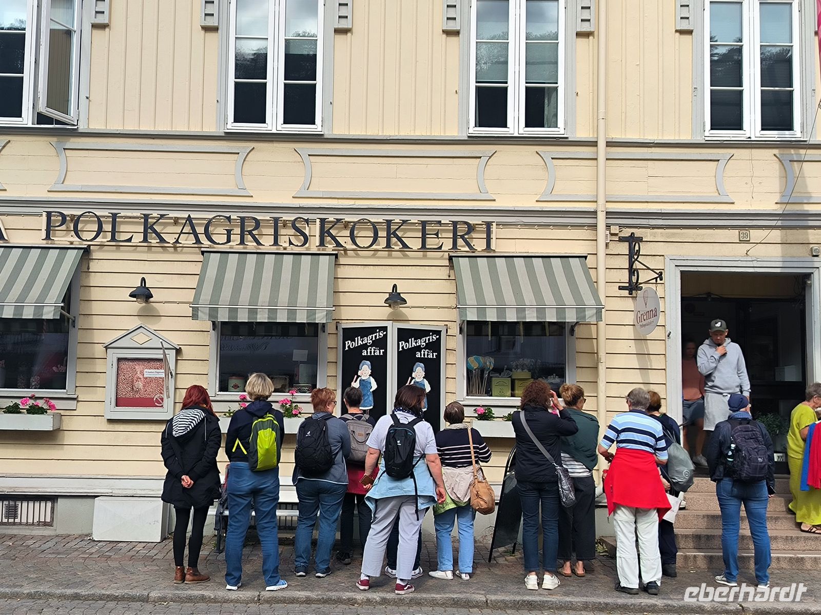 Happy Birthday, liebe Anke. Unser Ständchen kommt von Herzen. Danke, dass Du mit uns diesen besonderen Tag verbringst. Er beginnt mit einem Fotostopp an der Brahehus Ruine. Das wäre kein Lustschloss geworden, wenn damals schon die Autobahn daran vorbeigeführt hätte. Wir haben bei herrlichem Wetter einen großartigen Blick auf den Vätternsee und die Insel Visingsö. In Gränna schauen wir bei der Herstellung der süßen Polkagris zu. Die rot-weißen tanzenden Ferkelchen sind schöne Mitbringsel für zu Hause. Ein kurzer Aufstieg führt uns zum Freilichtmuseum mit Häusern aus längst vergangenen Zeiten und einem Panorama Ausblick auf Gränna.