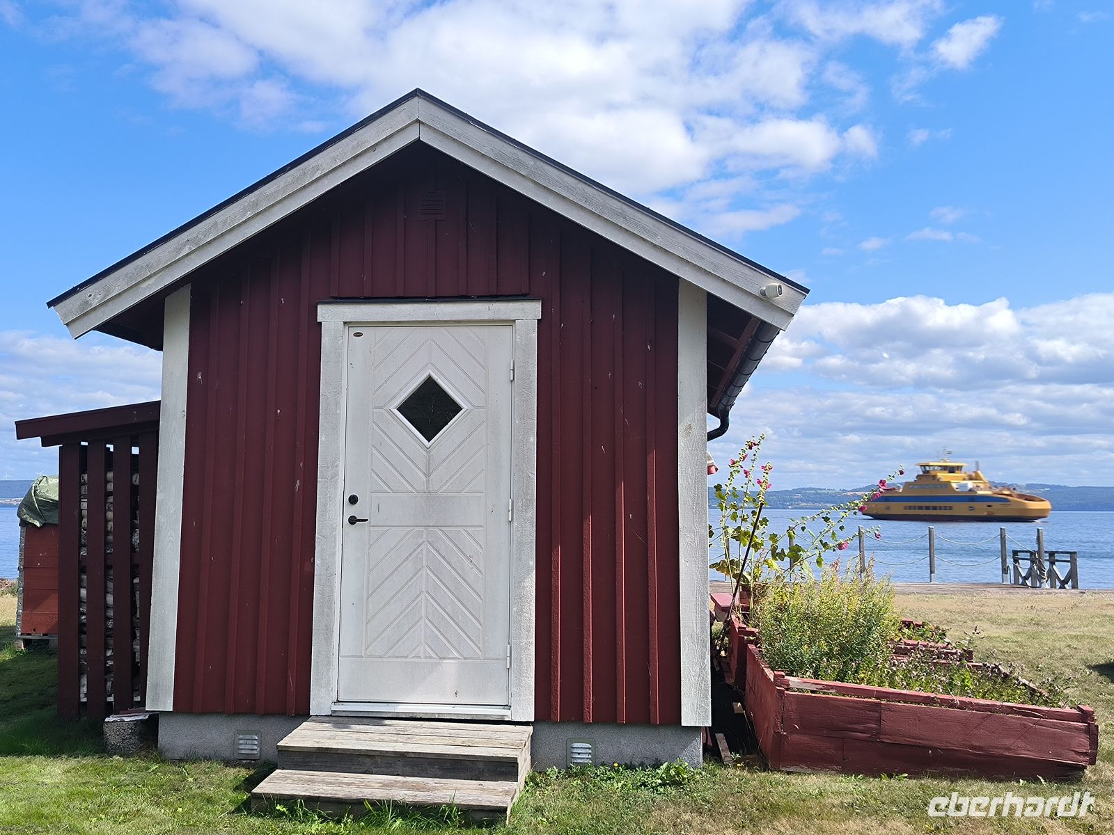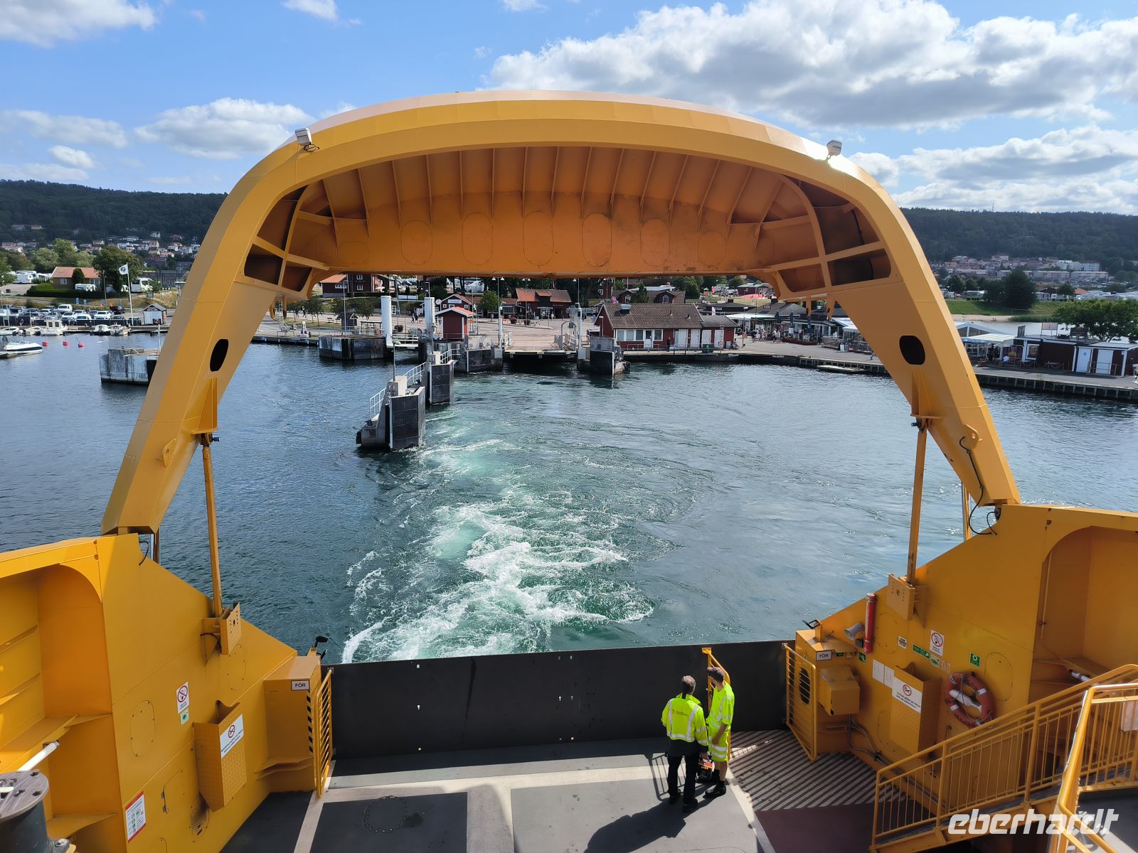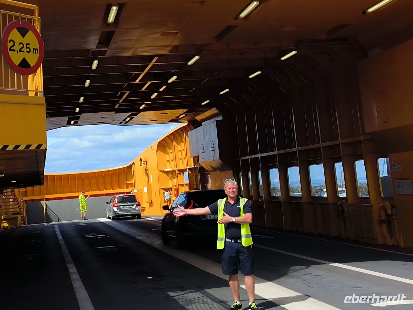 Auf der knallgelben Fähre werden wir freundlich von einem der schönsten blonden Schweden begrüßt. Wir nennen ihn mal Björn Johansson.