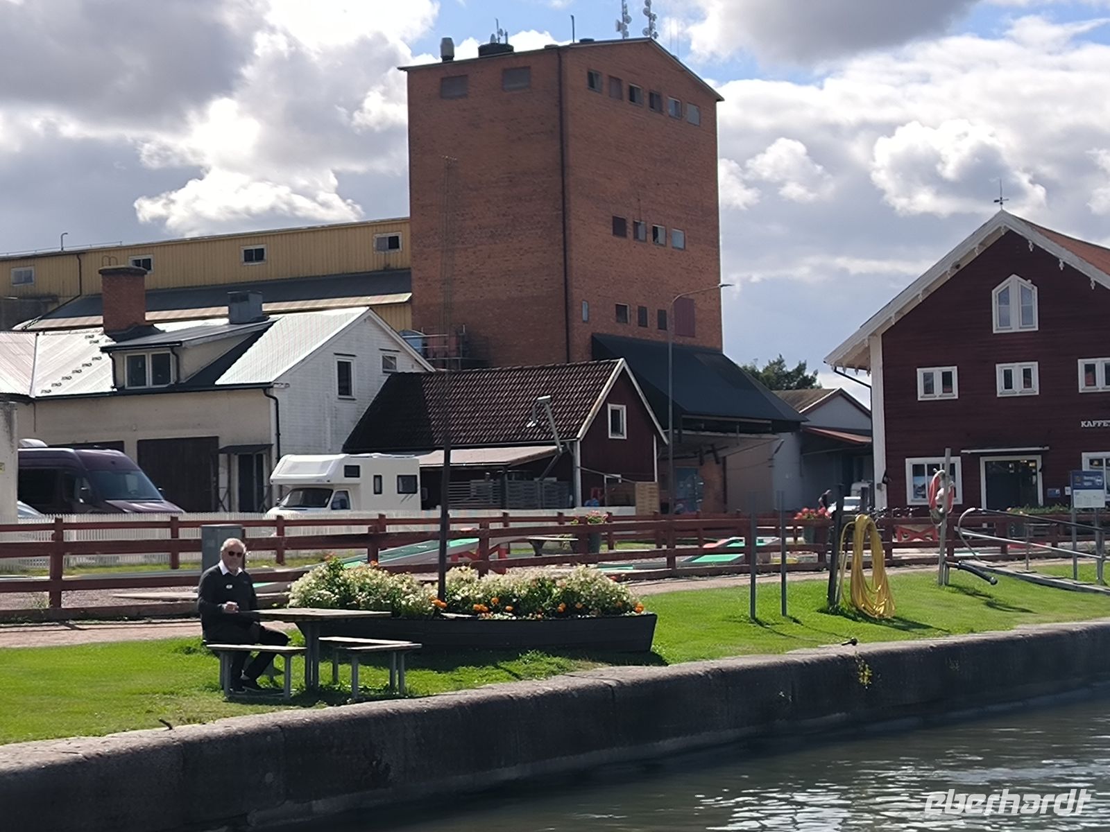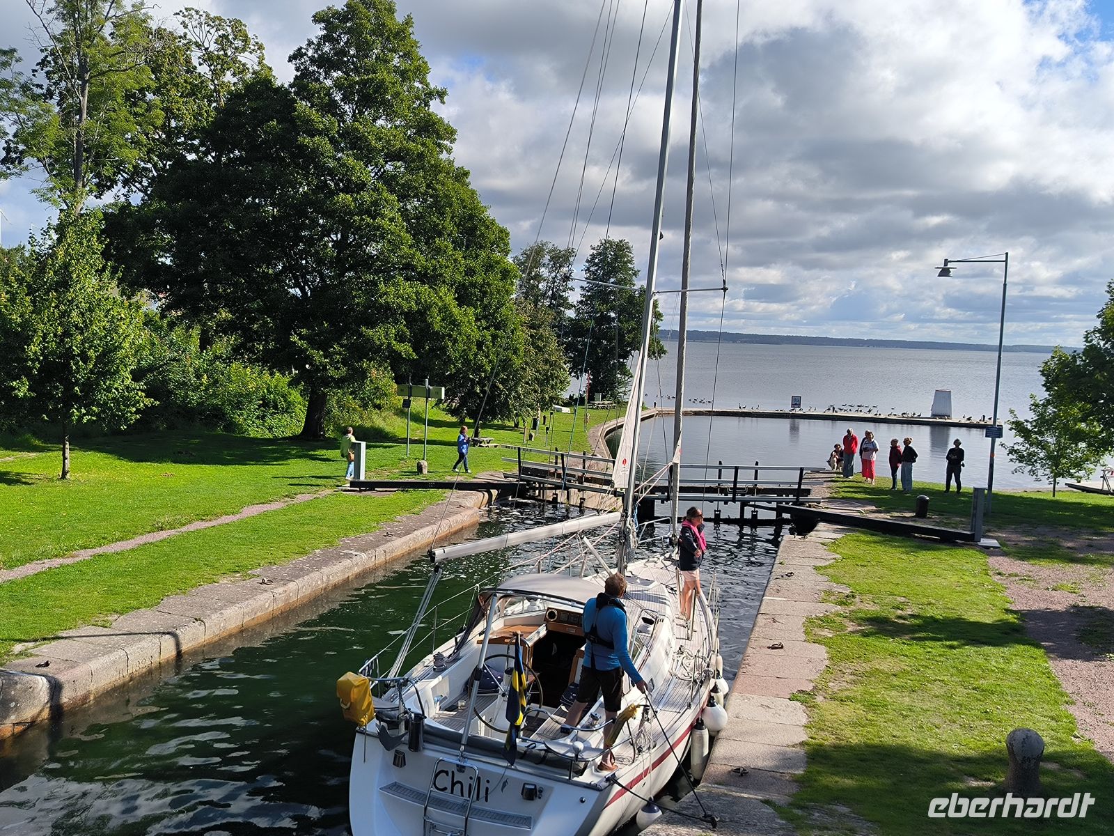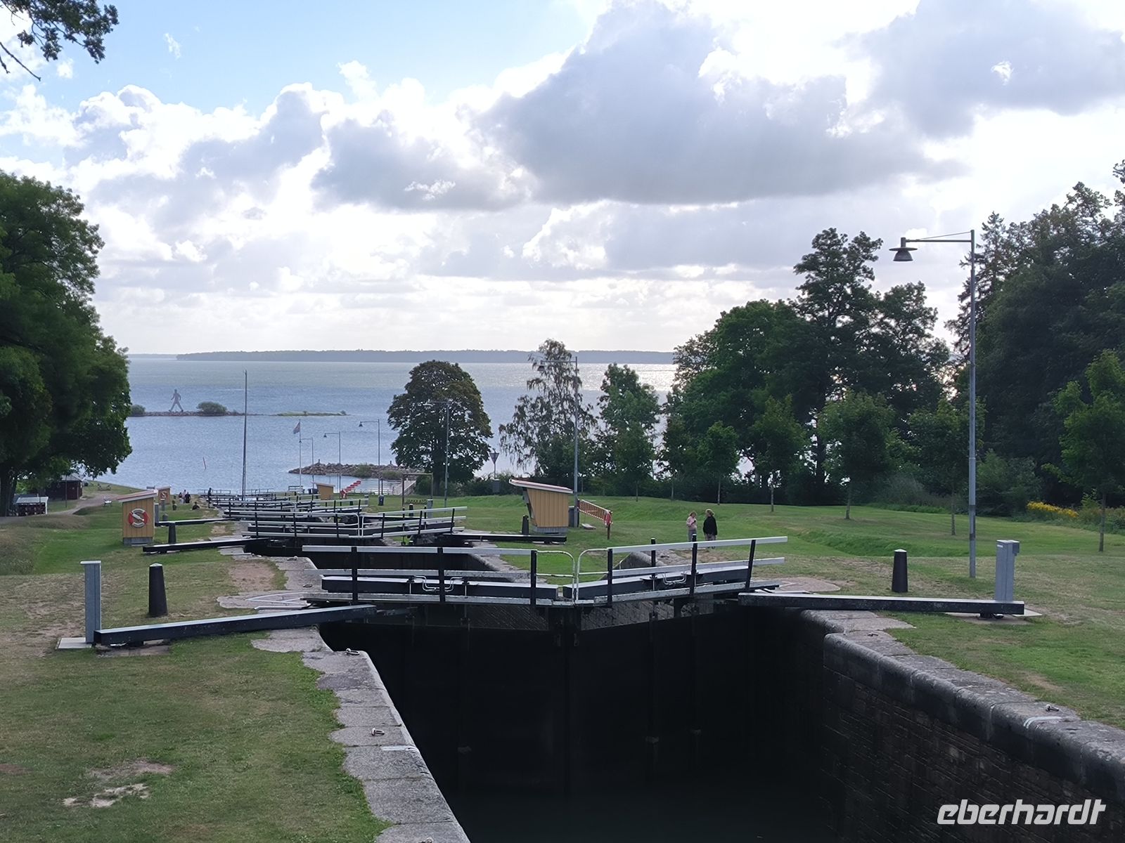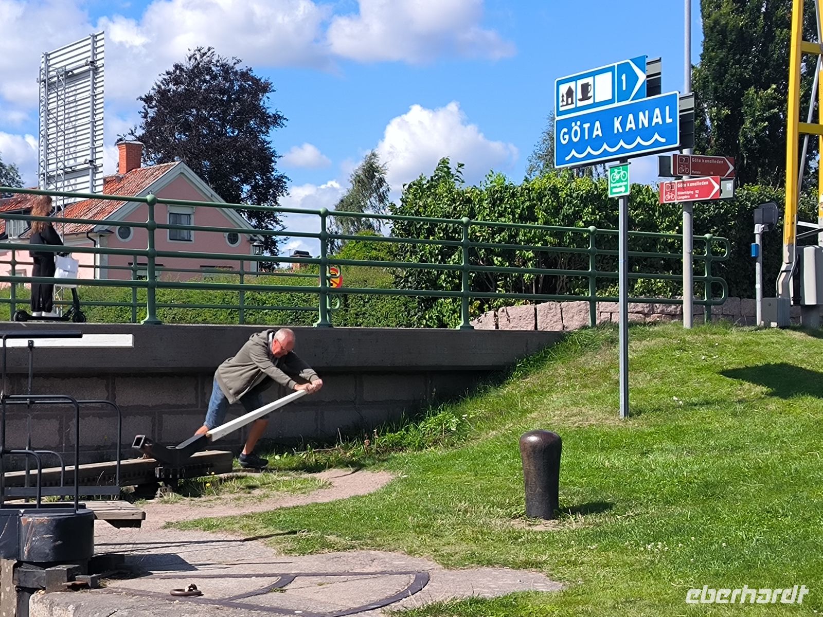 Niemand möchte diesen Ausflug verpassen. Wiederum bei blauem Himmel und weißen Dekowölkchen schauen wir uns an der fünfstufigen Schleuse von Borenshult bei Motala am Göta Kanal den Vorgang noch einmal von außen an.