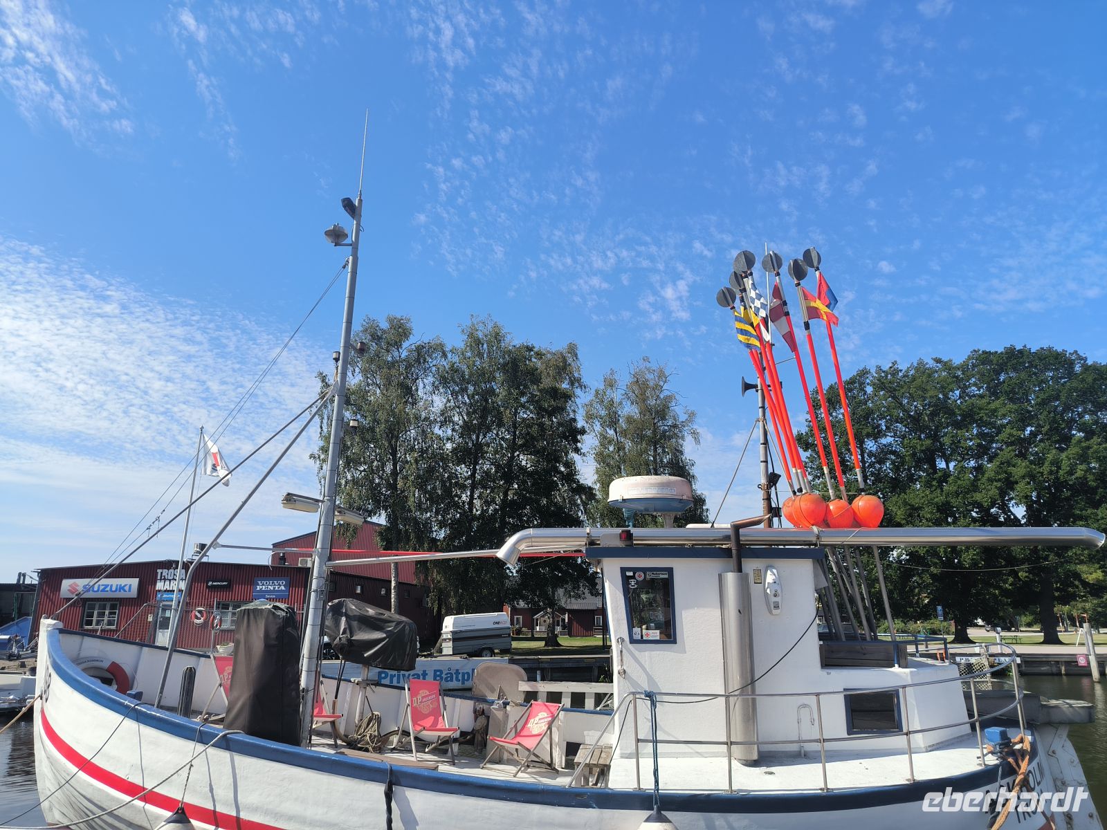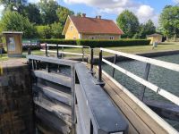 Unser Bus bringt uns am Morgen den kurzen Weg bis nach Berg. Hier befindet sich die berühmte Schleusentreppe am Göta Kanal. Mit unserem Ausflugsboot schippern wir den Kanal entlang, durchqueren ca. zehn Schleusen und zählen die Schafe am Wegesrand. Auch ein Schwimmer kommt vorbei, aber nicht im Floatinganzug, den sich eine von uns so sehr wünscht.
