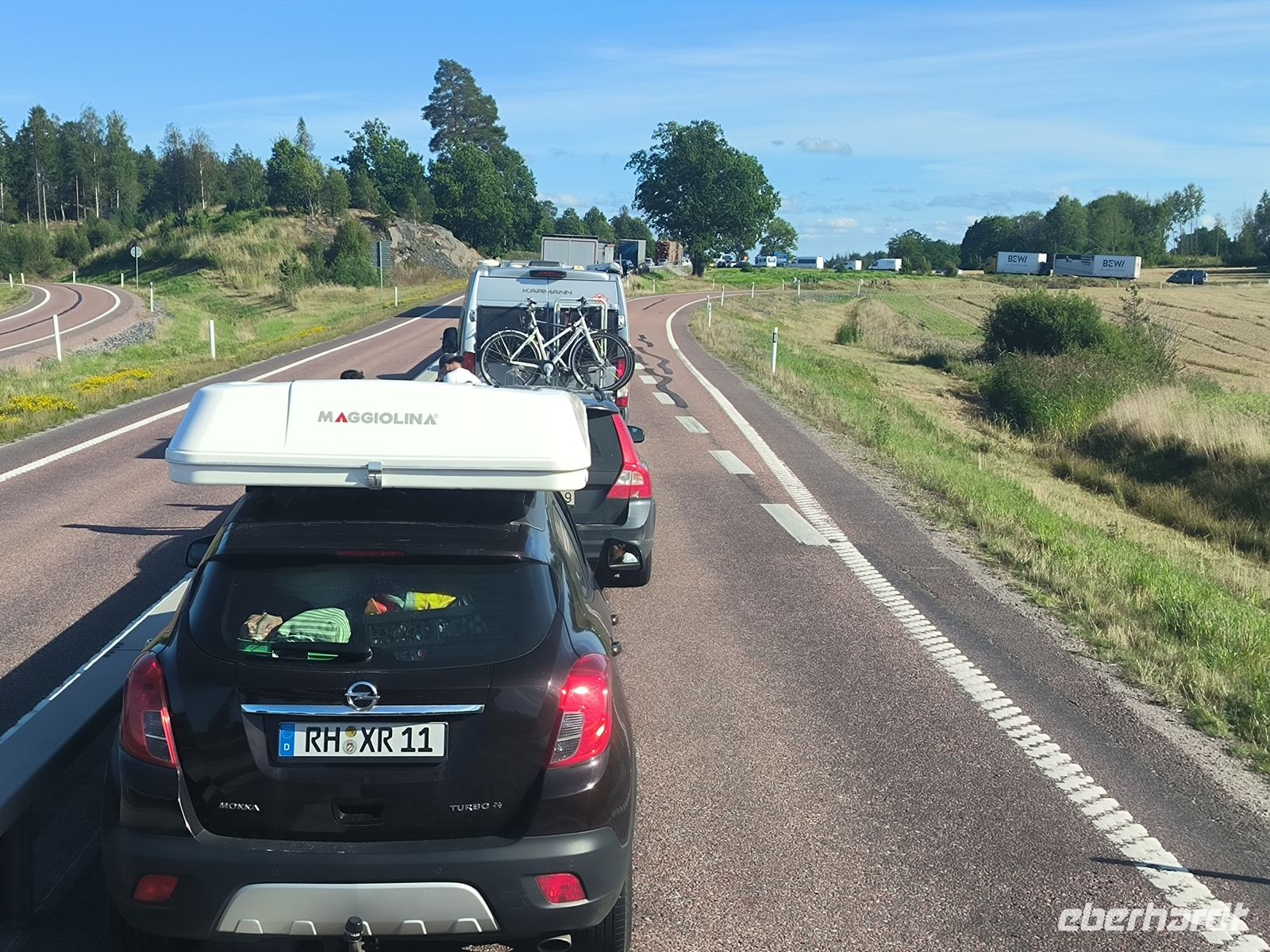 Auf dem Rückweg erleben wir noch einen schwedischen Stau. Ein Pkw und ein Bus sind kollidiert. Aber augenscheinlich ist niemand ernsthaft verletzt und so nehmen auch wir - gesund und munter - die Wartezeit in Kauf.