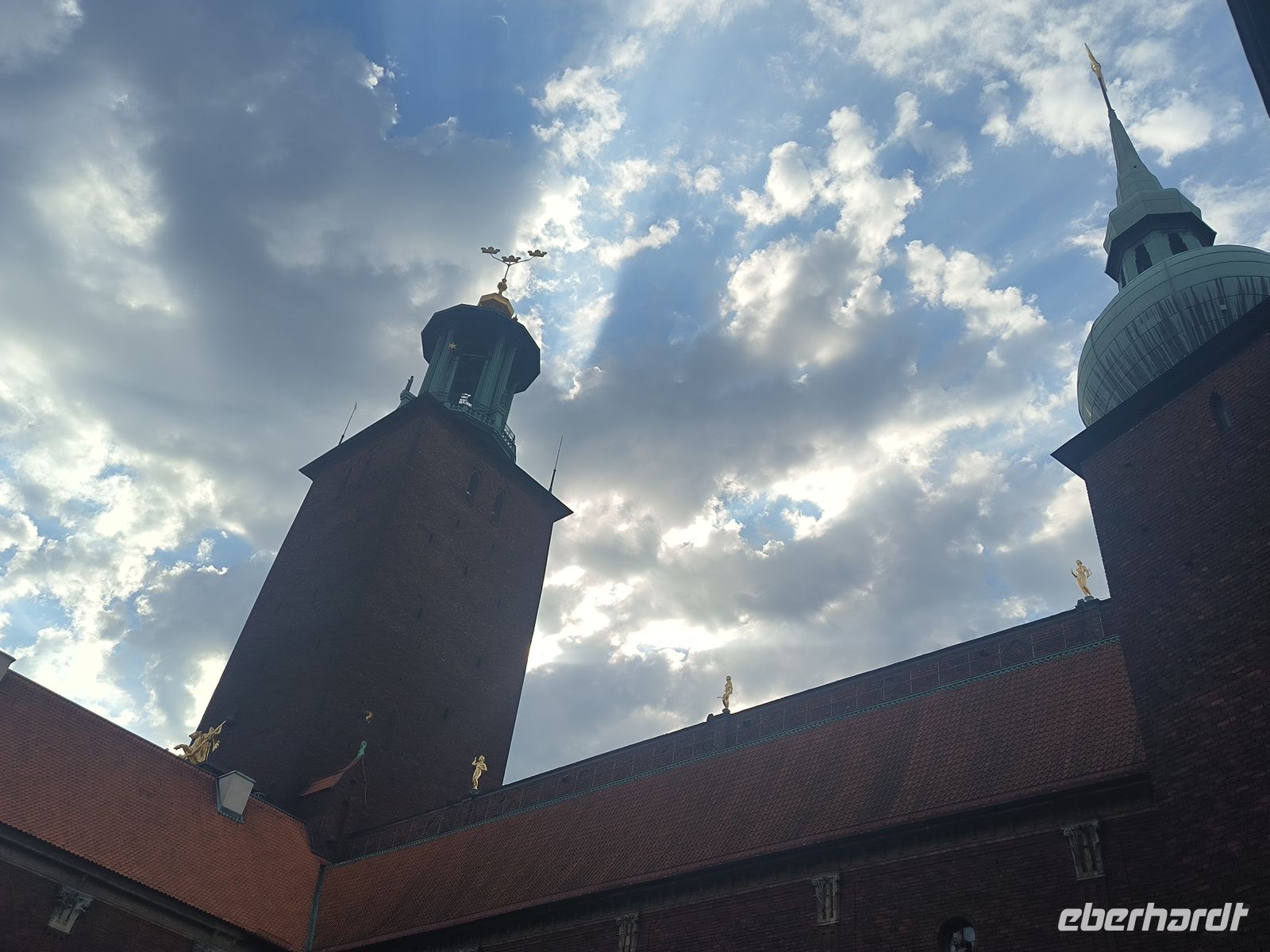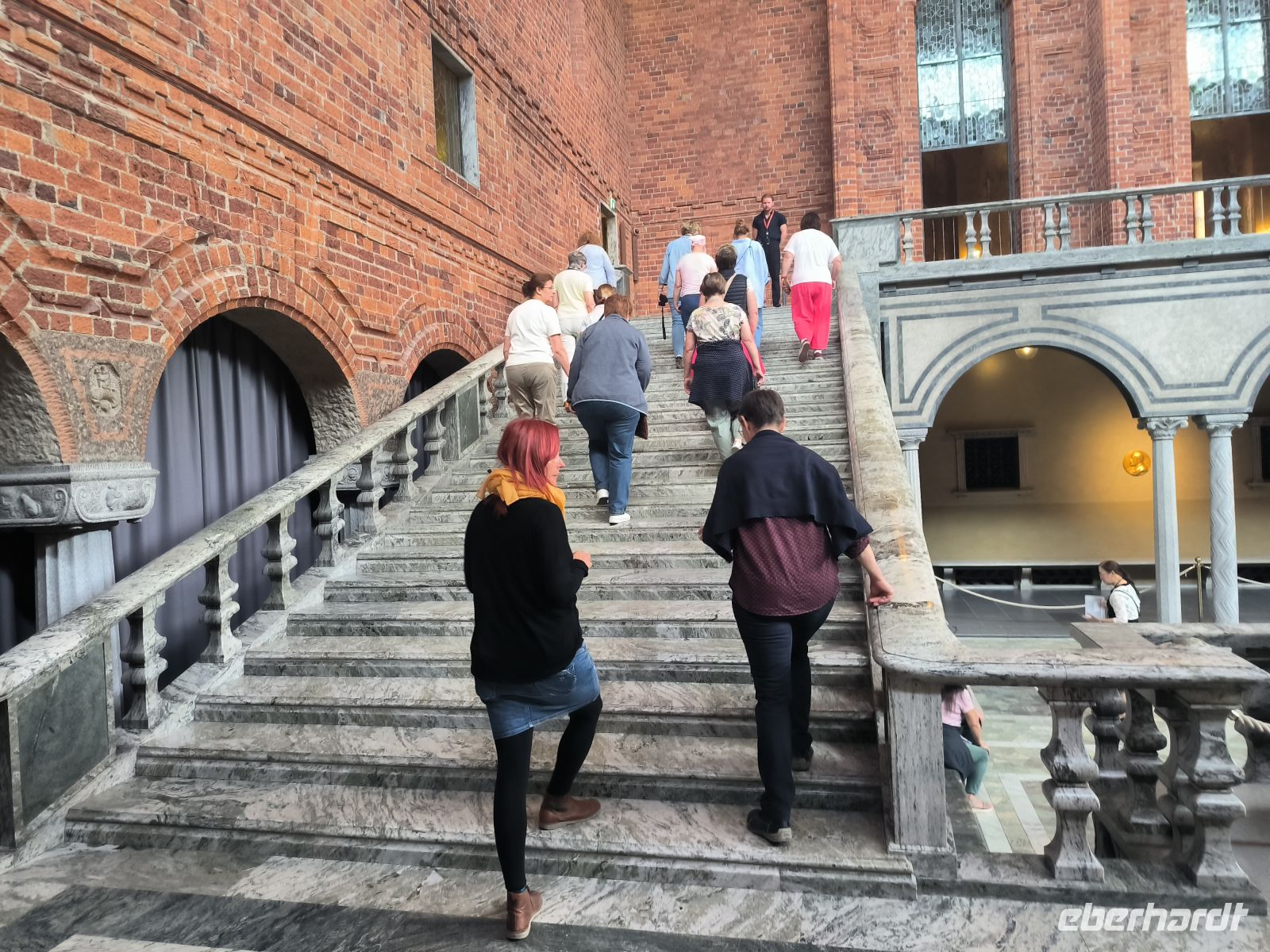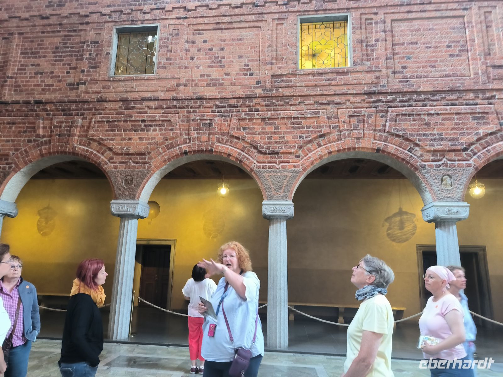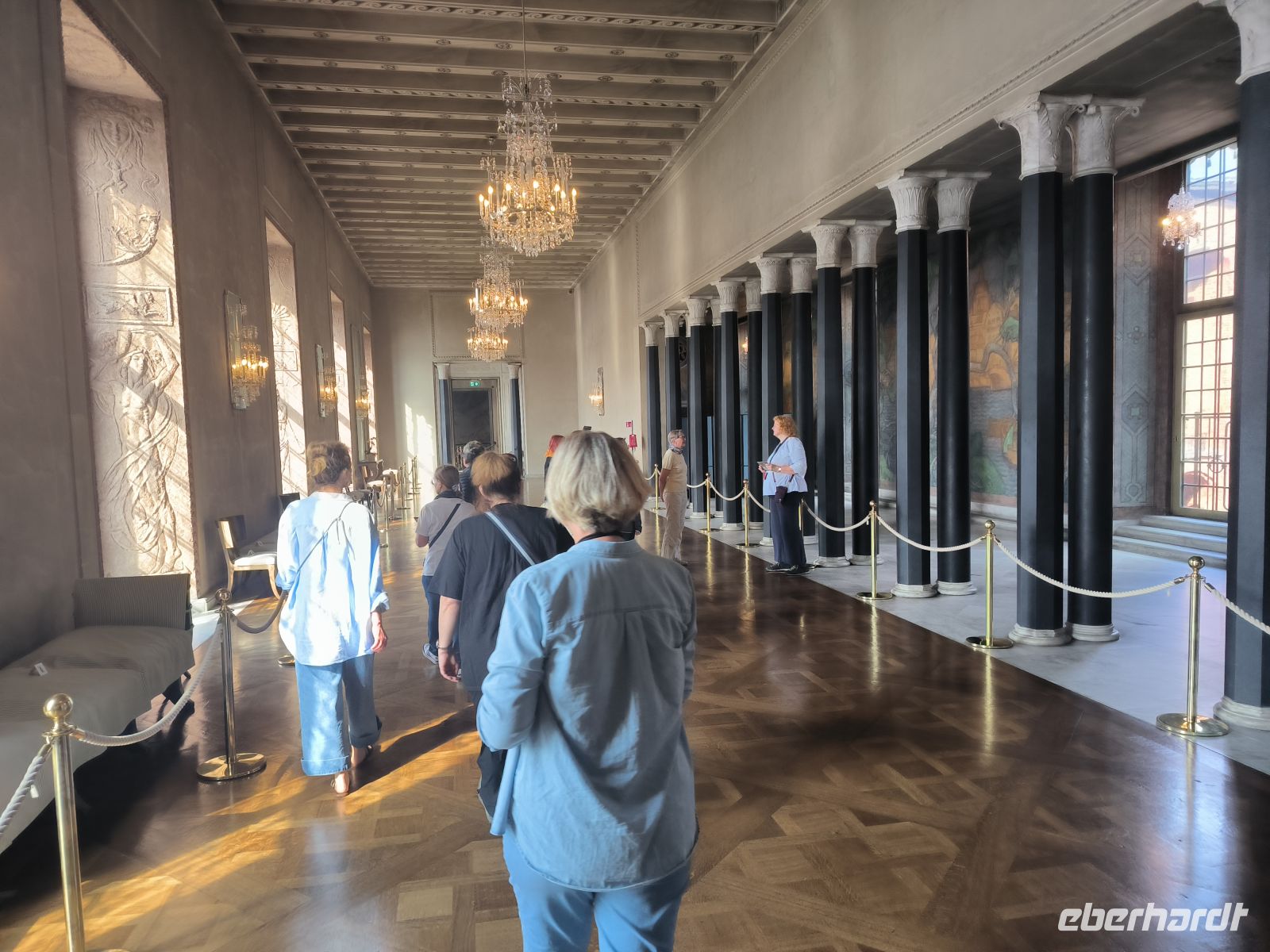 Punkt 9 Uhr treffen wir Katrin, unsere heutige Stadtführerin. Sie kommt aus der Schweiz, lebt aber seit über 30 Jahren in Stockholm und stellt uns gern ihre zweite Heimat vor. Mit dem Bus fahren wir zum Stadshuset, dem Stadthaus. Hier finden u.a. die großen Feierlichkeiten zur Verleihung der Nobelpreise statt. Der blaue Saal ist nicht blau, im roten Saal wird regiert und im goldenen Saal ist alles Gold, was glänzt.