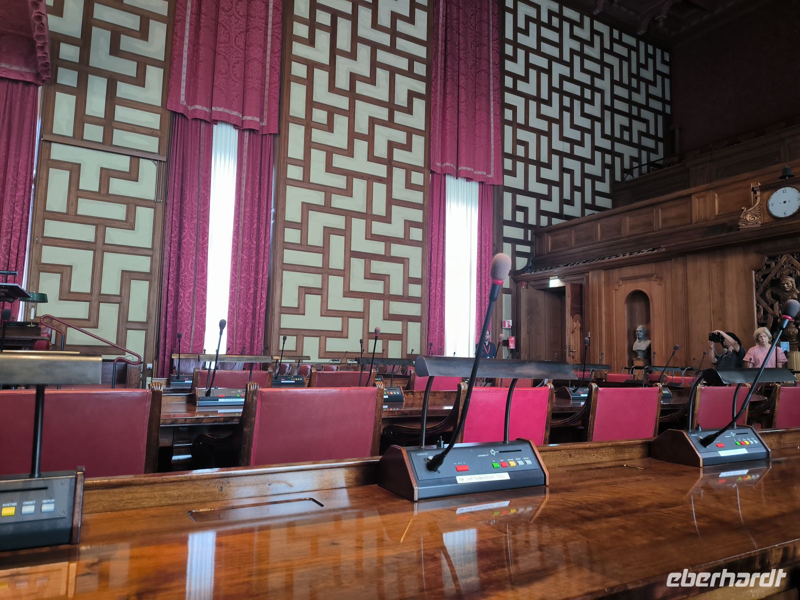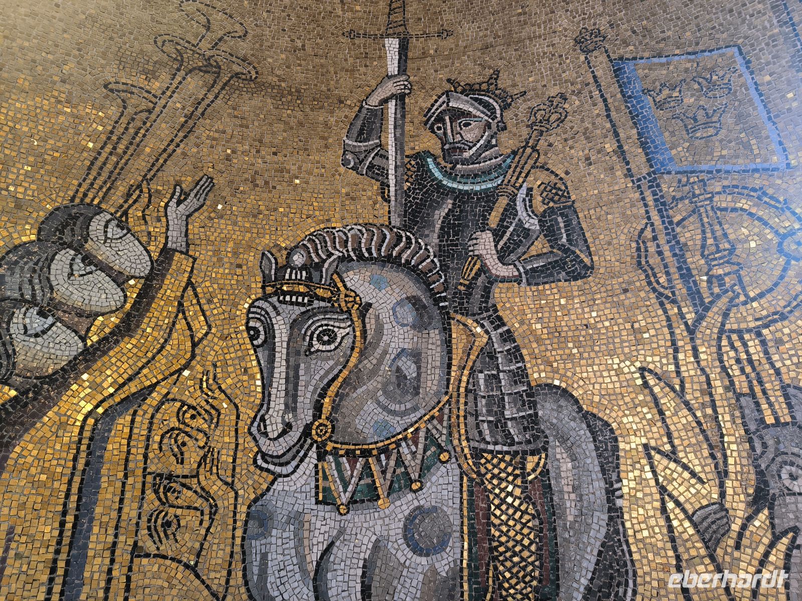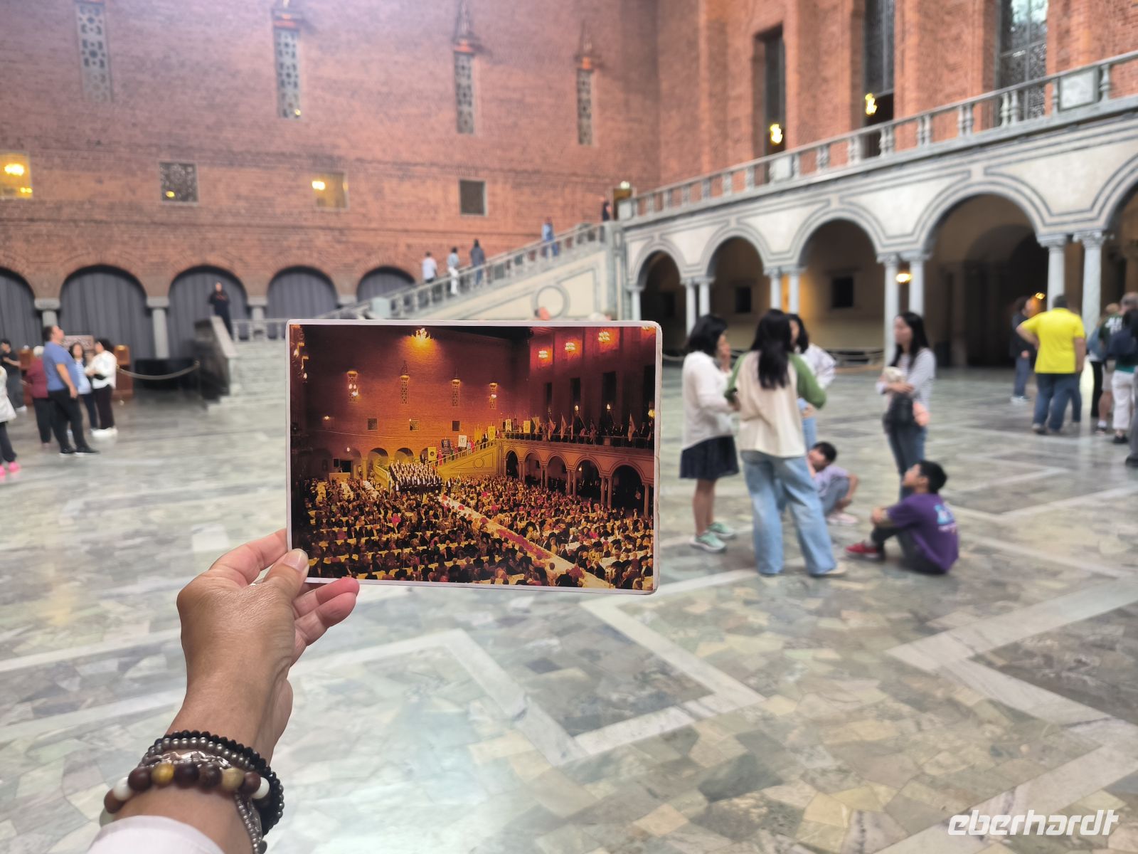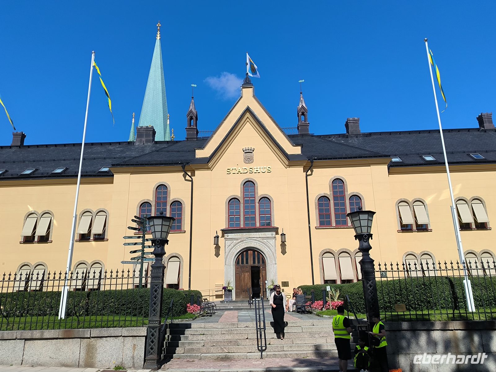 Punkt 9 Uhr treffen wir Katrin, unsere heutige Stadtführerin. Sie kommt aus der Schweiz, lebt aber seit über 30 Jahren in Stockholm und stellt uns gern ihre zweite Heimat vor. Mit dem Bus fahren wir zum Stadshuset, dem Stadthaus. Hier finden u.a. die großen Feierlichkeiten zur Verleihung der Nobelpreise statt. Der blaue Saal ist nicht blau, im roten Saal wird regiert und im goldenen Saal ist alles Gold, was glänzt.