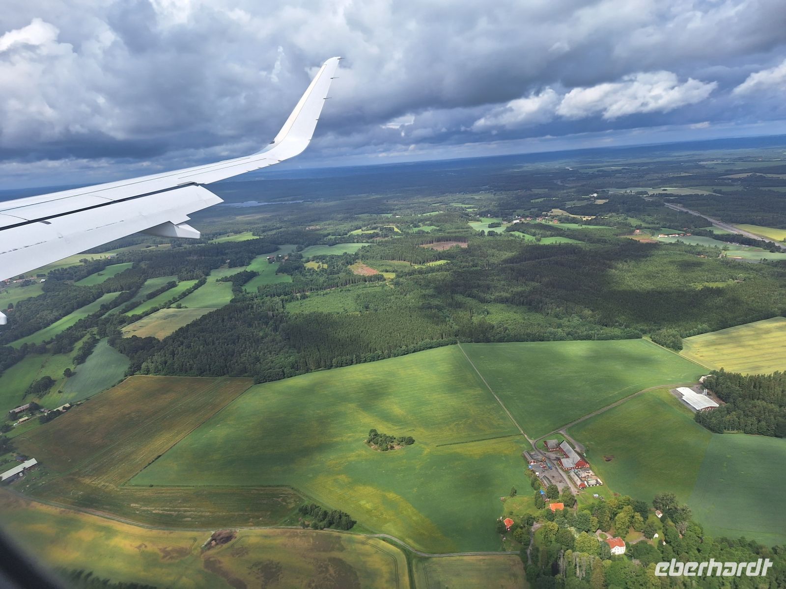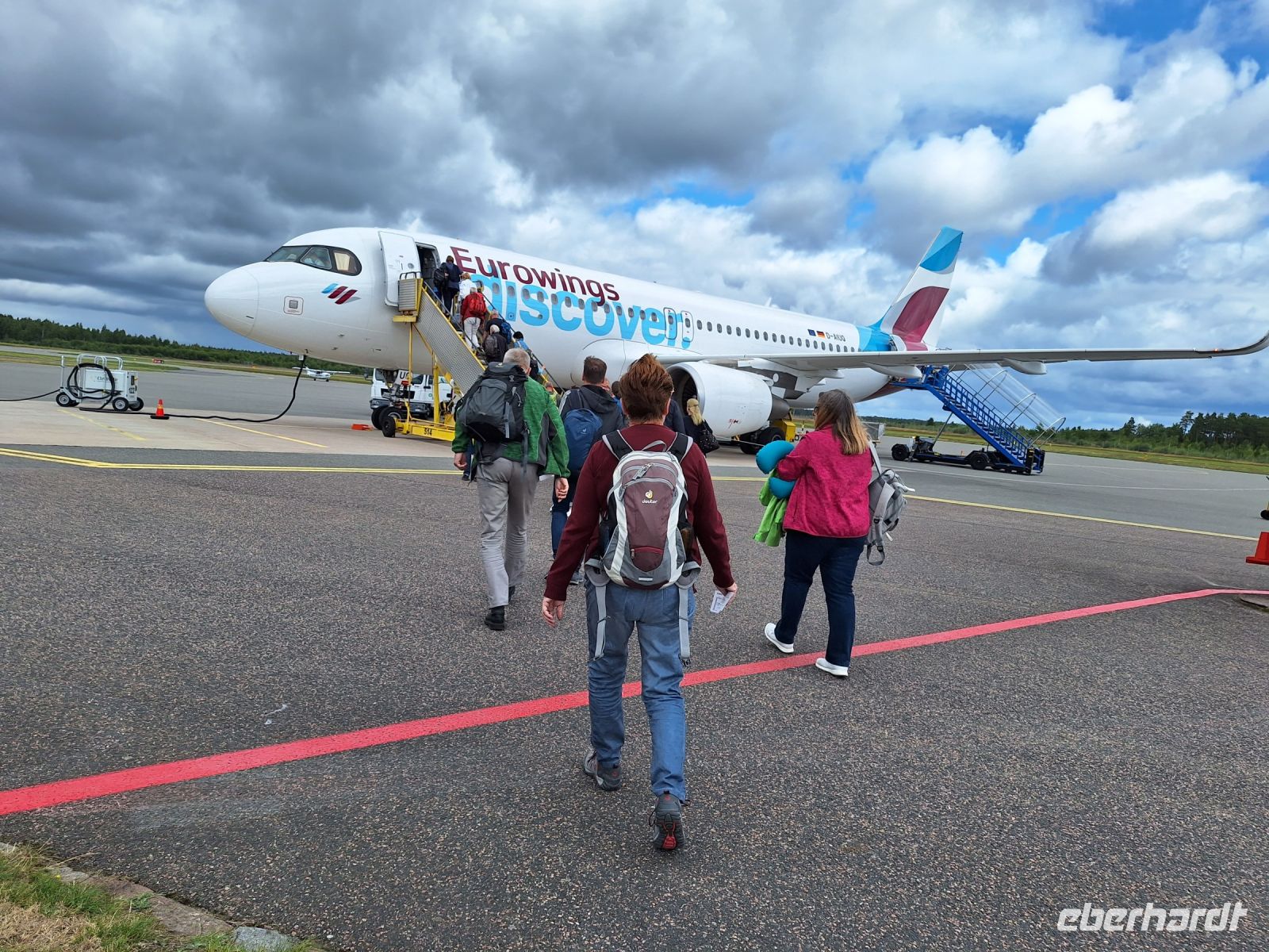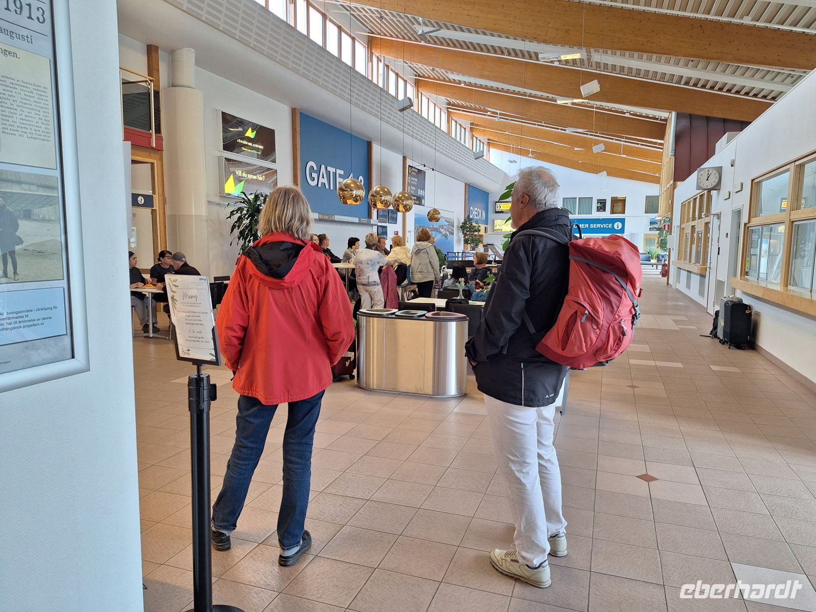 Also lernen wir zunächst den Frankfurter Flughafen kennen bei einer „Wanderung“ vom Ankunftsgate zum Gepäckband, dann mit Koffern zum Ausgang, zurück in die letzte Halle im Abflugbereich, stehen in der Schlange. Und jetzt wird es spannend: keiner der Reisegäste ist im Computer bei Eurowings zu finden. Einige Zeit und mehrere Telefonate der Reiseleiterin später dann tauchen wie von Geisterhand unsere Namen auf den Bildschirmen auf und wir schicken unsere Koffer nach Schweden. Da hat wohl jemand vergessen, aufs richtige Knöpfchen zu drücken. Nun heißt es aber Beeilung, schnell durch die Sicherheitskontrolle und zum Gate. Dort treffen wir endlich die anderen Gäste der Gruppe, die uns schon vermisst haben.