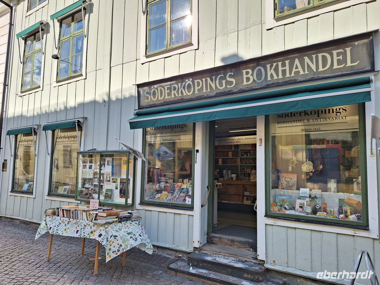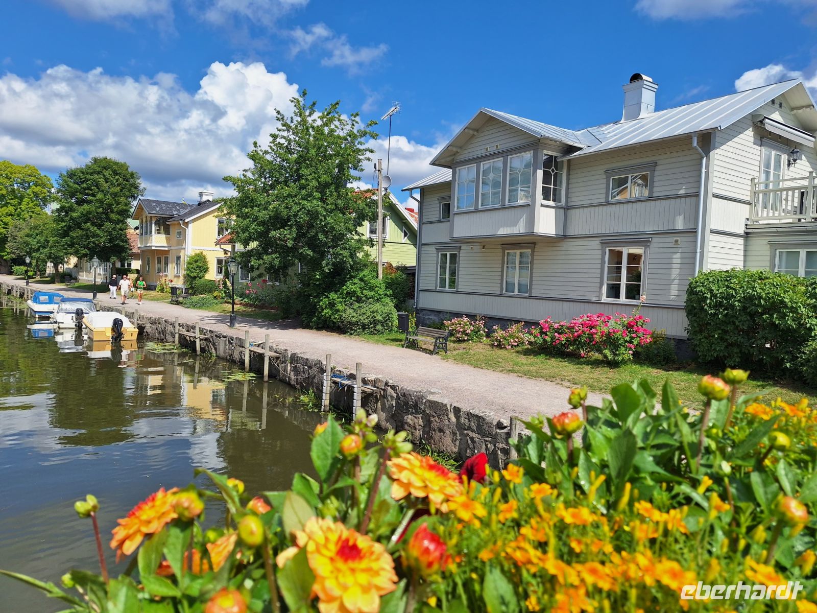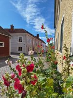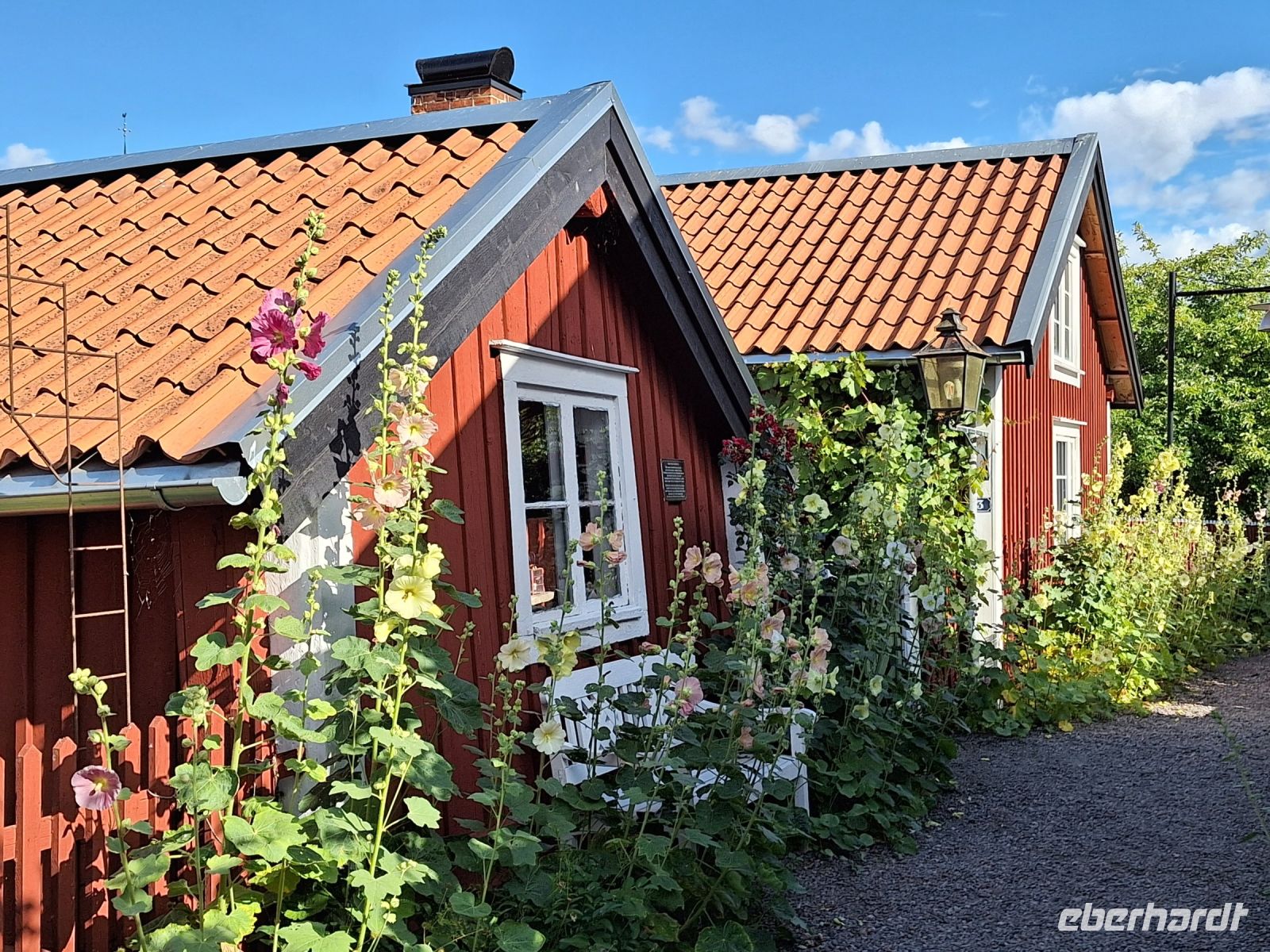 Zurück in Tyrislöt wartet schon der Bus, der uns nach Söderköping bringt, wo Stefanie uns durch den mittelalterlichen Stadtkern führt, der auch wieder am Göta-Kanal liegt. So schließt sich ein Kreis und wir können noch einmal diese typisch schwedischen Holzhäuser, hier hinter herrlich blühenden Stockrosen, bestaunen.