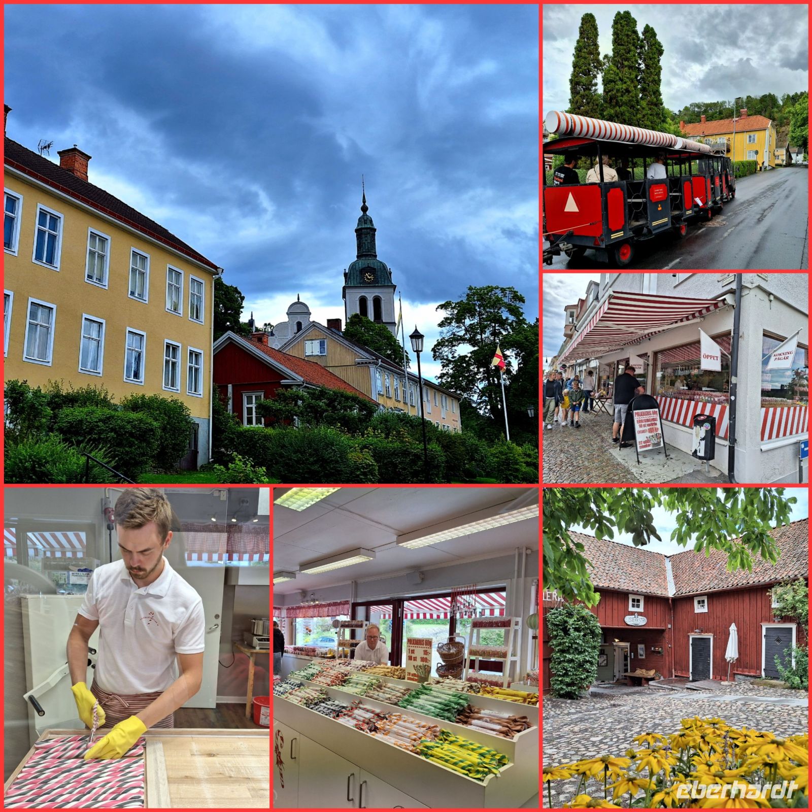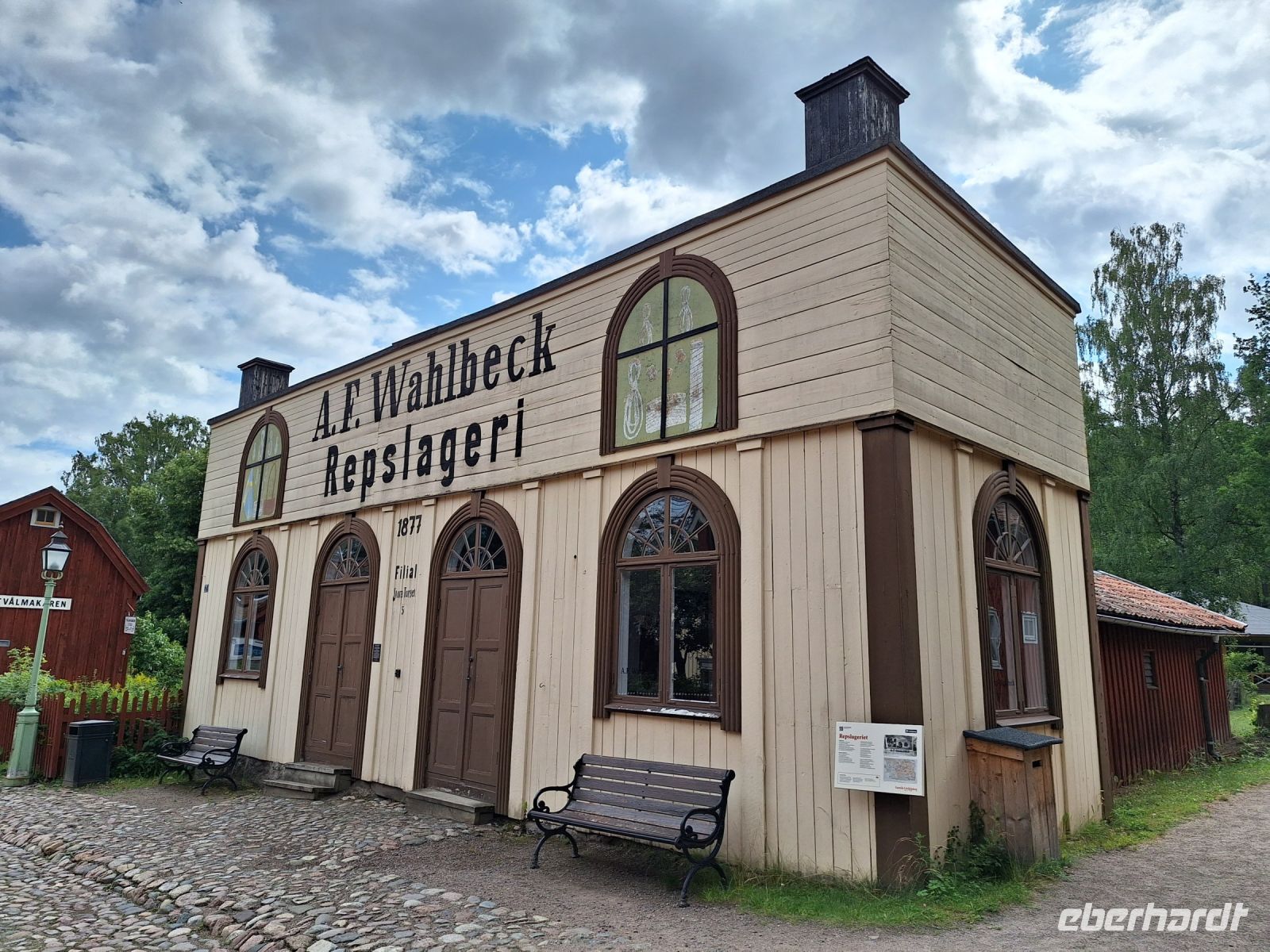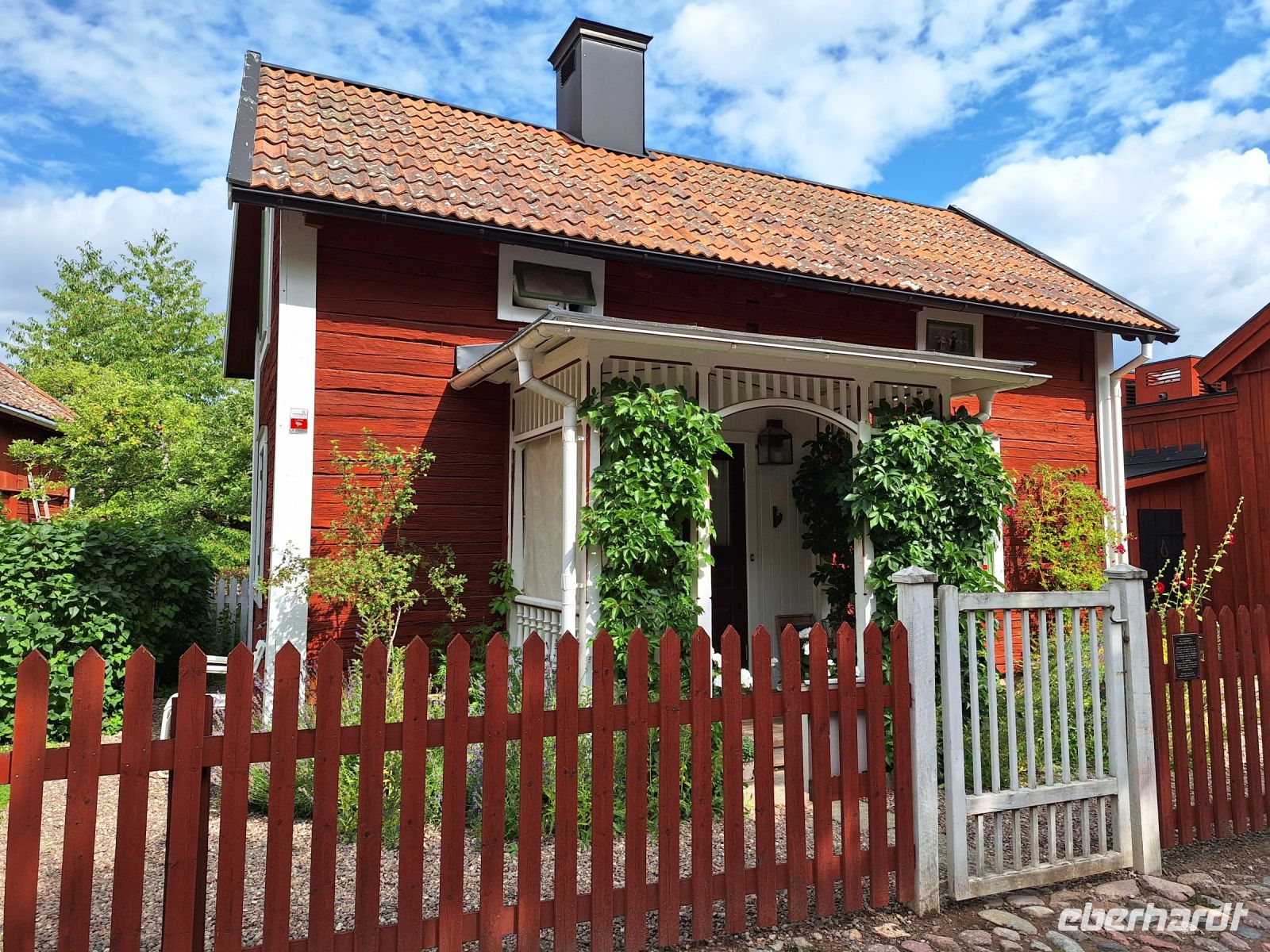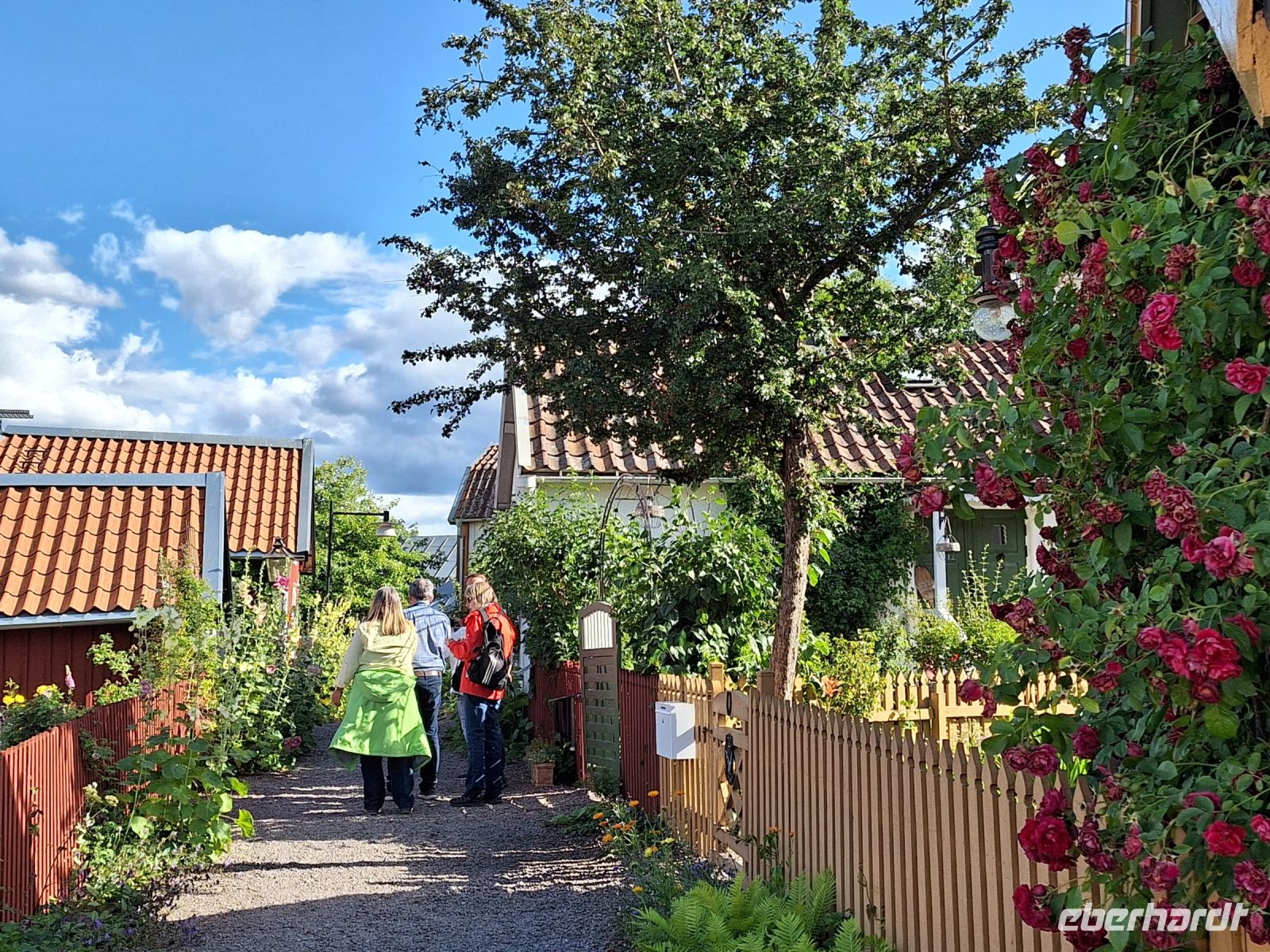 Hier wurden bis zu 250 Jahre alte Holzhäuser zu einer fiktiven und doch sehr realen Siedlung aufgestellt. Am Marktplatz finden sich kleine Geschäfte, Bankkontor und Restaurants. Neben den Straßen mit holprigen Pflastersteinen schauen wir über die roten Gartenzäune in blühende Gärten auf wunderschöne, heute teilweise noch bewohnte Häuser. Darin verbergen sich historische Handwerksstätten, eine Arbeiterwohnung aus den 1920er Jahren, die Mädchenschule und eine Apotheke. Es ist eine kleine Zeitreise in Schwedens Vergangenheit. Als ein paar Regentropfen fallen, genießen wir noch einen Kaffee im Café Dahlberg und dann erreicht uns die Nachricht, daß der Bus repariert werden konnte.