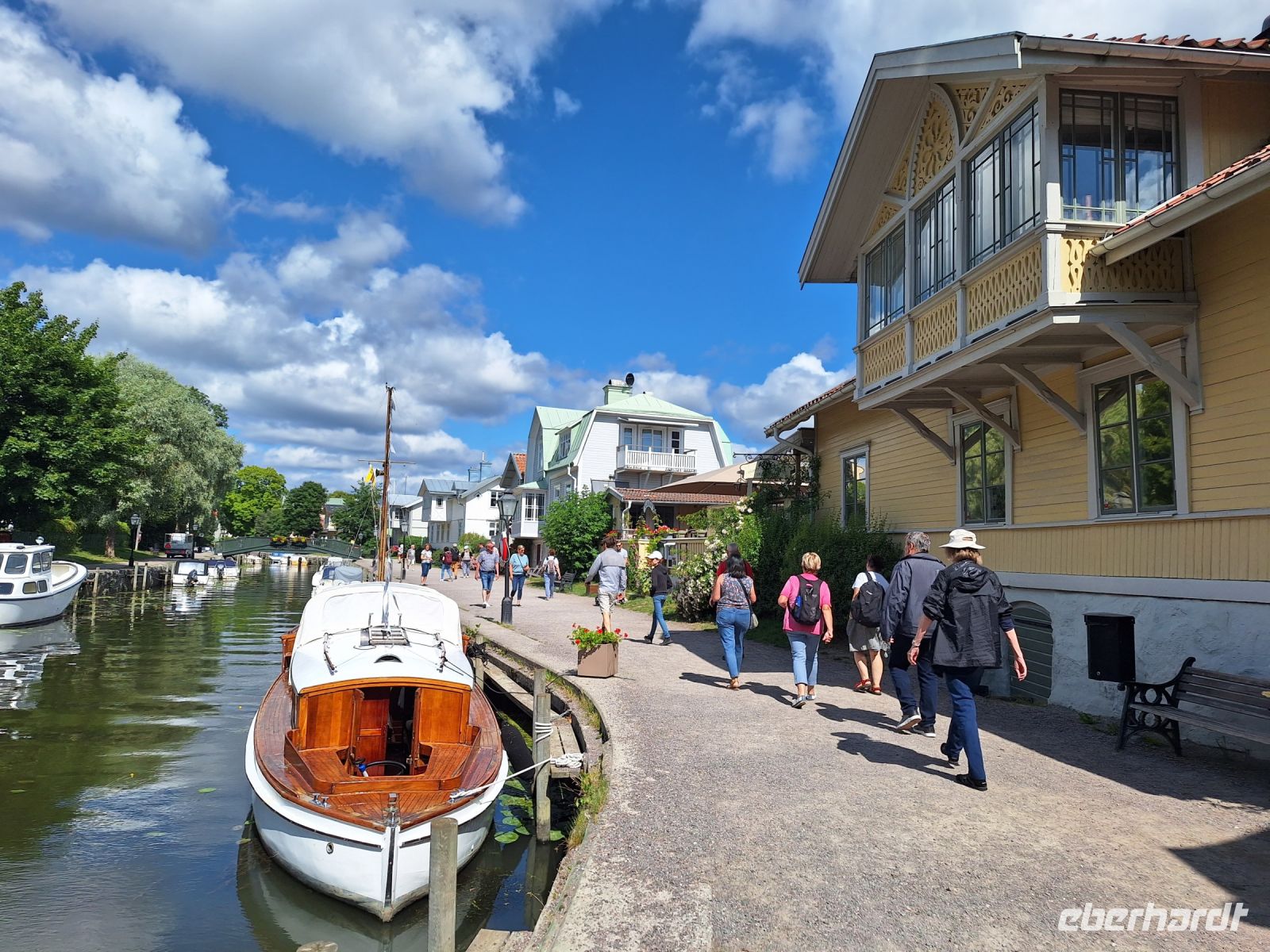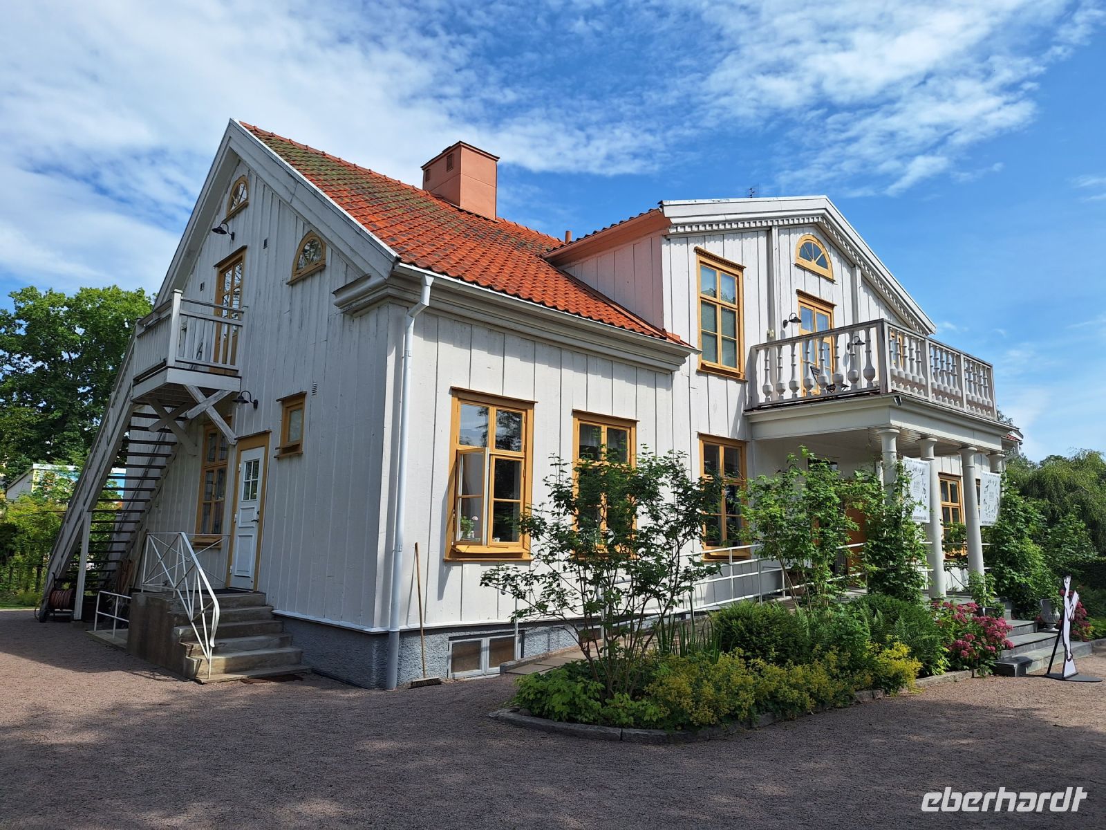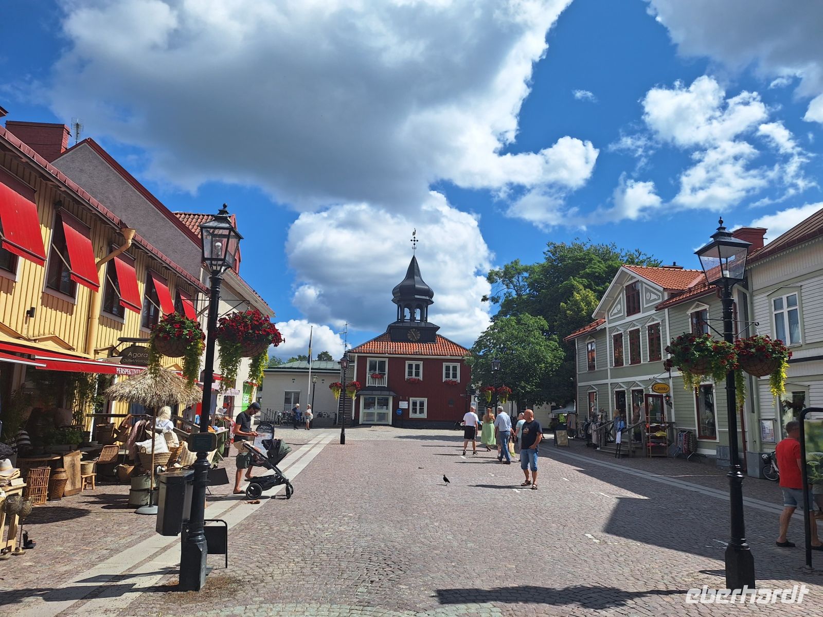 Hier wurden bis zu 250 Jahre alte Holzhäuser zu einer fiktiven und doch sehr realen Siedlung aufgestellt. Am Marktplatz finden sich kleine Geschäfte, Bankkontor und Restaurants. Neben den Straßen mit holprigen Pflastersteinen schauen wir über die roten Gartenzäune in blühende Gärten auf wunderschöne, heute teilweise noch bewohnte Häuser. Darin verbergen sich historische Handwerksstätten, eine Arbeiterwohnung aus den 1920er Jahren, die Mädchenschule und eine Apotheke. Es ist eine kleine Zeitreise in Schwedens Vergangenheit. Als ein paar Regentropfen fallen, genießen wir noch einen Kaffee im Café Dahlberg und dann erreicht uns die Nachricht, daß der Bus repariert werden konnte.