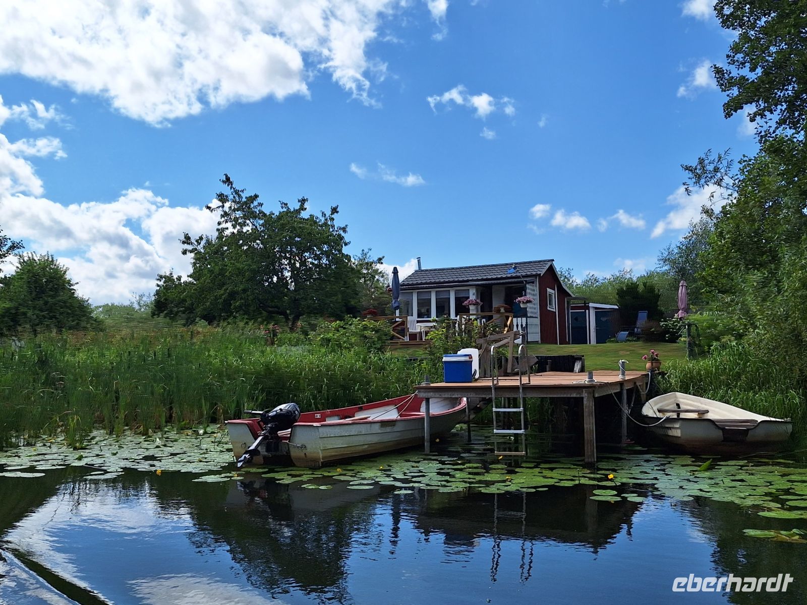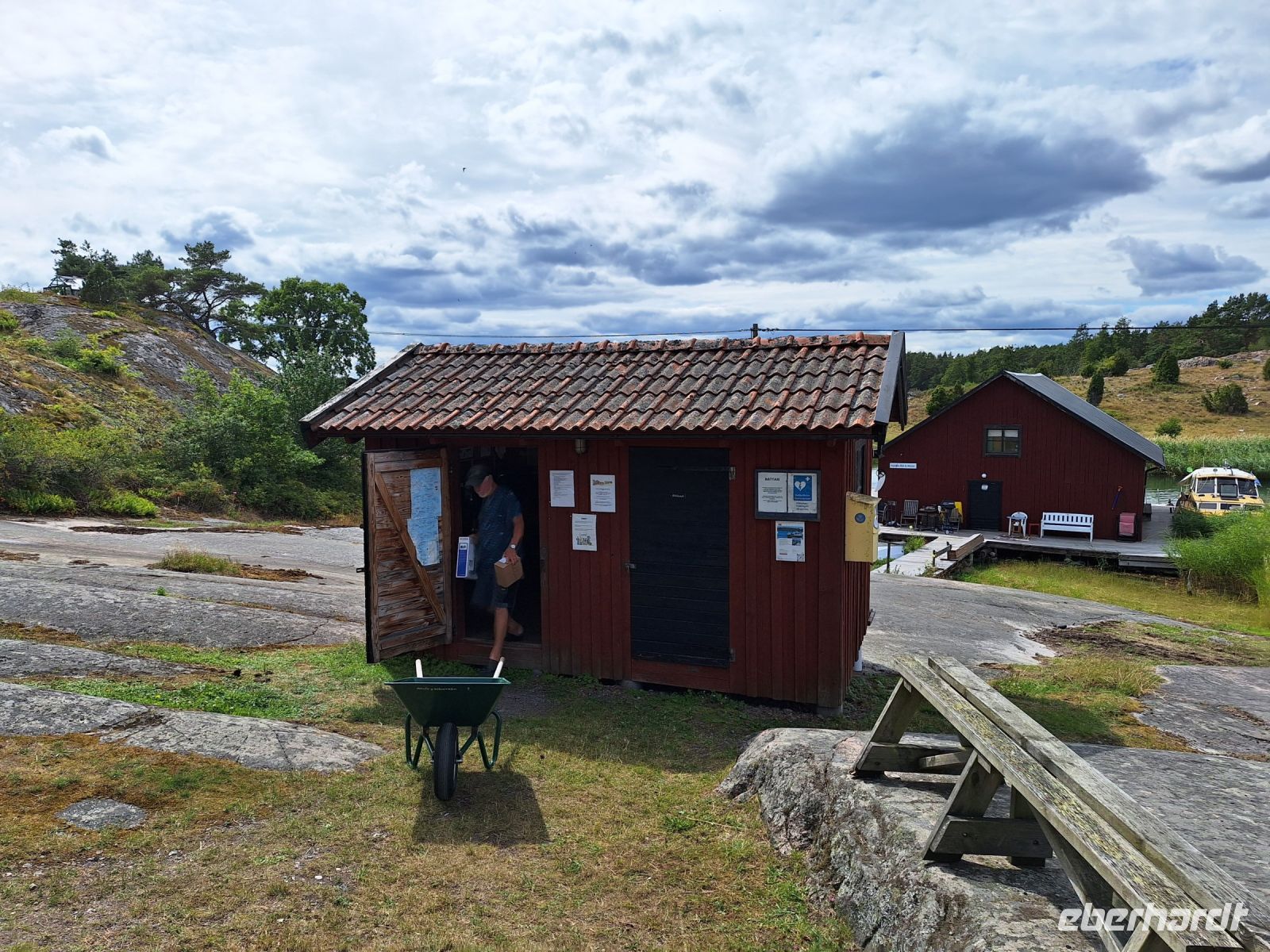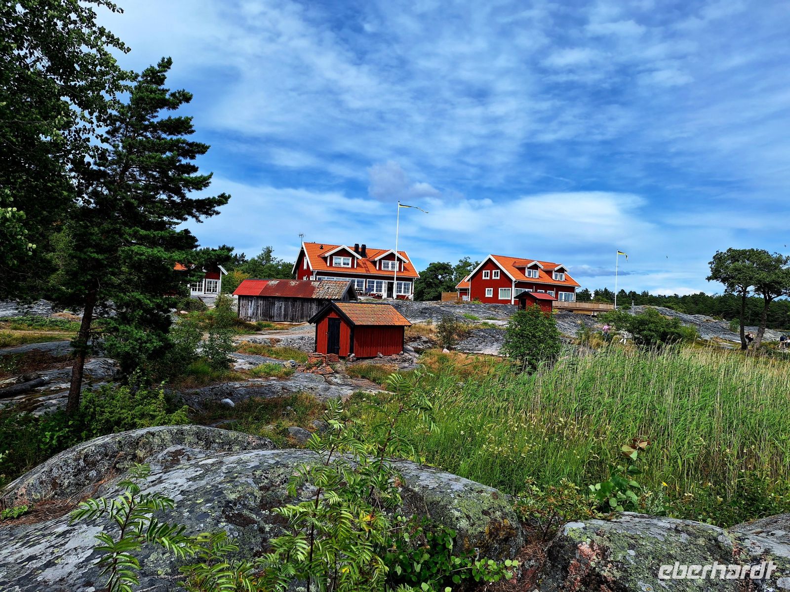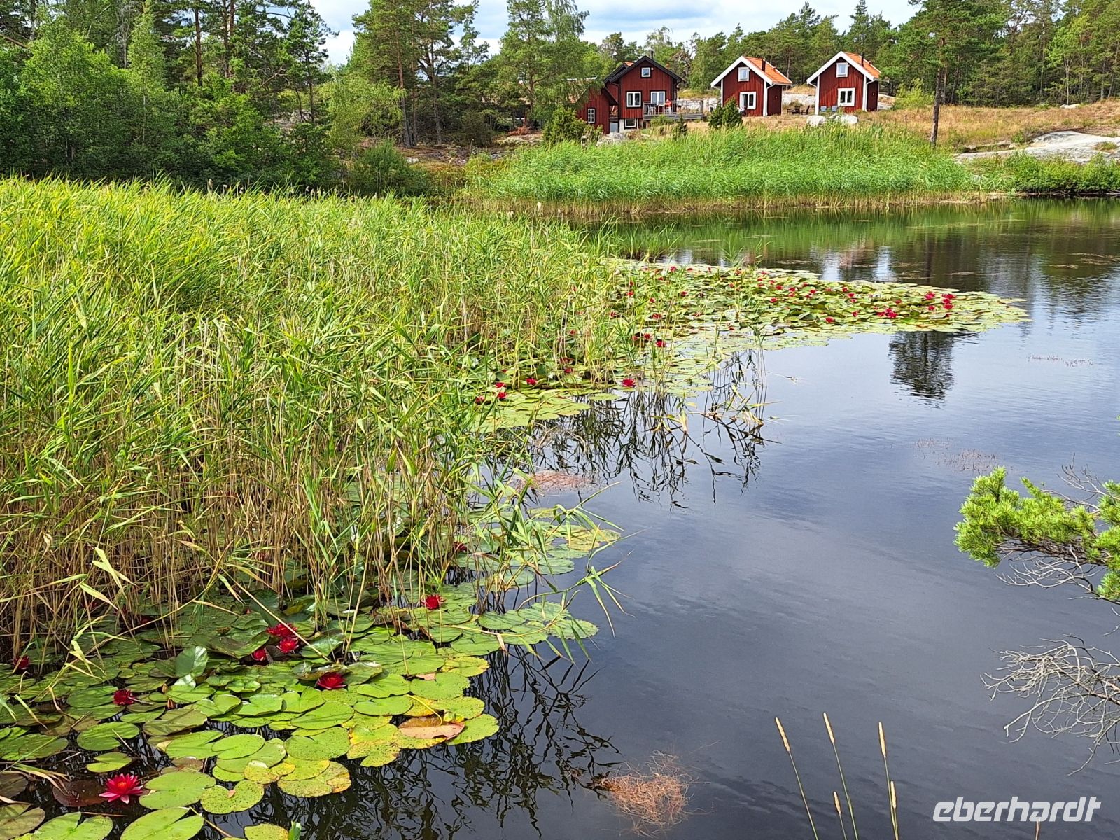 Auf der Insel Harstena angekommen, sind wir wirklich im Paradies. Rote Holzhäuschen, Restaurant und Fischräucherei am Hafen. Zur Bäckerei laufen wir einen Kilometer und lassen uns dort Kaffee und frisch gebackenen Kuchen schmecken. Die tiefroten Seerosen gibt es nur dort, wir klettern über die Felsen und genießen die Ausblicke auf das Wasser. Am blauen Himmel hängen weiße Deko-Wolken. Es ist still, kein Autoverkehr stört die Idylle. Das Postboot ist angekommen. Ein Inselbewohner holt seine Post aus dem kleinen Häuschen mit den Briefkästen. Er hat die Schubkarre dabei, damit er seine Päckchen nicht zum Haus schleppen muss. Uns fallen romantische Lindström-Geschichten ein, die hier spielen könnten.