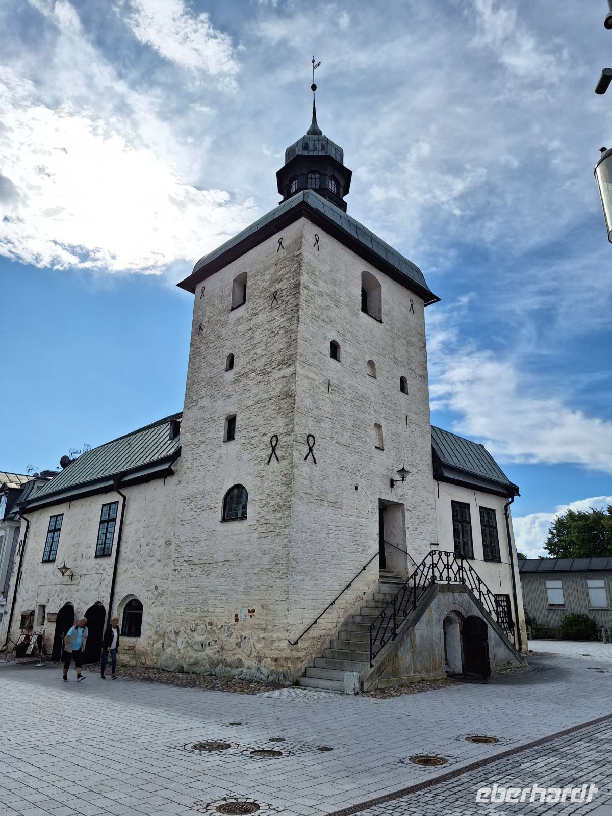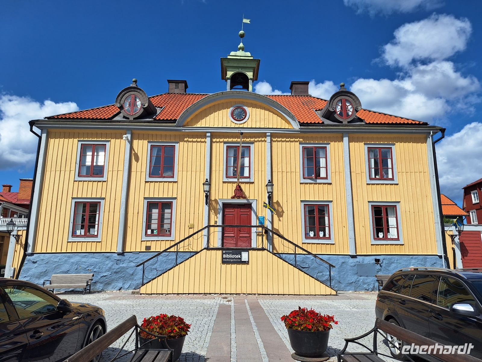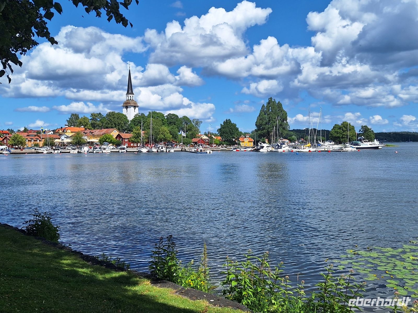Die für uns heute letzte Perle am Vättern heißt Vadstena. Direkt am See liegt das Schloss. Angesichts des breiten Wassergrabens und der Zugbrücke können wir uns vorstellen, daß es im 16. Jahrhundert auch gut als Verteidigungsanlage diente. Die weithin sichtbare Klosterkirche ist ein beliebter Wallfahrtsort. Und die dritte historische Sehenswürdigkeit ist das Rathaus. Es ist seit ca. 1490 im Dienst und damit das älteste in Schweden. Wie wir hören, gibt es dort u. a. einen Bierkeller und ein Gefängnis. Ist das nicht eine perfekte Kombination?
