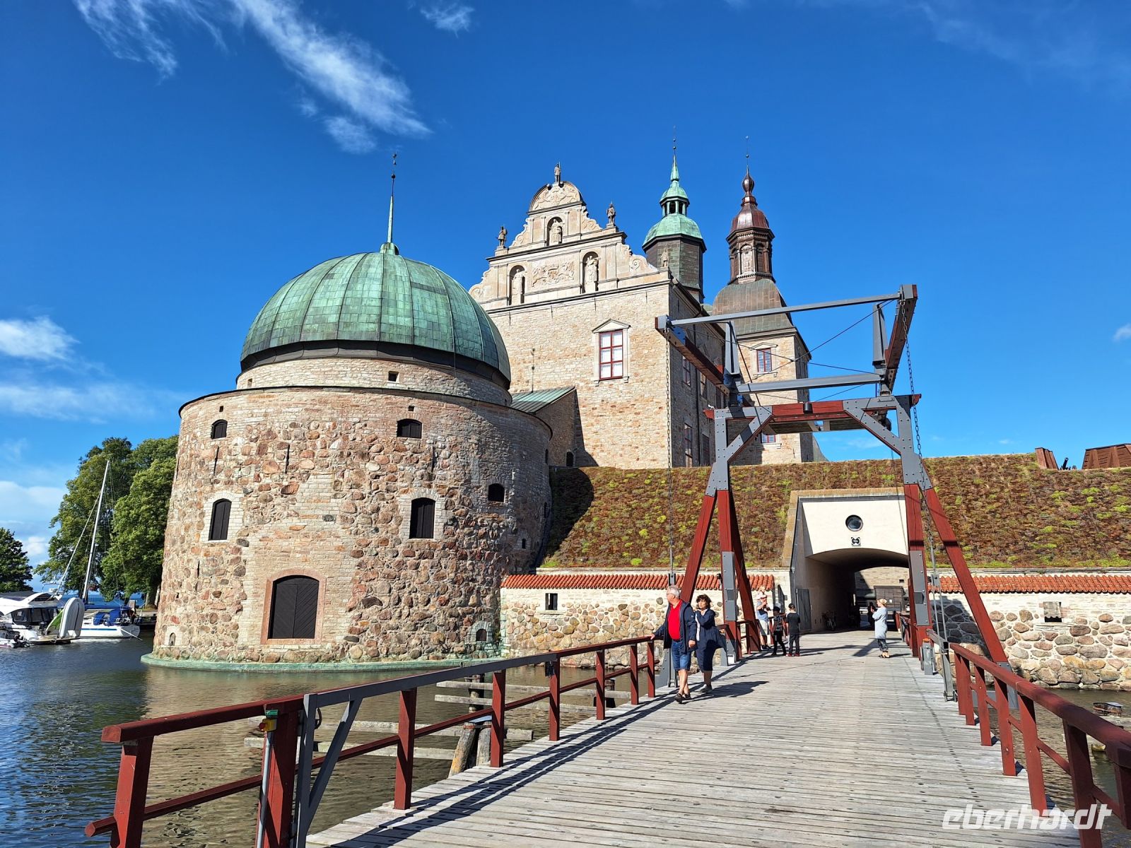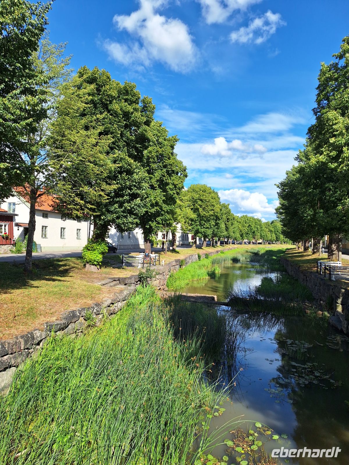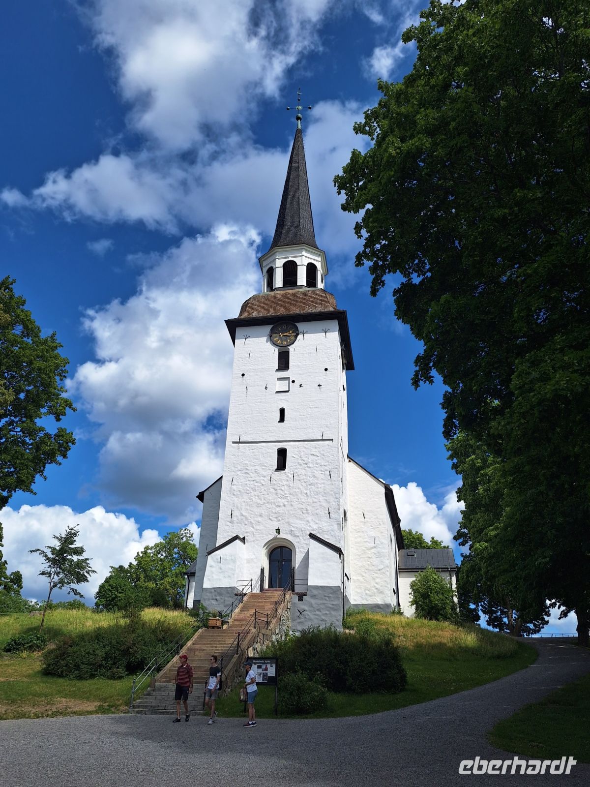Die für uns heute letzte Perle am Vättern heißt Vadstena. Direkt am See liegt das Schloss. Angesichts des breiten Wassergrabens und der Zugbrücke können wir uns vorstellen, daß es im 16. Jahrhundert auch gut als Verteidigungsanlage diente. Die weithin sichtbare Klosterkirche ist ein beliebter Wallfahrtsort. Und die dritte historische Sehenswürdigkeit ist das Rathaus. Es ist seit ca. 1490 im Dienst und damit das älteste in Schweden. Wie wir hören, gibt es dort u. a. einen Bierkeller und ein Gefängnis. Ist das nicht eine perfekte Kombination?