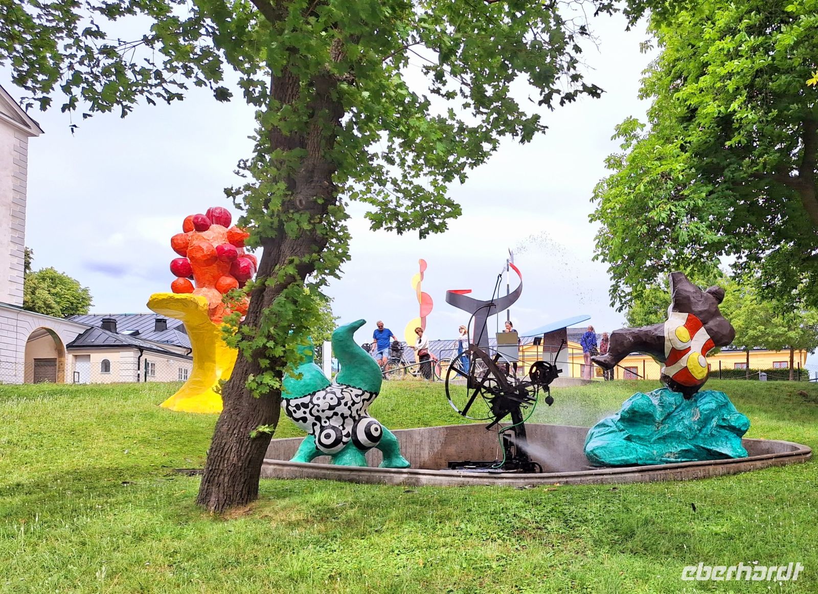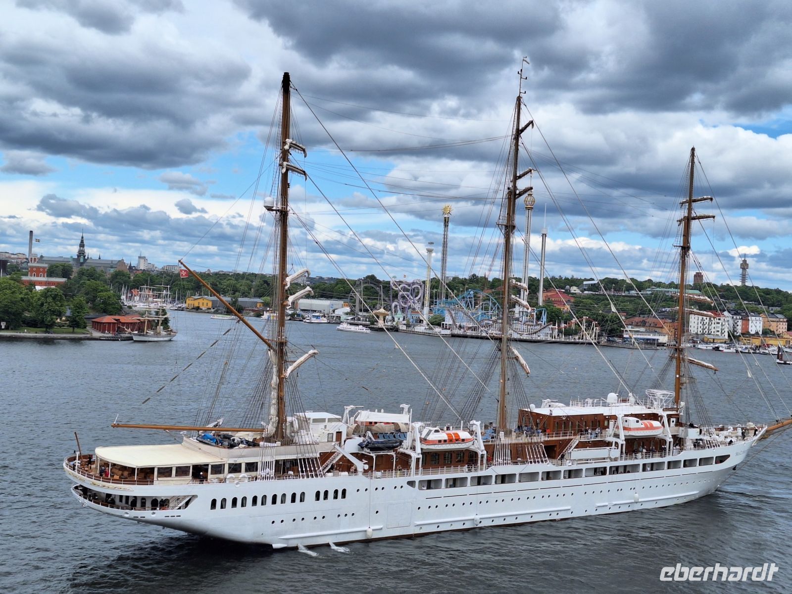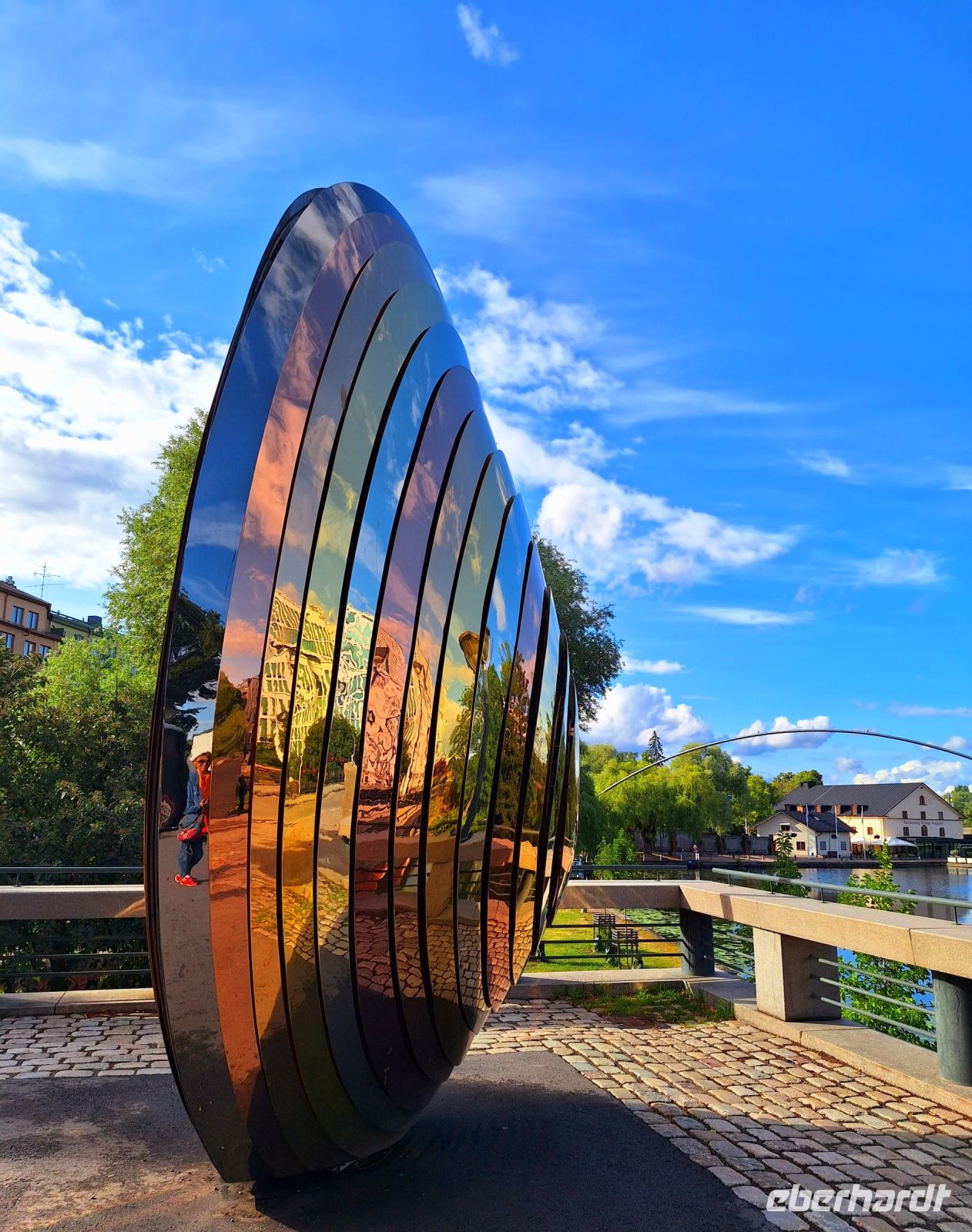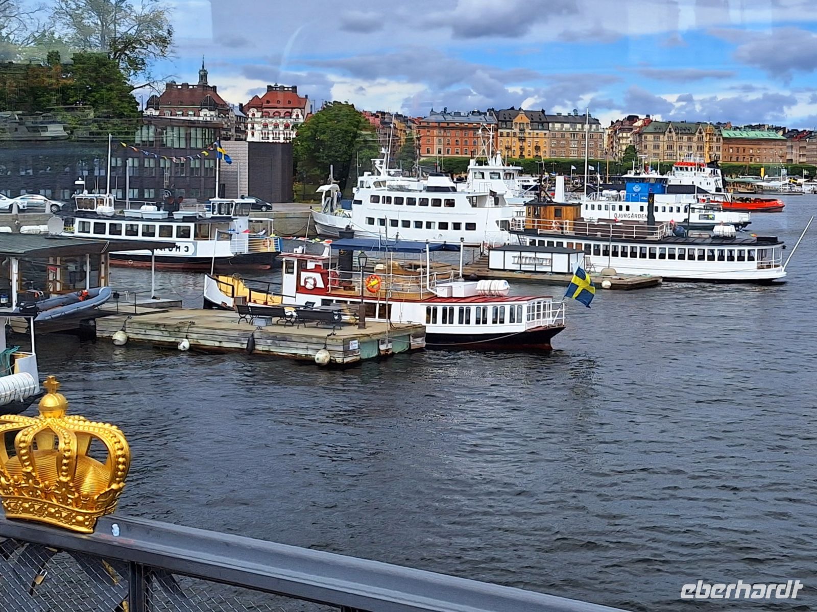 Gut gelaunt treffen wir nun am Obelisk unsere Stockholmer Gästeführerin, die uns in den nächsten beiden Stunden ihre Stadt präsentieren wird. Nach kurzer Einleitung in der Altstadt besteigen wir den Bus und können einige der 14 Inseln, auf denen Stockholm erbaut ist, live erleben. Zum sowieso schon grandiosen Ausblick von Södermalms Fjällgatan stellt sich auch noch ein tolles Segelschiff für uns ins Bild. Wir fahren durch Östermalm zum 1912 erbauten Olympiastadion und zur Museumsinsel Skeppsholmen mit dem Museum für moderne Kunst. Ein paar Objekte, zum Beispiel die bunten Skulpturen von Niki de Saint Phalle, können wir auch im Freien bewundern.