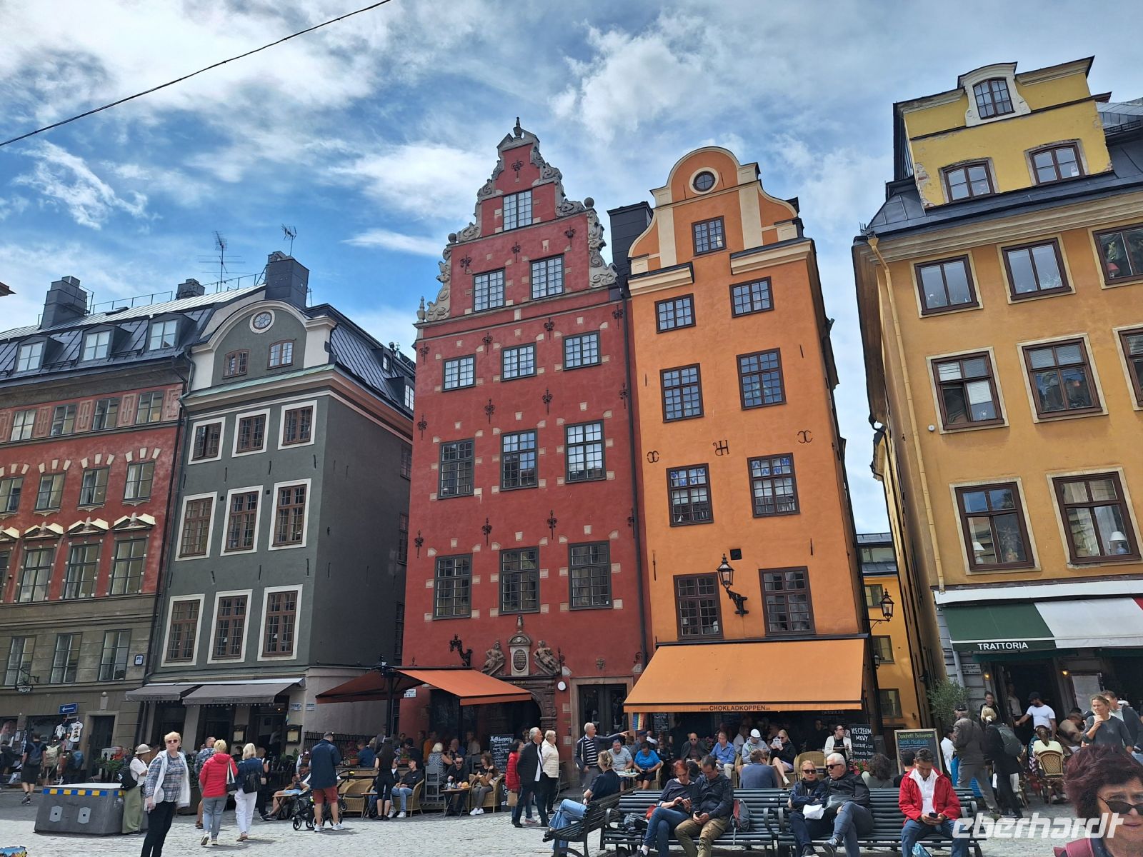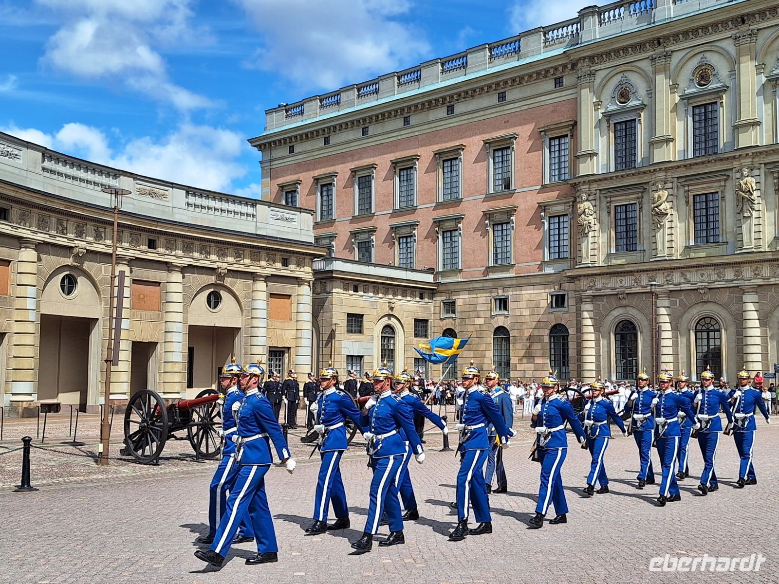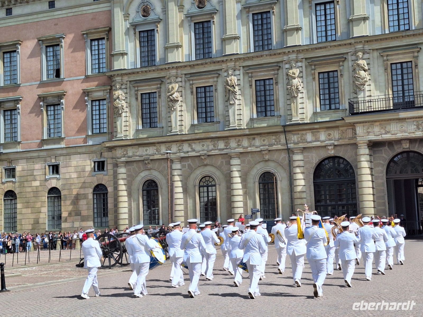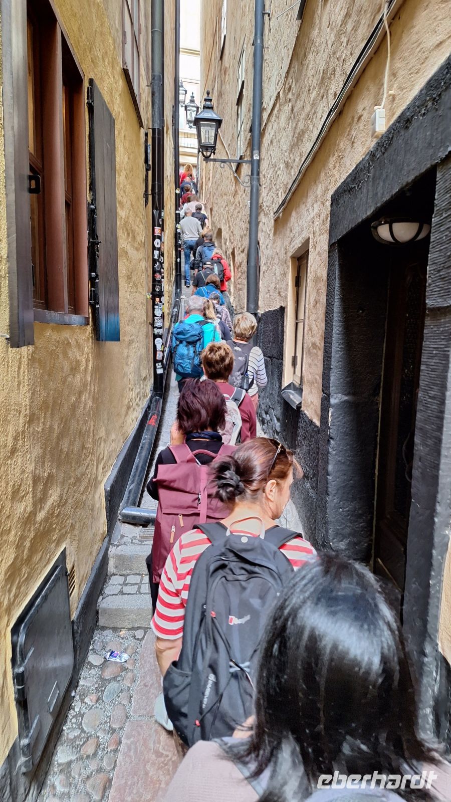 Wir gehen vorbei an der Kunstakademie, über die beliebte Einkaufsstraße Drottninggatan, entdecken das Opernhaus, durchqueren das Riksdagshuset, den Sitz des schwedischen Reichstages und gelangen so in die verwinkelte Altstadt. Hier schlängeln wir uns durch die Touristenmassen und vor allem im Gänsemarsch durch die engste Gasse der Stadt (Mårten Trotzigs gränd). Am Königlichen Schloss mit 605 Zimmern wird es noch belebter. Alle wollen die Wachablösung sehen.