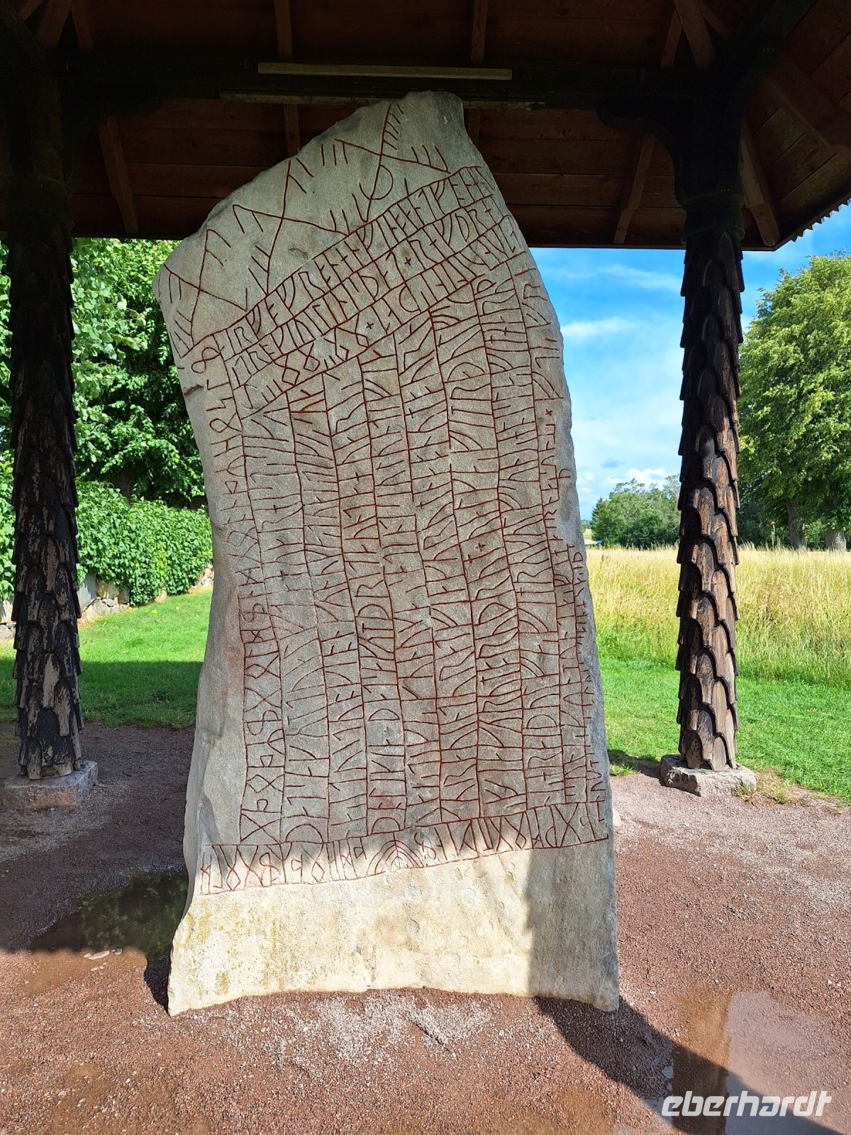 Mit süßen Kostproben in den Taschen fahren wir nun am Vätternsee entlang. Der im 9. Jahrhundert entstandene, etwa 2,5m hohe Runenstein von Rök enthält mit 750 Zeichen die längste bislang bekannte Runeninschrift in Stein. Der Inhalt ist bis heute aufgrund von Geheimzeichen und Wortspielen nicht eindeutig entziffert. Zeit für einen kurzen Fotostopp. Vielleicht kommt ja einer von uns dem Geheimnis auf den Grund?