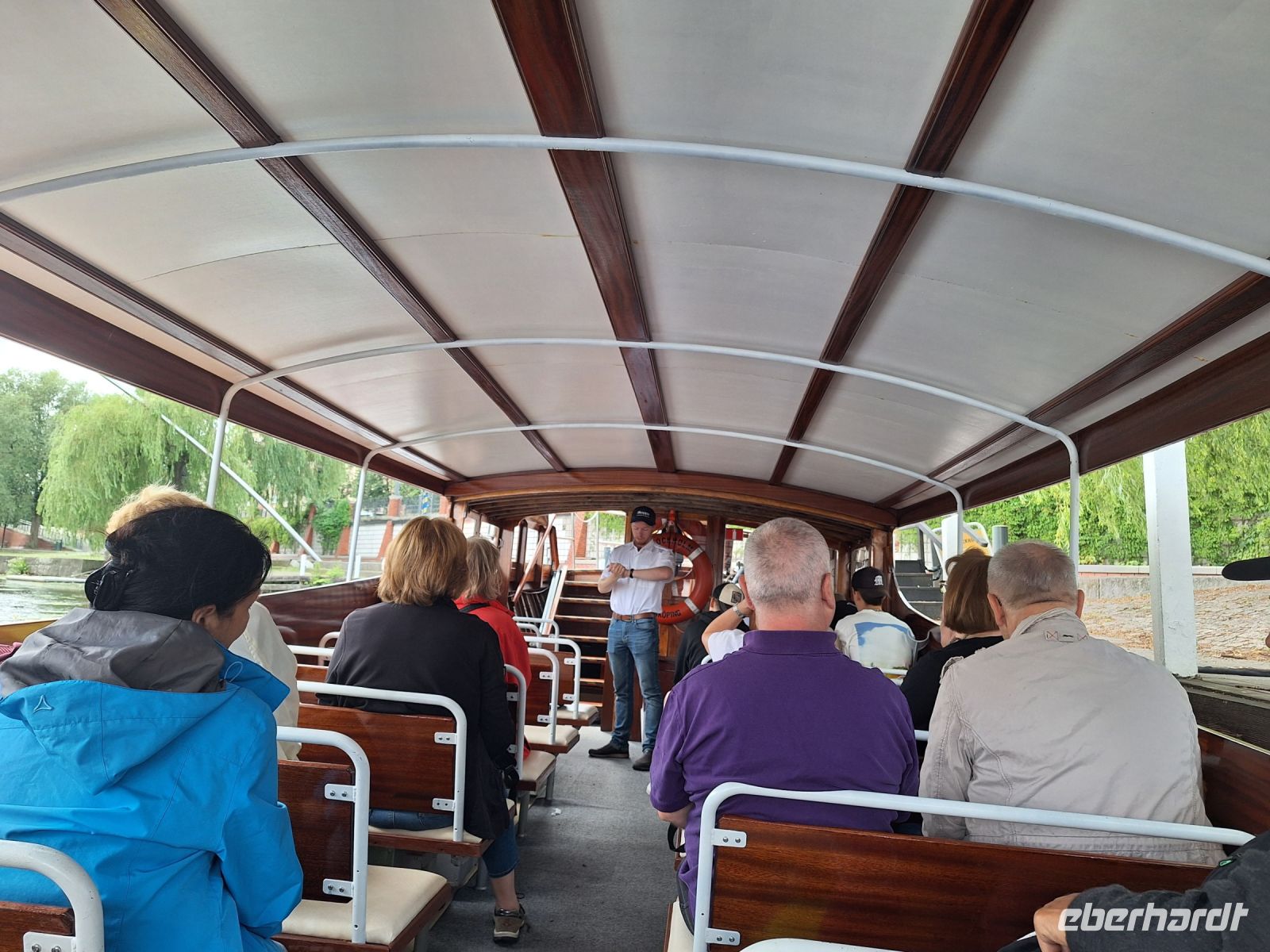Eigentlich war für heute eine Fahrradtour geplant, aber diese Idee stieß nicht auf so viel Begeisterung und auch die Wettervorhersage riet eher davon ab. Aber die Gruppe ist unzertrennlich und so kapern wir uns ein Boot auf dem Kinda Kanal. Natürlich erst am Mittag, wenn der Regen sich verzogen hat. Sogar unser Busfahrer Kurt möchte uns an seinem freien Sonntag begleiten.