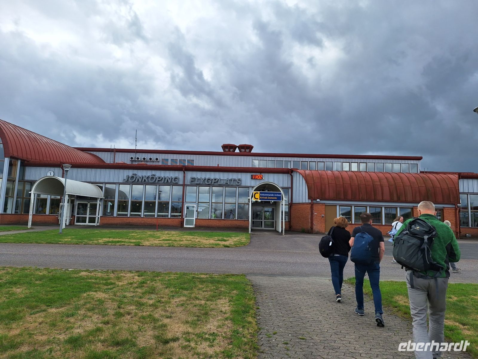 Der Flug nach Jönköping geht schnell vorbei, wir landen pünktlich und werden freundlich empfangen. Wo gibt es schon Zimtschnecken zur Begrüßung? Leider hat das einen Grund: wir erfahren, daß unser Bus sich etwas verspäten wird. Kann ja passieren. Bald stehen wir ganz allein auf dem kleinen „Flygplats“, der heute kein weiteres Flugzeug mehr erwartet. Wir nutzen die Zeit für eine Kennenlernrunde und trinken den Kaffee der kleinen Cafeteria aus. Denn aus der angekündigten halben Stunde werden zwei und sogar dann fast drei Stunden, bis der ersehnte Bus und unser schwedischer Busfahrer Kurt endlich eintreffen.