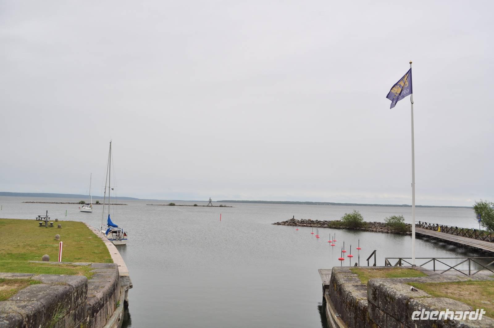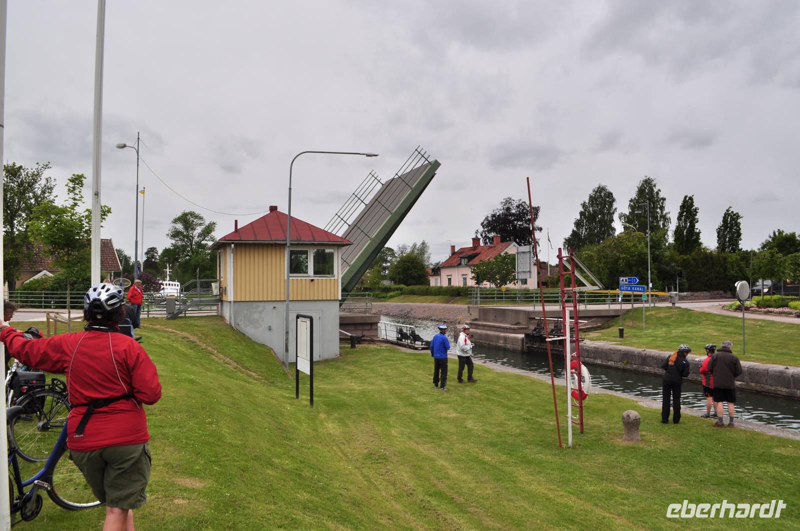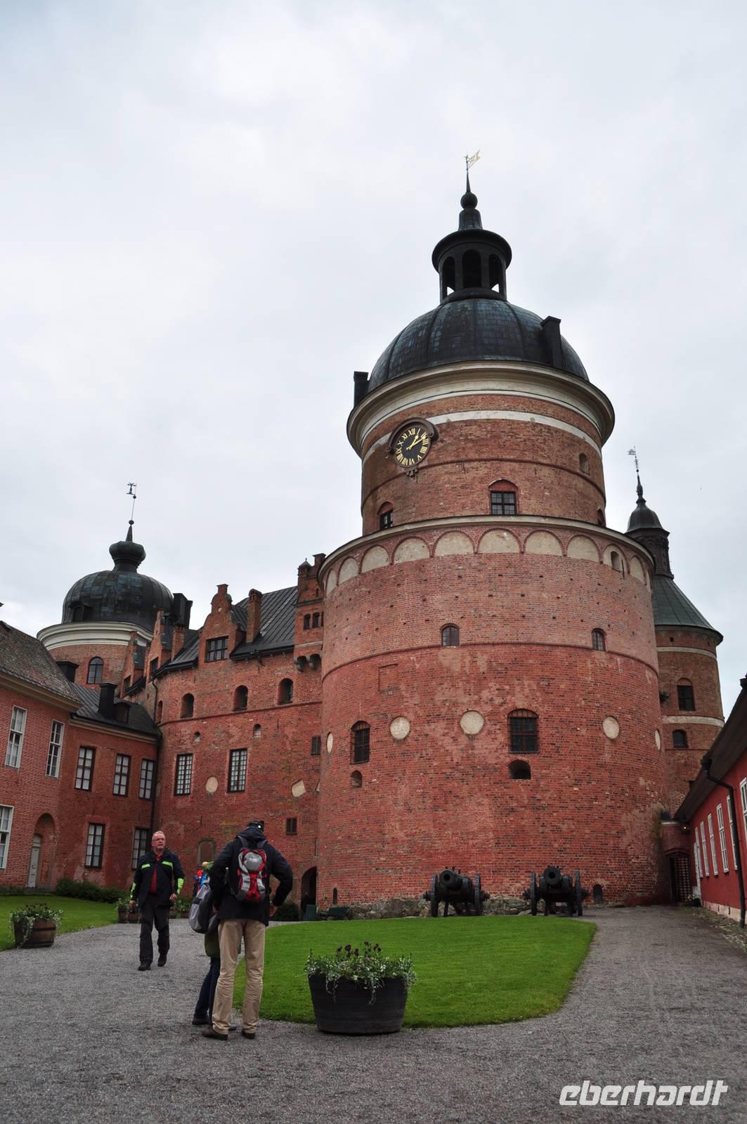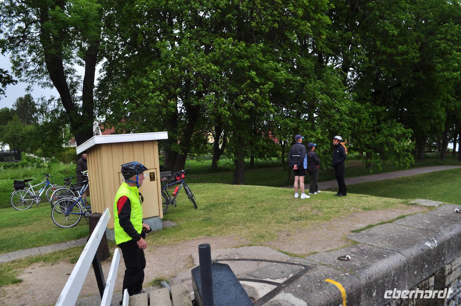 3 m groß. Darüber hinaus gibt es weitere prähistorische Spuren z. B. Hügelgräber. Unsere Strecke führt weiter zum mächtigen Vadstena Slott, ein Vasa Schloss. Nun sind es nur noch wenige Kilometer bis nach Motala, dem Startort unserer Radetappe und Zentrum des Göta Kanals, dem Blauen Band Schwedens. Interessiert beobachten wir das Schleusen einer Jacht an der Schleuse Borenshult mit ihren fünf Schleusenkammern. Von hier starten wir zu unserer Radtour. Über Borensberg geht es zur 7-Kammer-Schleuse von Berg. Nach einer Kaffeepause hinüber zum Kloster Vreta, dem ältesten in Schweden. Trotz einsetzendem Regen entscheidet sich ein hartnäckiger Kern weiter mit mir bis nach Linköping zu radeln. In Gamla Linköping beenden wir die heutige Radetappe. Dieses Freilichtmuseum ist in jedem Fall eine eigene Reise wert, heute allerdings geschlossen.