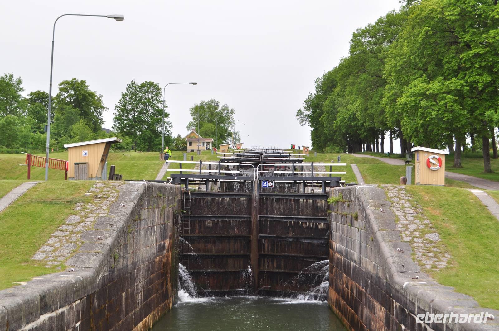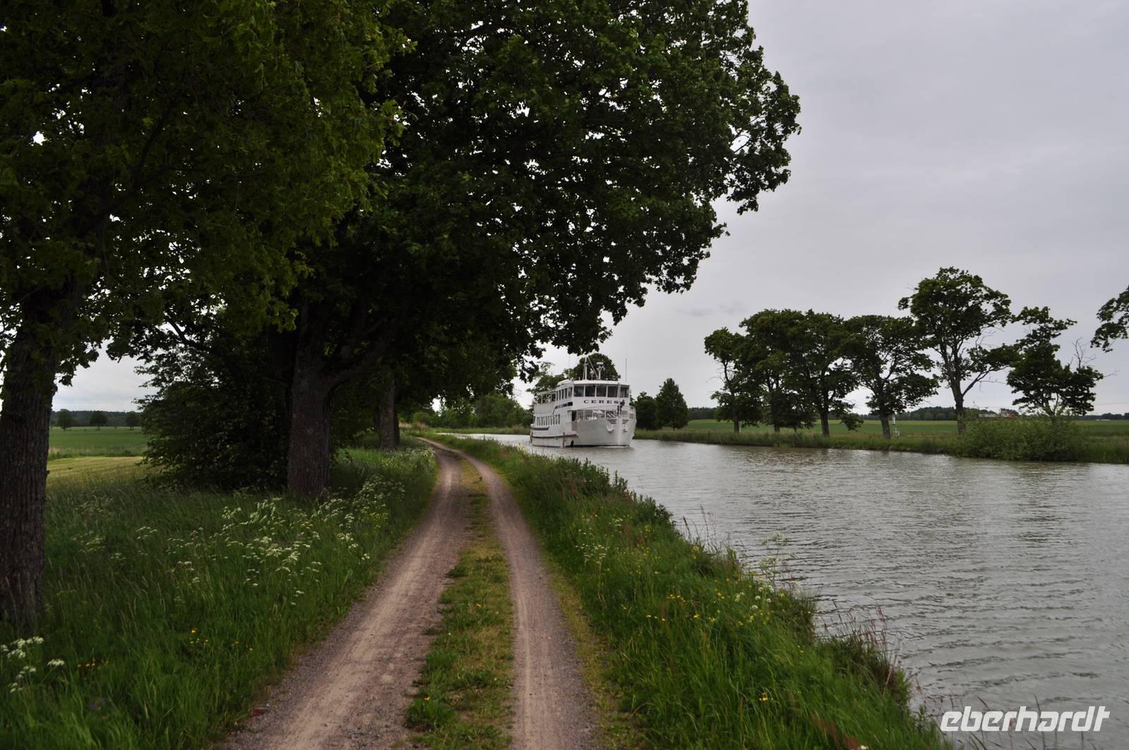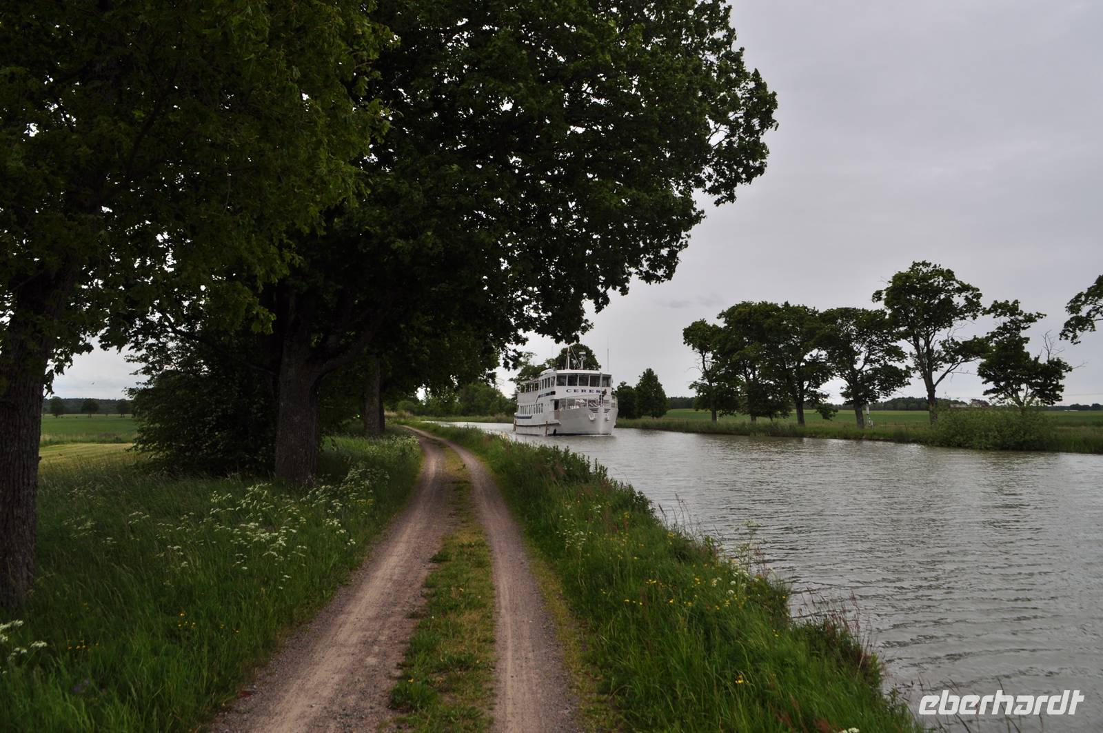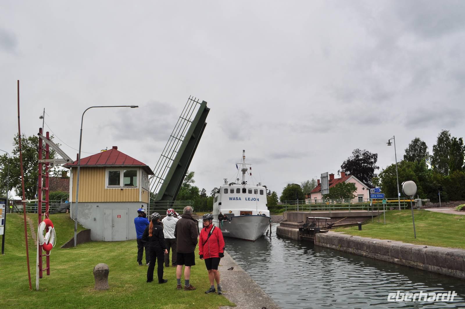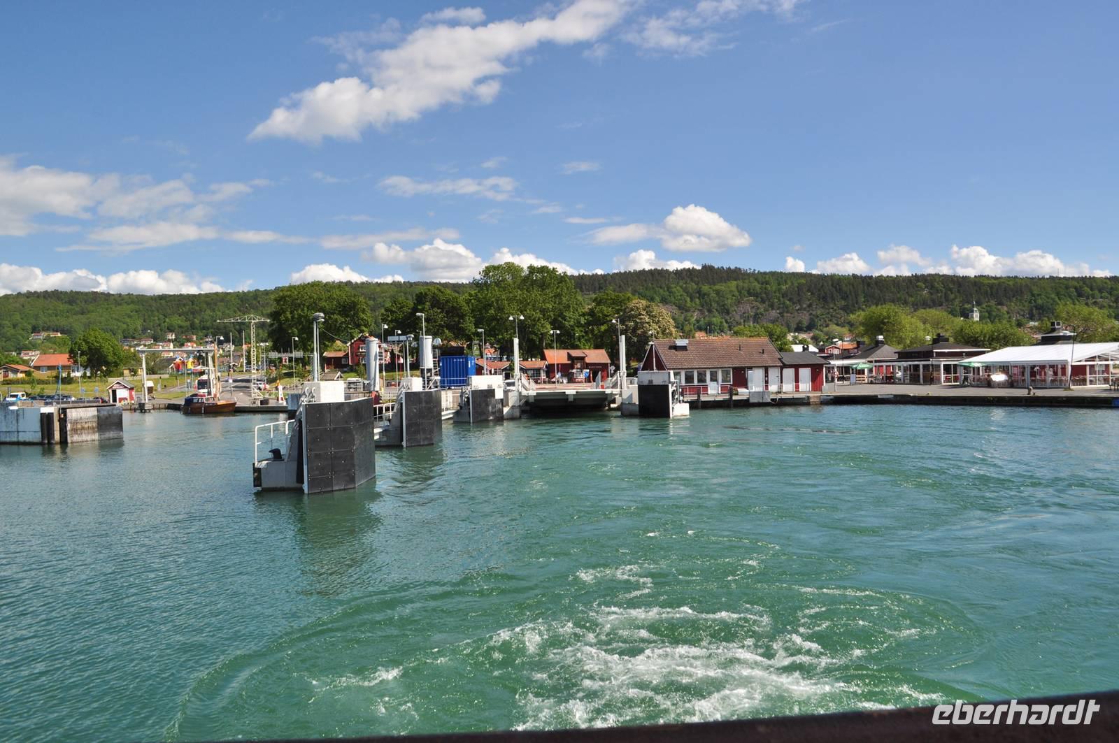 3 m groß. Darüber hinaus gibt es weitere prähistorische Spuren z. B. Hügelgräber. Unsere Strecke führt weiter zum mächtigen Vadstena Slott, ein Vasa Schloss. Nun sind es nur noch wenige Kilometer bis nach Motala, dem Startort unserer Radetappe und Zentrum des Göta Kanals, dem Blauen Band Schwedens. Interessiert beobachten wir das Schleusen einer Jacht an der Schleuse Borenshult mit ihren fünf Schleusenkammern. Von hier starten wir zu unserer Radtour. Über Borensberg geht es zur 7-Kammer-Schleuse von Berg. Nach einer Kaffeepause hinüber zum Kloster Vreta, dem ältesten in Schweden. Trotz einsetzendem Regen entscheidet sich ein hartnäckiger Kern weiter mit mir bis nach Linköping zu radeln. In Gamla Linköping beenden wir die heutige Radetappe. Dieses Freilichtmuseum ist in jedem Fall eine eigene Reise wert, heute allerdings geschlossen.