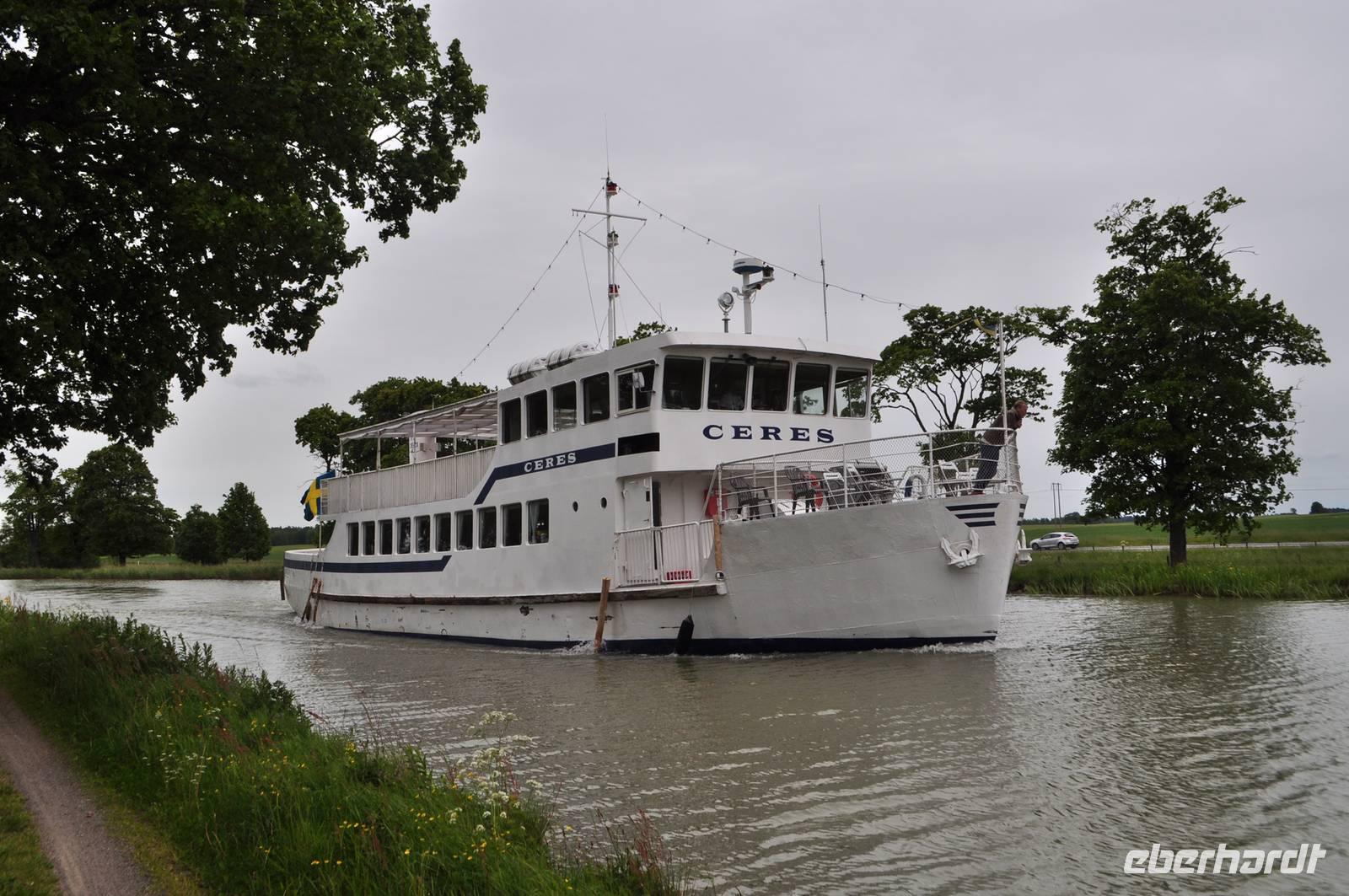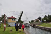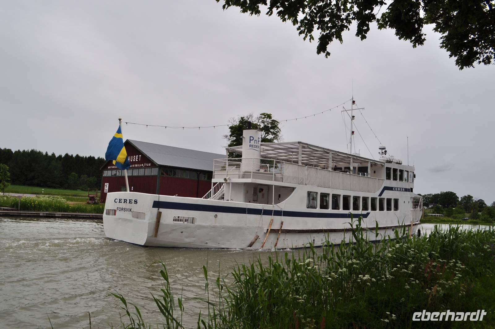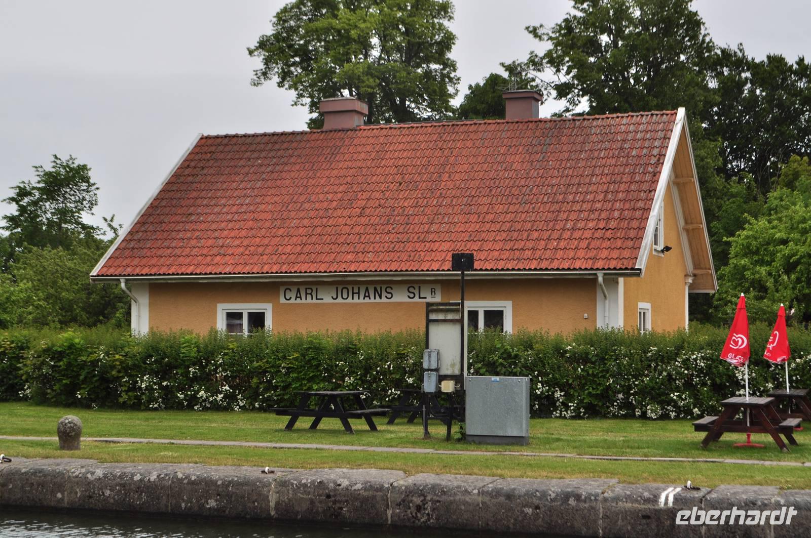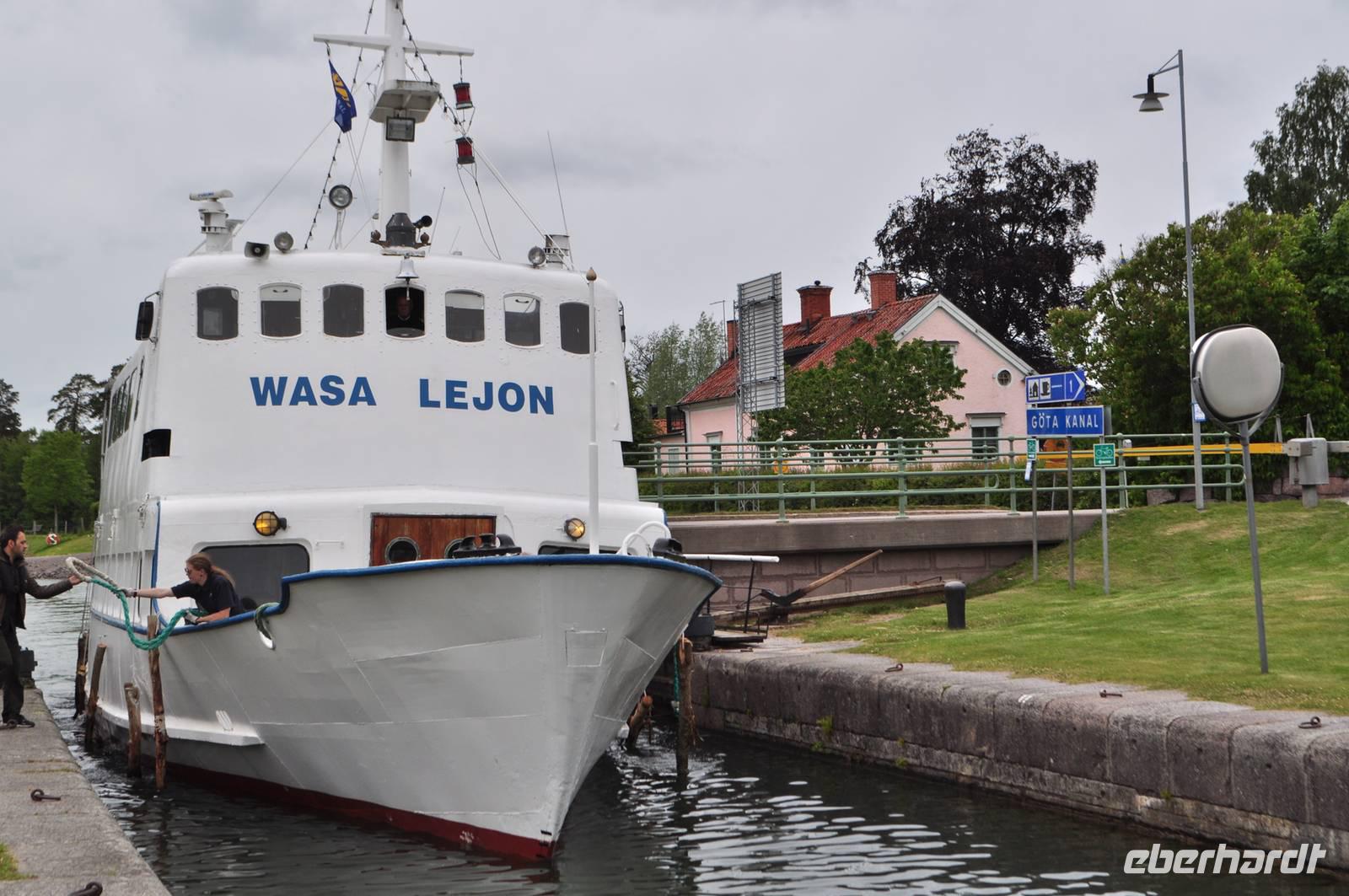 3 m groß. Darüber hinaus gibt es weitere prähistorische Spuren z. B. Hügelgräber. Unsere Strecke führt weiter zum mächtigen Vadstena Slott, ein Vasa Schloss. Nun sind es nur noch wenige Kilometer bis nach Motala, dem Startort unserer Radetappe und Zentrum des Göta Kanals, dem Blauen Band Schwedens. Interessiert beobachten wir das Schleusen einer Jacht an der Schleuse Borenshult mit ihren fünf Schleusenkammern. Von hier starten wir zu unserer Radtour. Über Borensberg geht es zur 7-Kammer-Schleuse von Berg. Nach einer Kaffeepause hinüber zum Kloster Vreta, dem ältesten in Schweden. Trotz einsetzendem Regen entscheidet sich ein hartnäckiger Kern weiter mit mir bis nach Linköping zu radeln. In Gamla Linköping beenden wir die heutige Radetappe. Dieses Freilichtmuseum ist in jedem Fall eine eigene Reise wert, heute allerdings geschlossen.