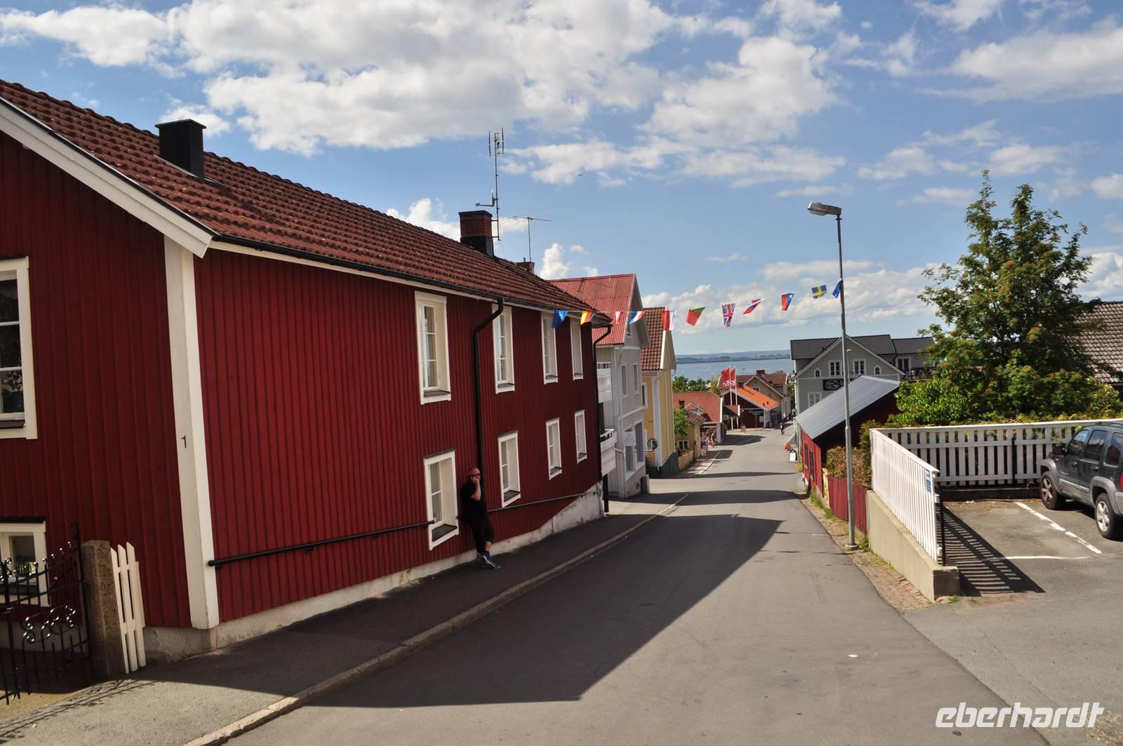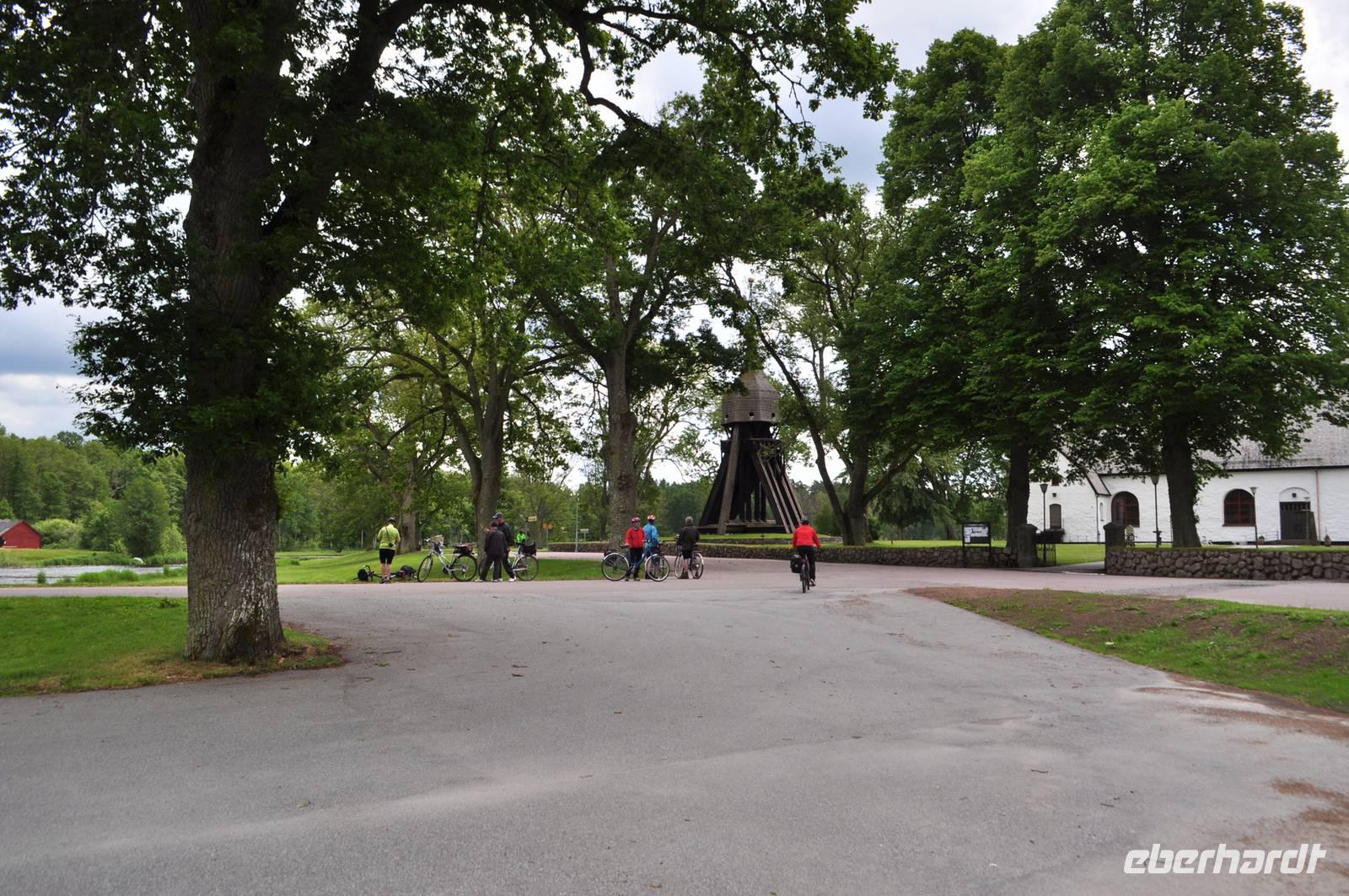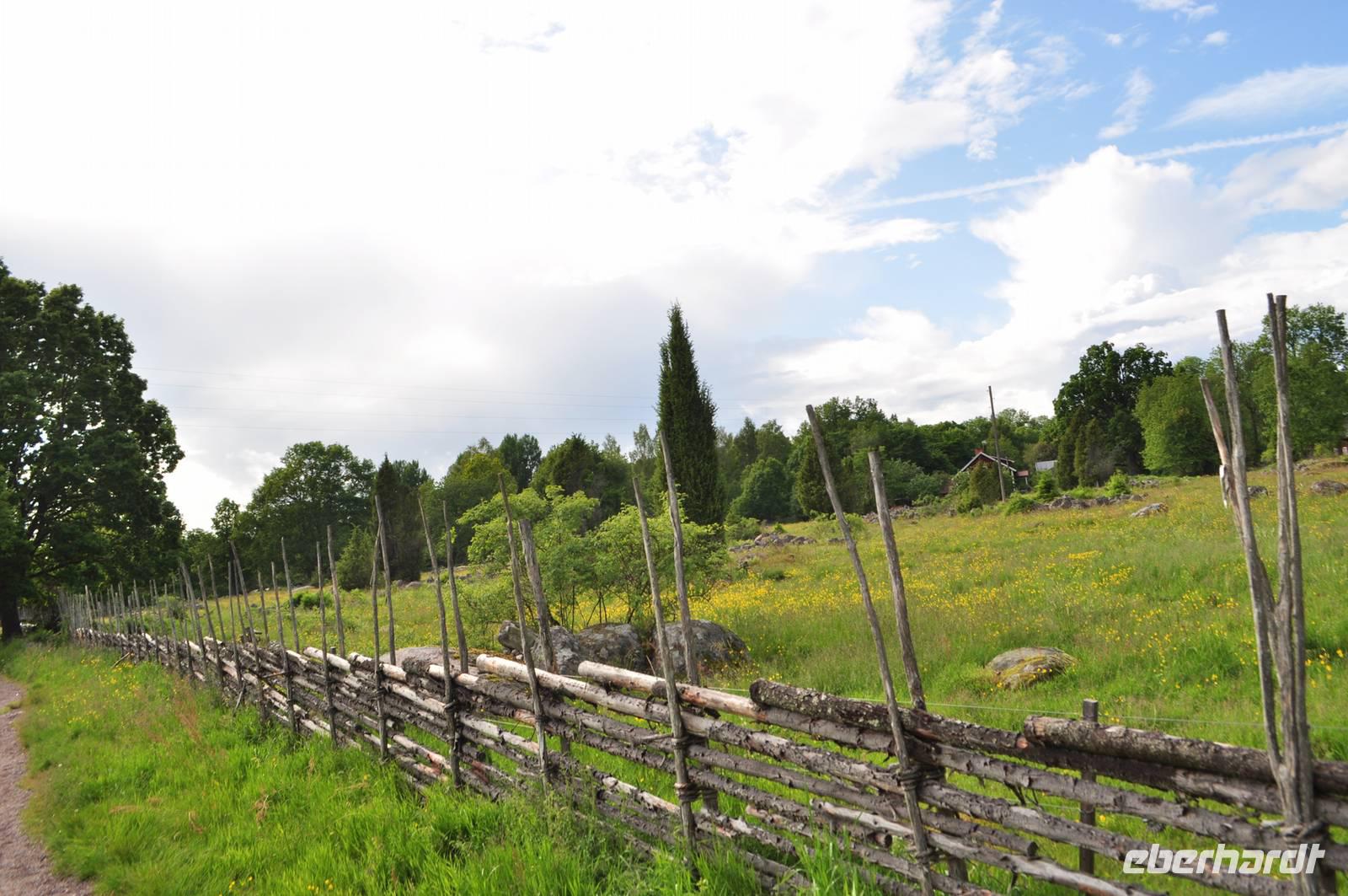 Am Schloss startet auch unsere Radtour. Zunächst geht es entlang der Uferstraße des Mälaren in Richtung Friedhof. Hier liegt Kurt Tucholsky begraben. Anschließend geht es weiter in Richtung Stallarholmen. Die Landschaft ist leicht hügelig und wechselt zwischen dichten Waldflächen, Weiden und Ackerflächen. Dazwischen stehen kleine schwedische Höfe, hier mal ein kleines Sägewerk, dort ein anderer kleiner Betrieb. Unsere Etappe endet in Stallarholmen am Mälaren.