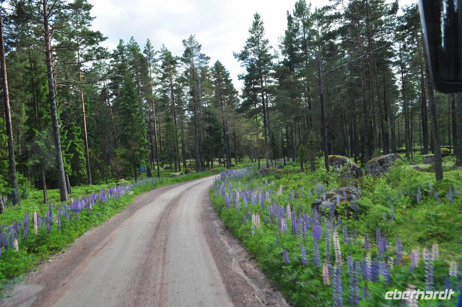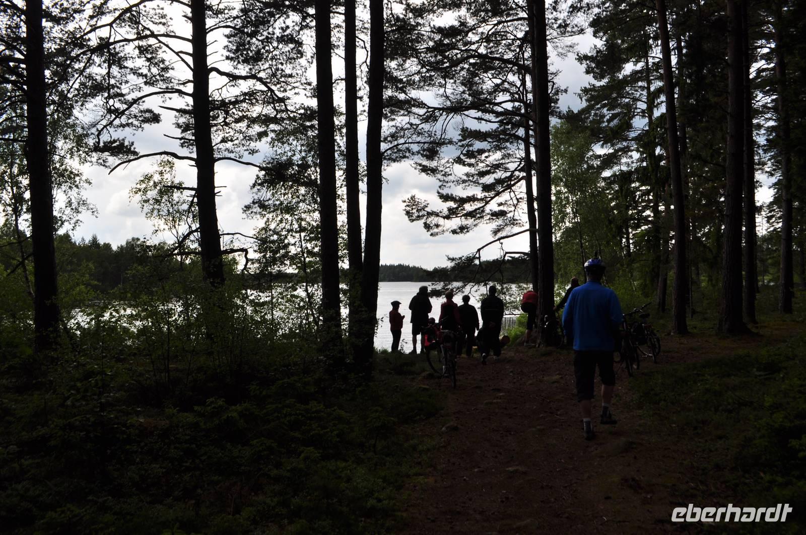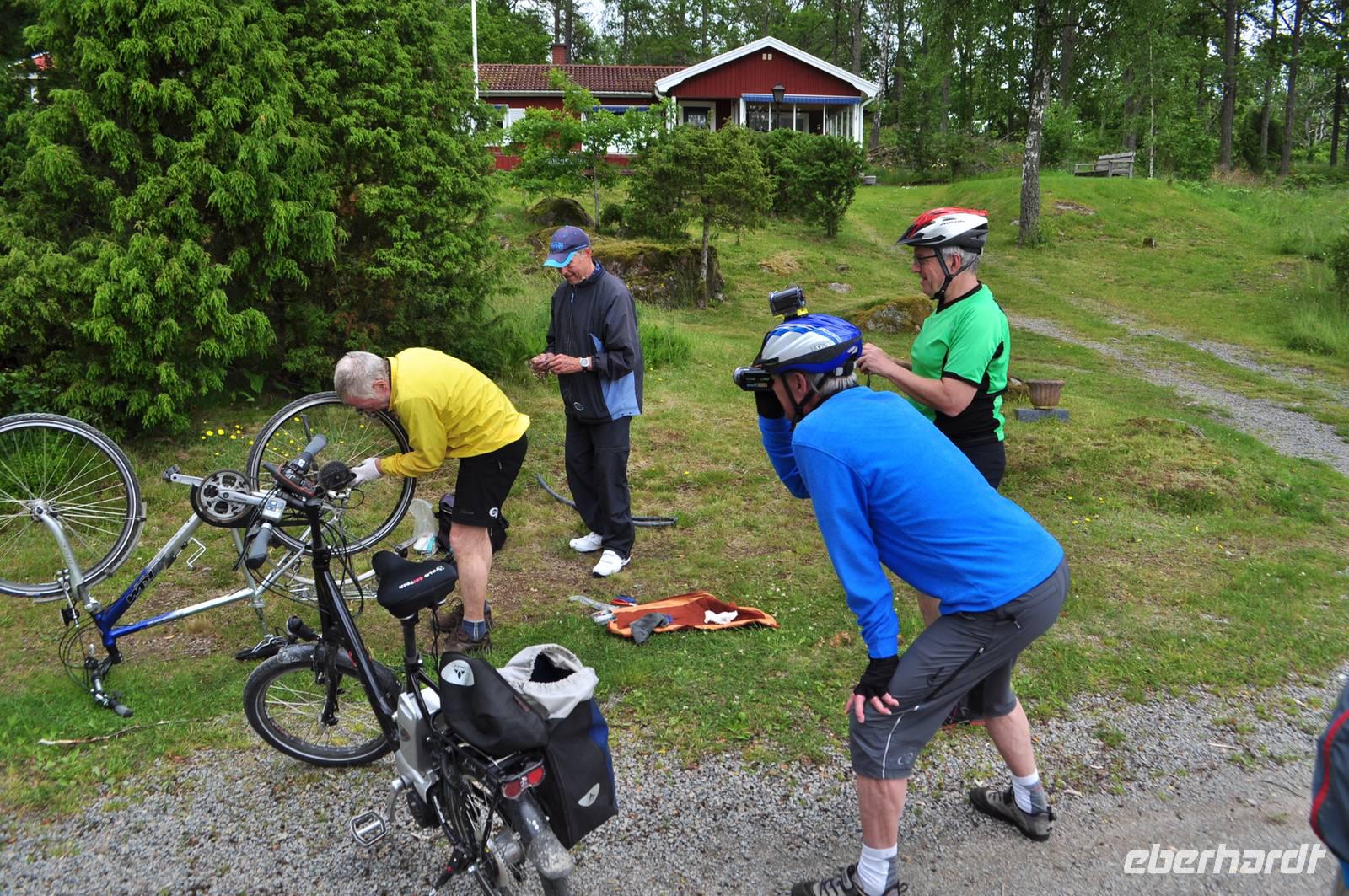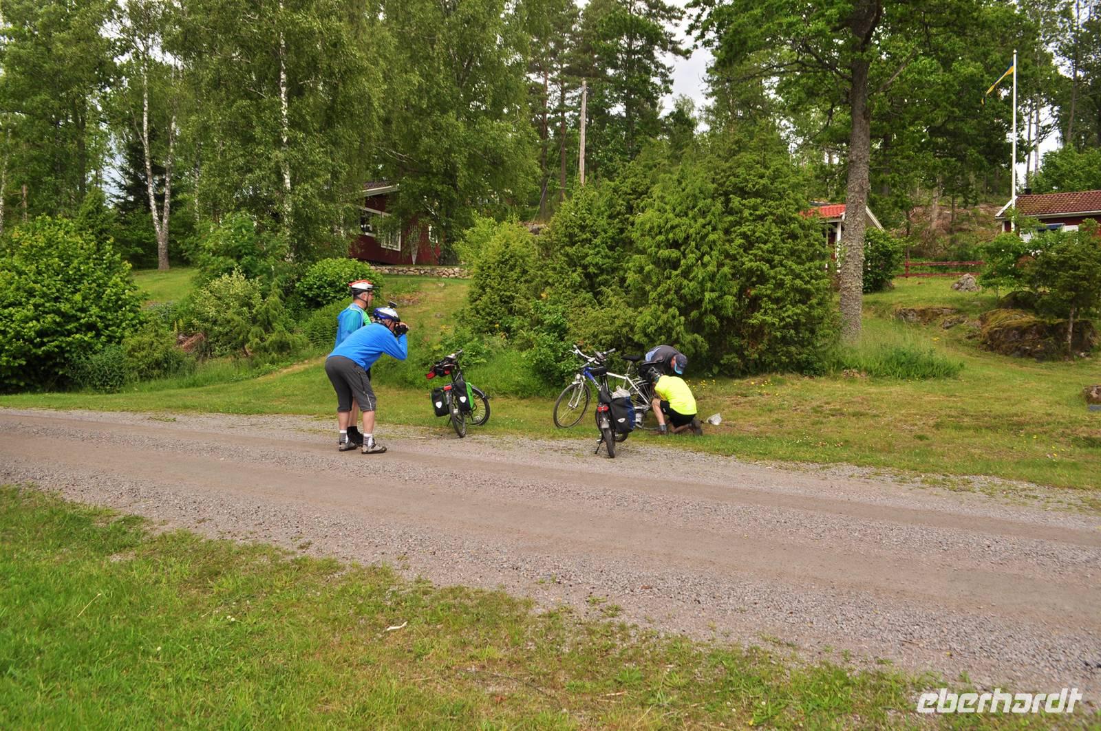Südlich vom Elchpark starten wir zu unserer letzten Runde rund um den Törn. Es ist trocken, alles läuft gut. Wäre da nicht plötzlich am letzten Tag diese Radpanne. Ein platter Reifen. Reinhard hilft, versucht zu reparieren entscheidet dann aber den Schlauch zu wechseln. Danach können wir unsere Fahrt fortsetzen.