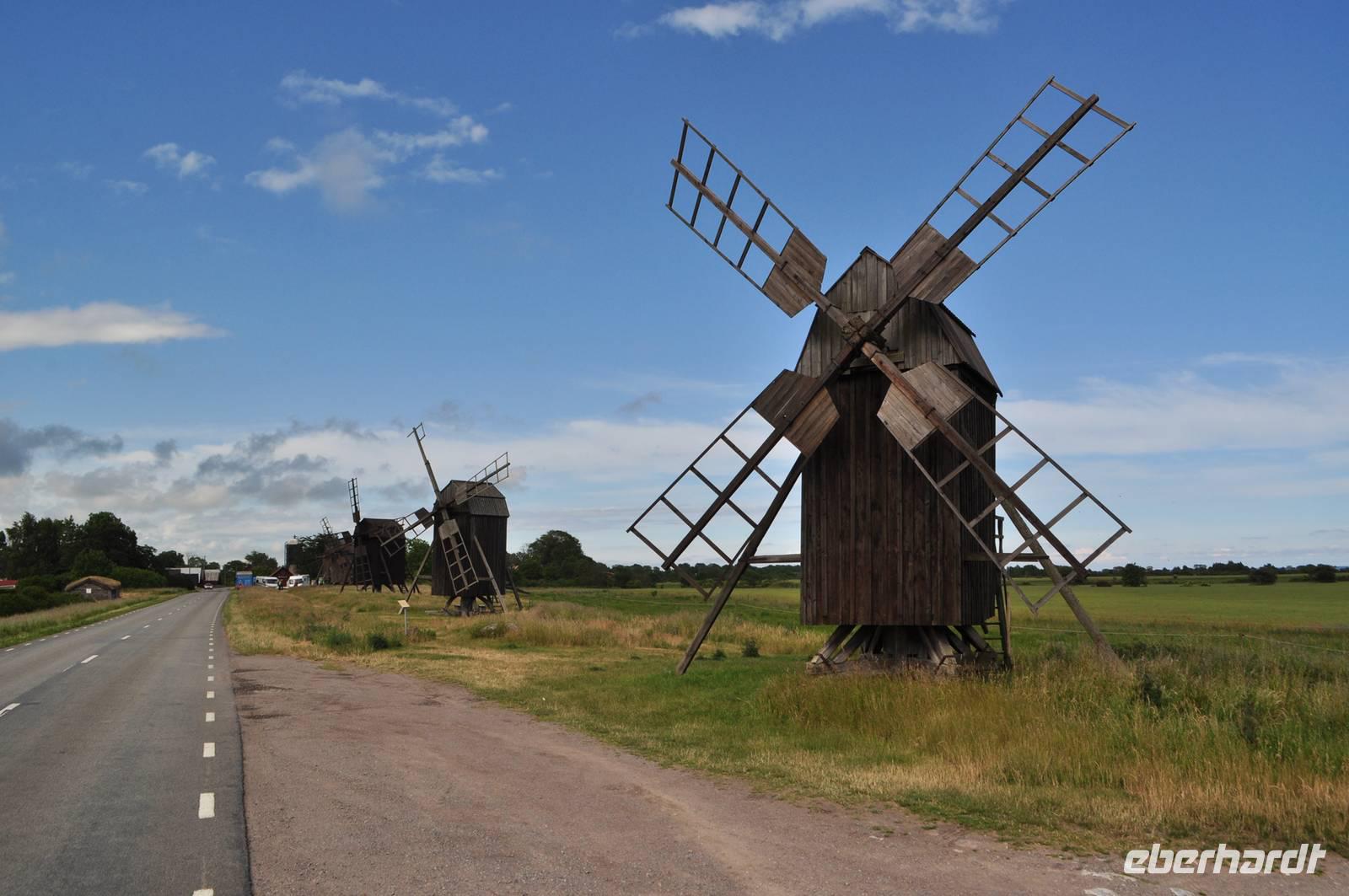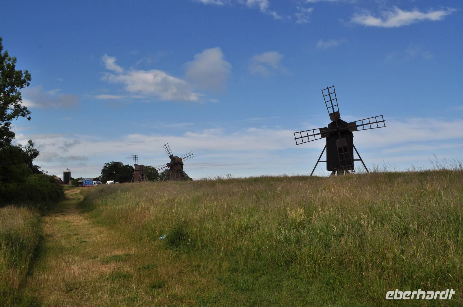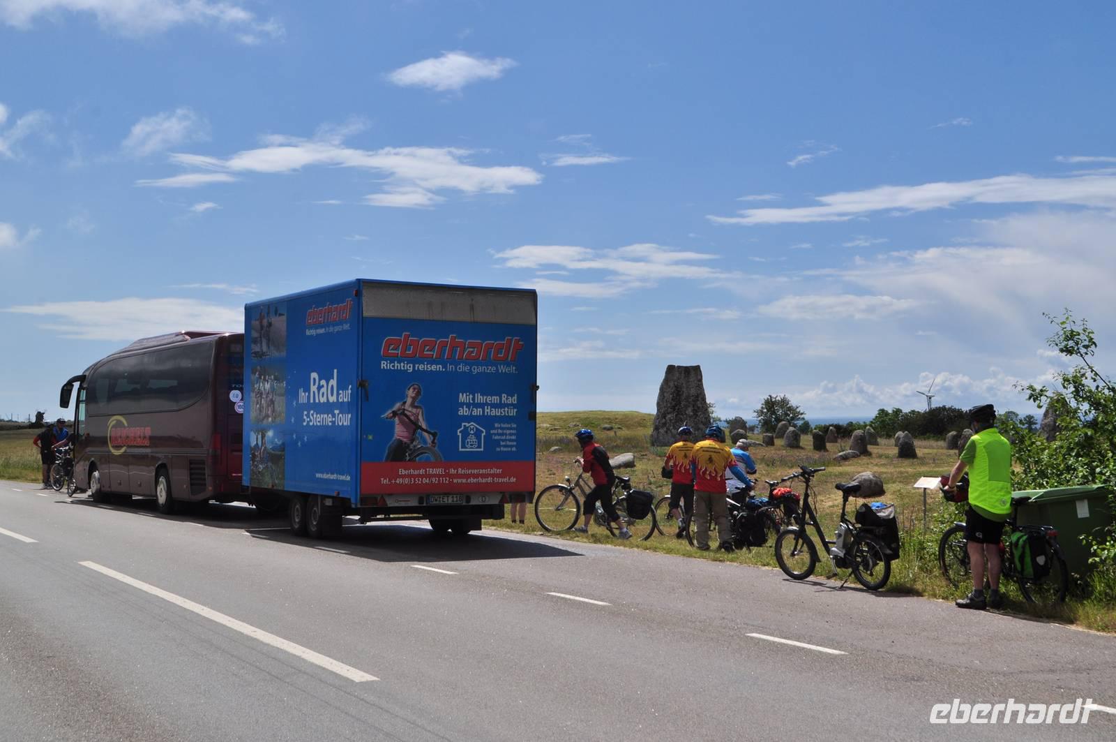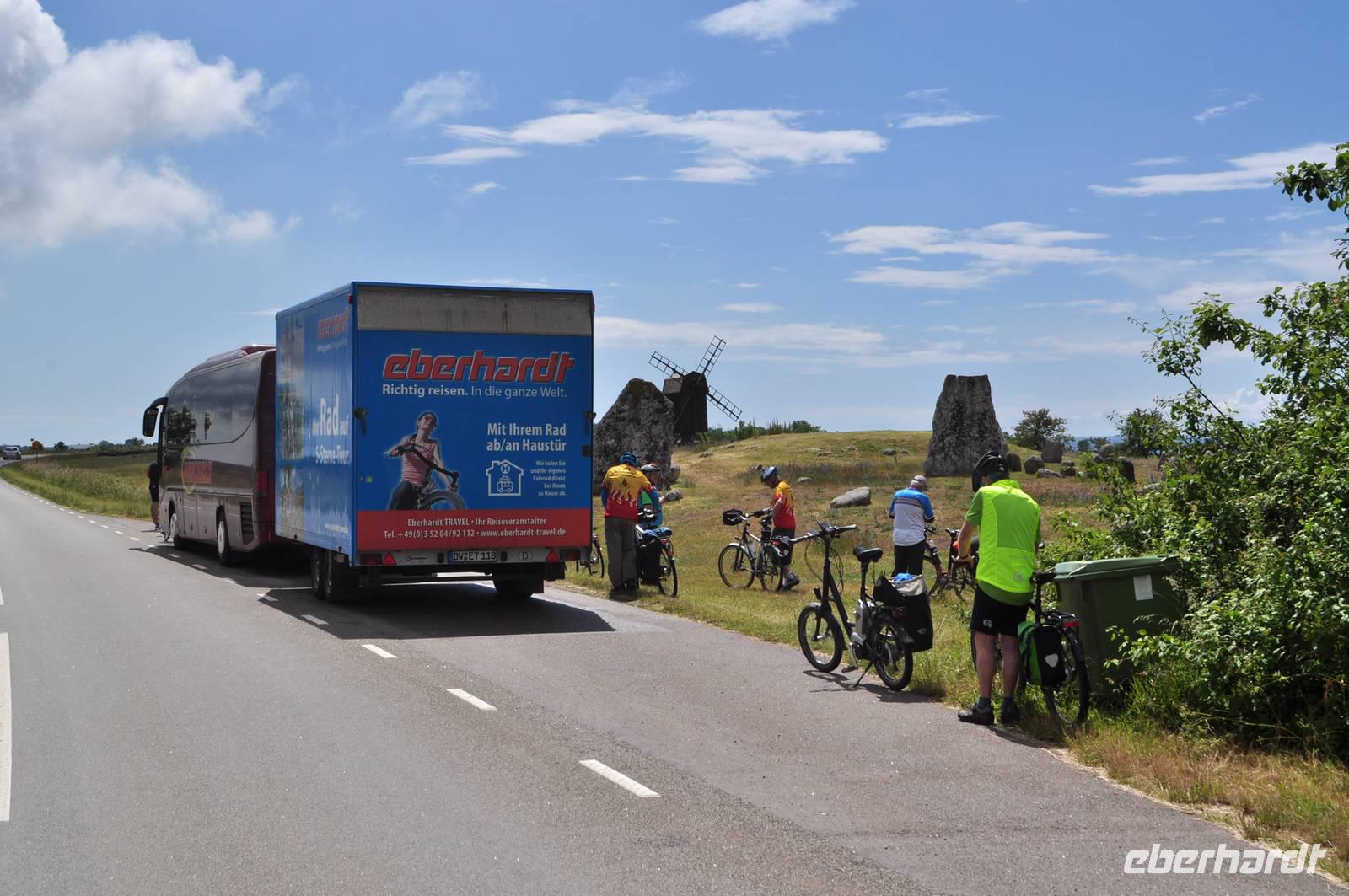 Das Wetter sieht stabil aus, wir entscheiden ohne Umschweife sofort los zu radeln. Wir fahren über die Ölandsbrücke bis nach Färjestaden. Dort wechseln wir auf die Räder. Vorbei an Runenstein geht es durch die Agrarlandschaft Ölands immer wieder vorbei an Höfen, Äckern, Weiden und natürlich Windmühlen. Die Agrarregion Öland wurde sogar zum UNESCO Weltkulturerbe erklärt. Am Steinkreis von Gettlinge machen wir Mittagspause, Ingo ist mit dem Bus da und hat bereits die Mittagsverpflegung vorbereitet. Aufgrund des guten Wetters und dem geringen Wind, entscheiden wir uns über das Alvaret auf die andere Inselseite zu fahren. Normalerweise ein schwieriges Unterfangen, da man schutzlos dem Wind ausgeliefert ist und wie in unserem Fall auch noch gegen die Windrichtung. Jetzt scheint die Sonne, Wind ist heute nicht vorhanden. Ingo fährt voraus und nimmt uns auf der anderen Seite auf. Wir radeln an weiteren Gräberfeldern vorbei und an Mittsommerstangen und vielen Windmühlen. Fotostopp machen wir auch nochmal an der berühmten Mühlenreihe von Lerkaka, das berühmteste Motiv Ölands.